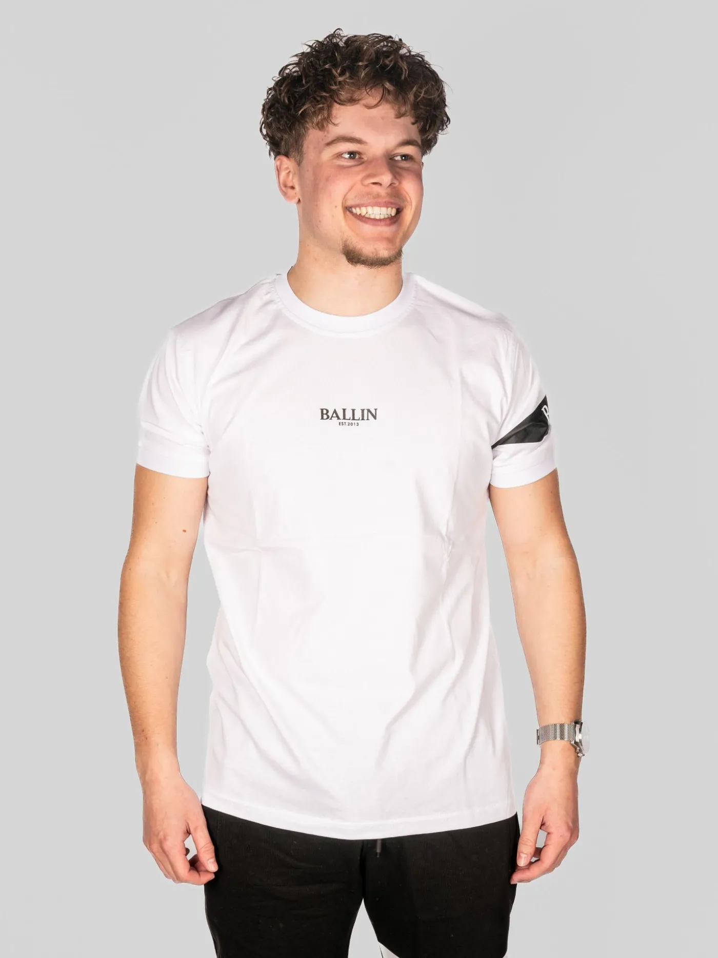 Basic wit T-shirt van het merk Ballin voor heren. Dit item heeft een ronde hals, korte mouwen en het merklogo op de borst. Verder heeft hij op de mouw nog een zwart merklogo.