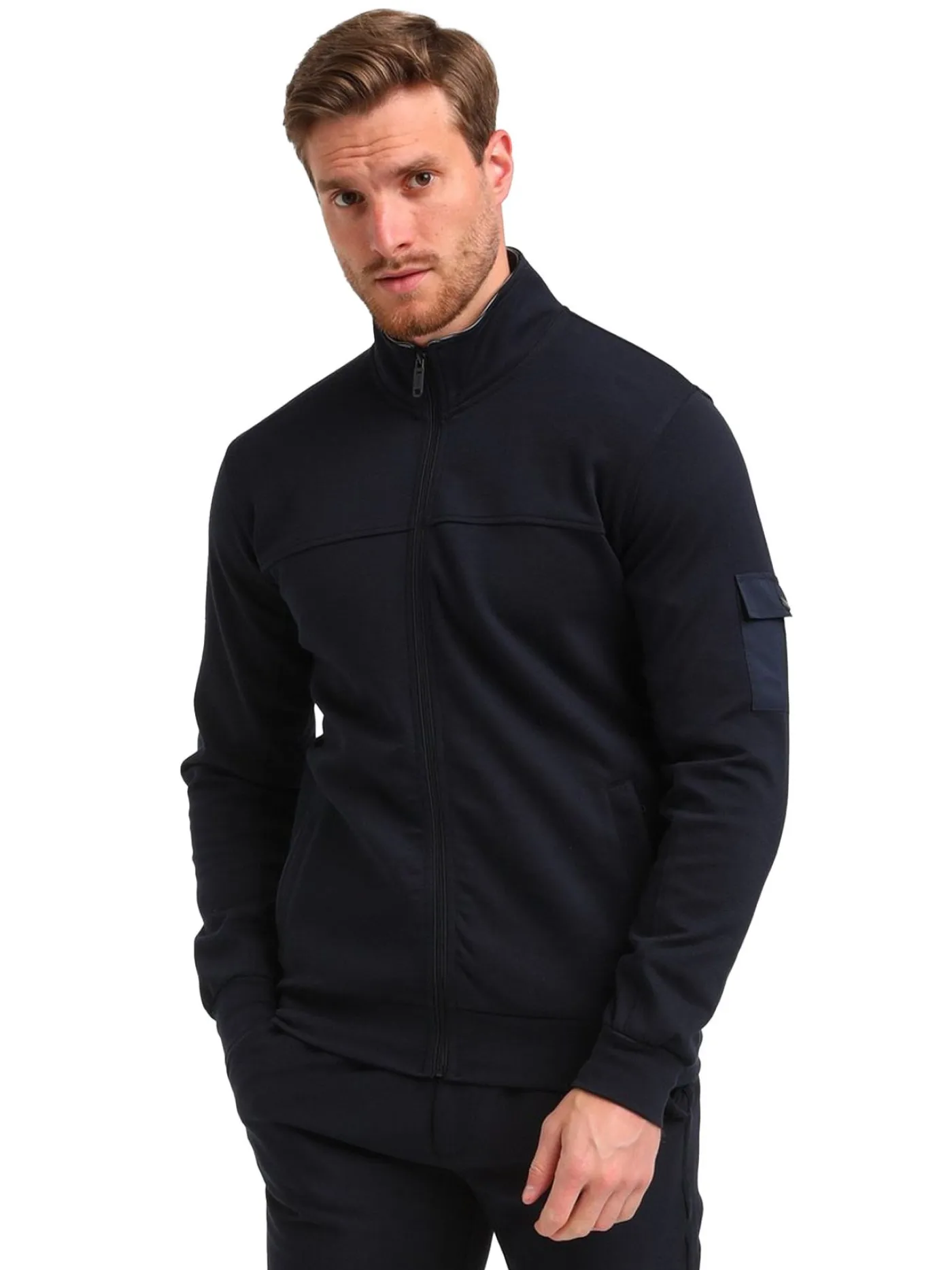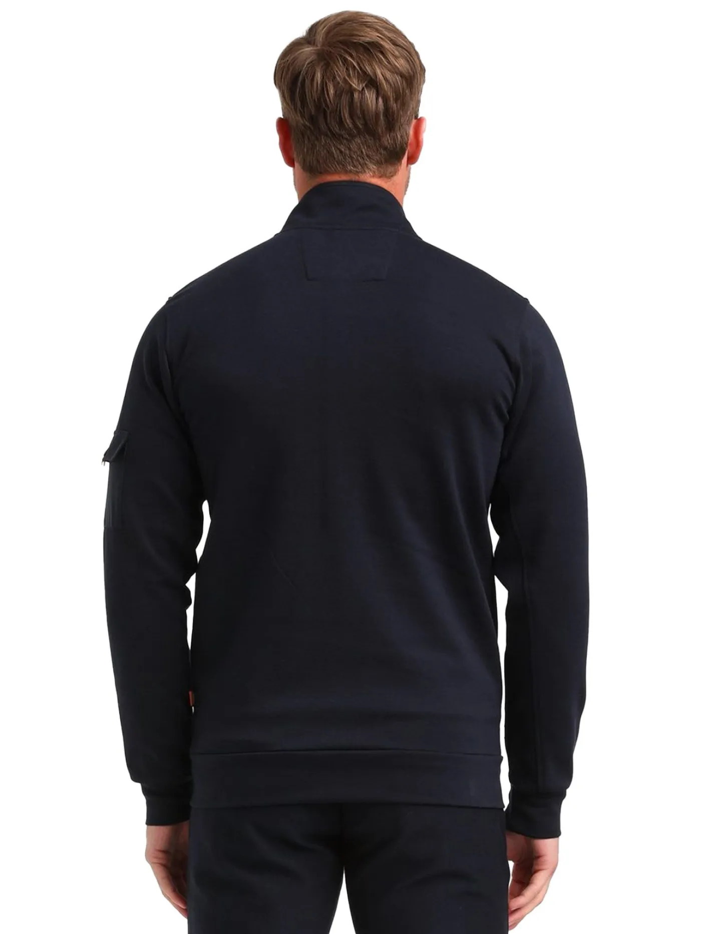 Donker blauwe vest met rits van het merkGabbiano met een colletje. Op de mouw zit een handige zak. leuk te combineren met jeans en sneakers.