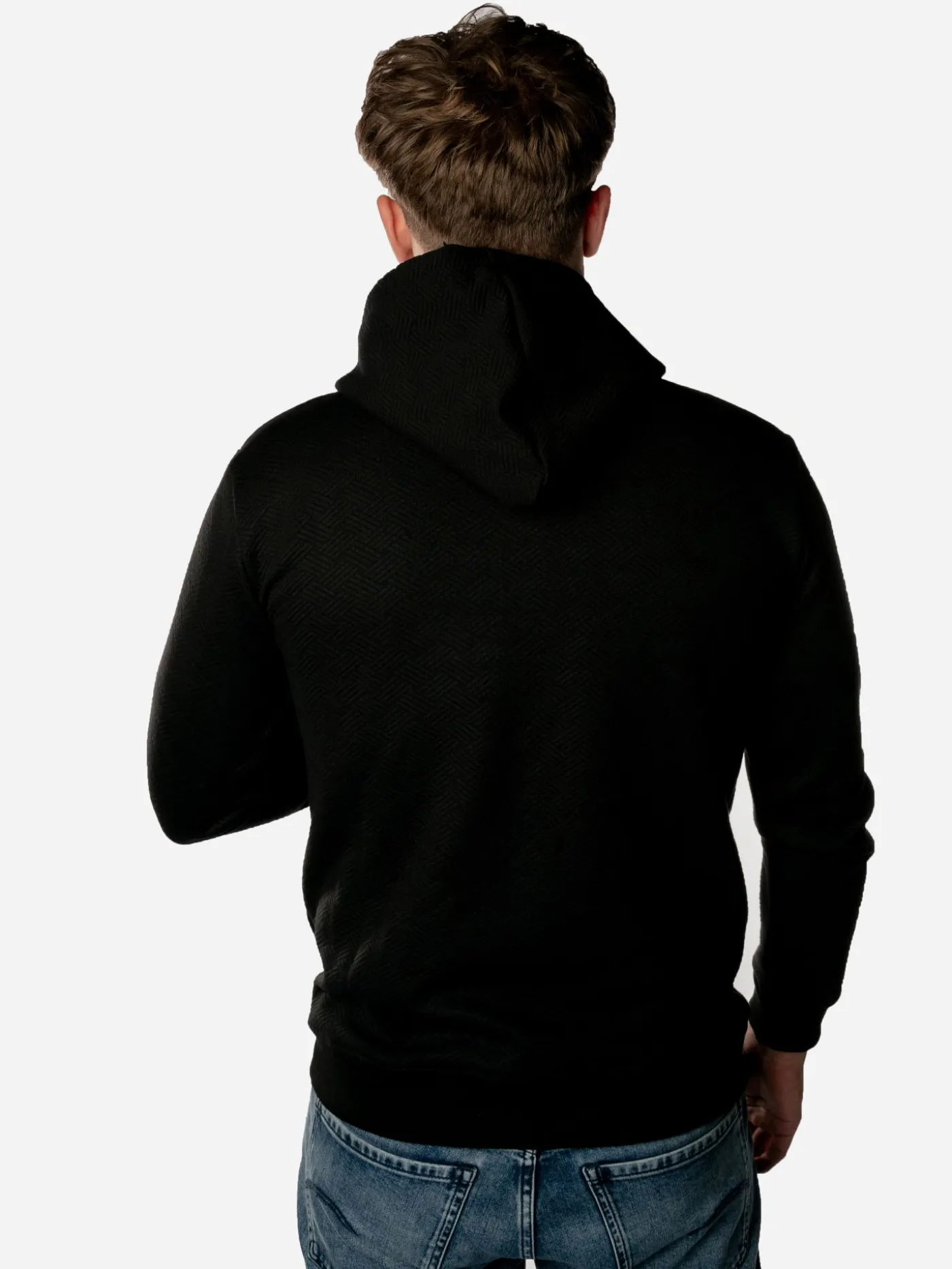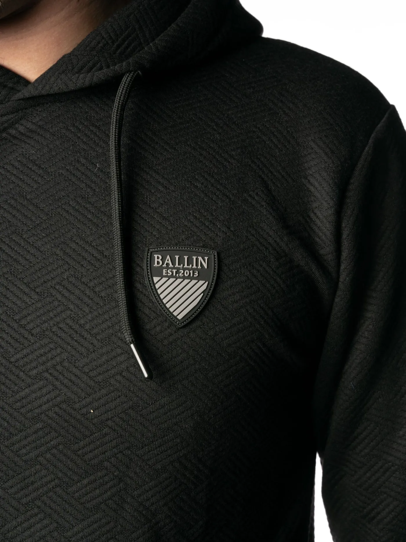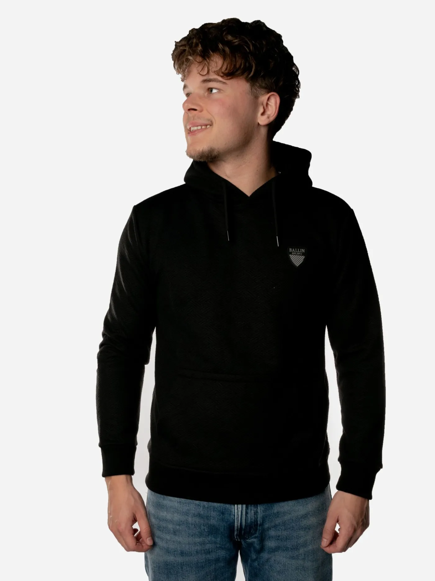 Zwarte hoodie van het merk Ballin. In de stof zit een subtiel patroon verwerkt. Op de voorkant van de hoodie bevindt zicht het logo en een buidelzak. Combineer deze hoodie met jeans en sneakers voor een casual fit.
