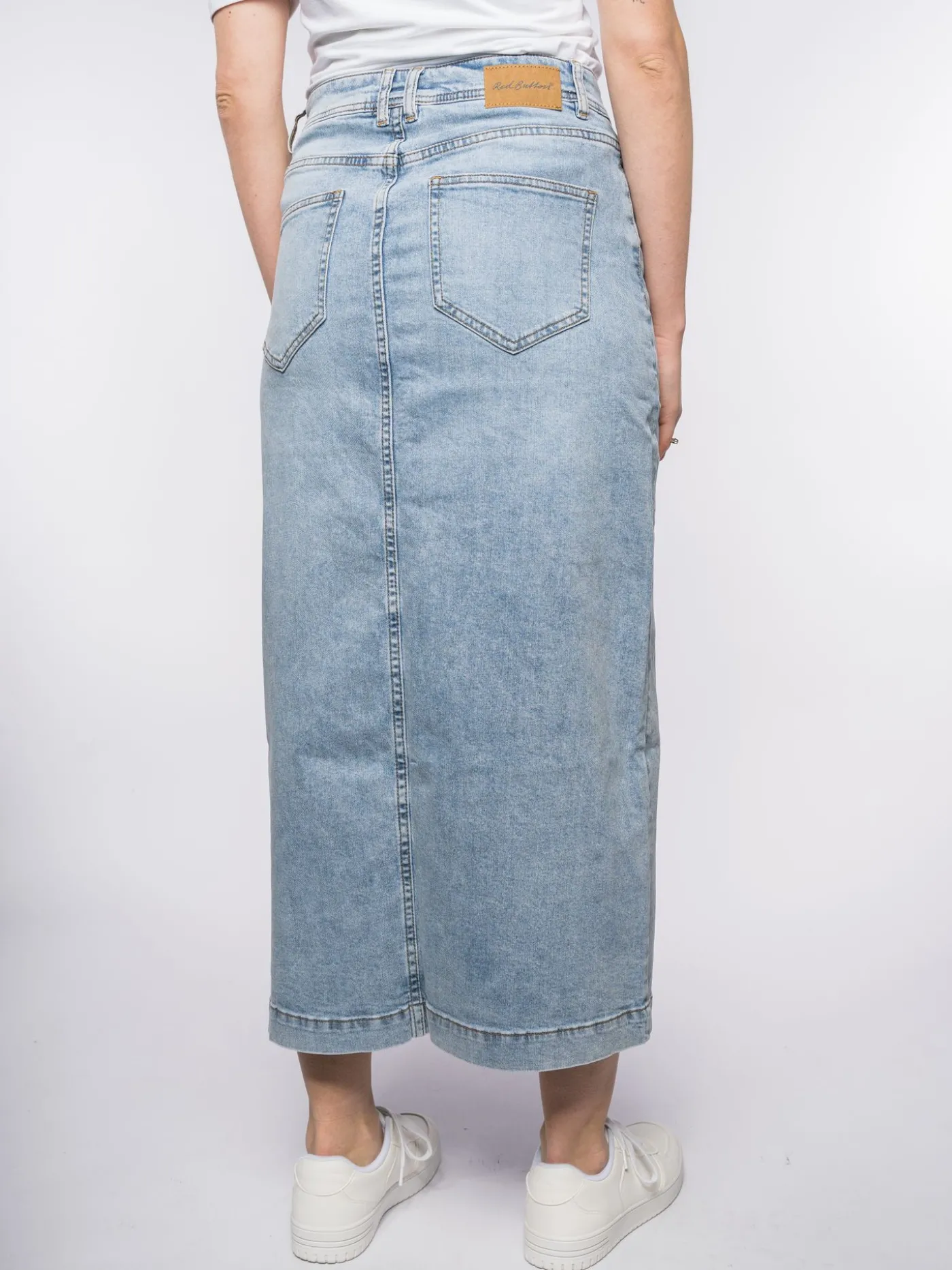 Deze denim rok is van het merk Red Button. De rok valt op kuit lengte en heeft aan de voorkant een split. De rok heeft zowel aan de voor als aan de achterkant steekzakken en is voorzien van riemlussen. De rok heeft een lichtblauwe wassing en een knoop en ritssluiting. Je kunt de rok combineren met een t-shirt en een sneaker voor een casual maar toch stoere look.