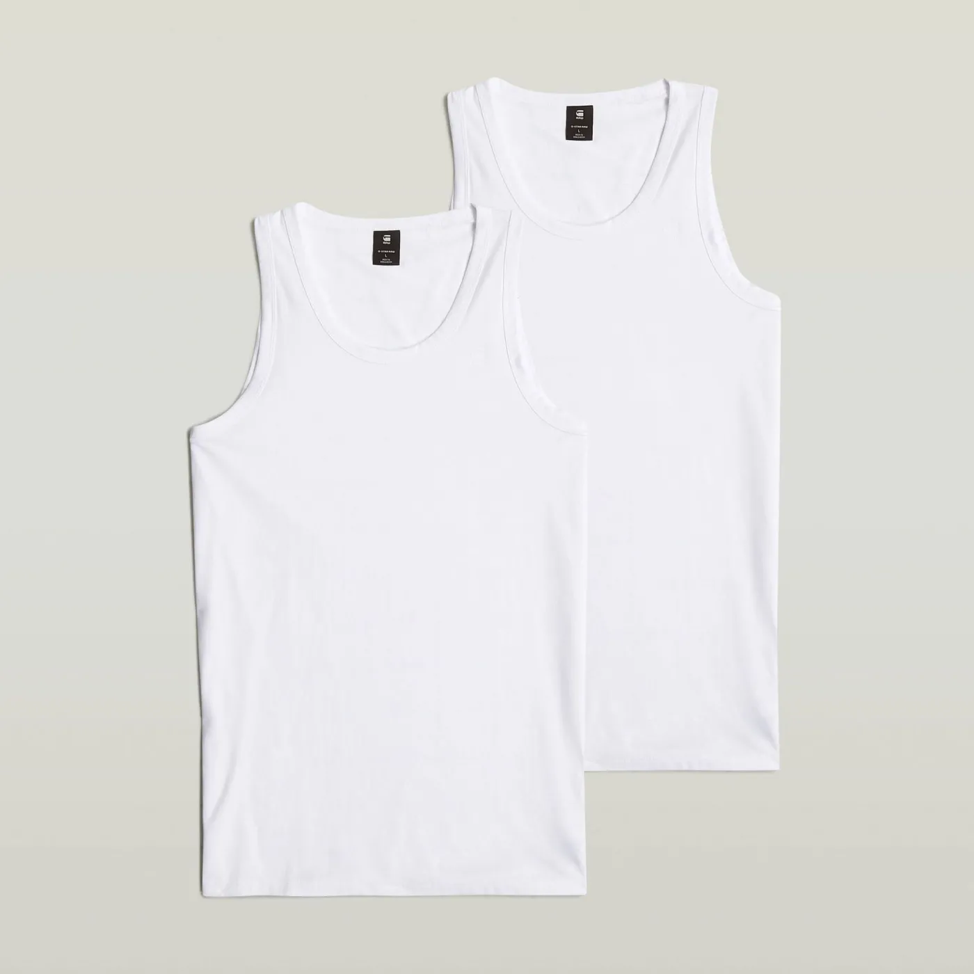 Twee basic witte tanktops van g-star met logo in het klein op de voor kant. Combineer dit met jeans en sneakers voor een basic outfit.