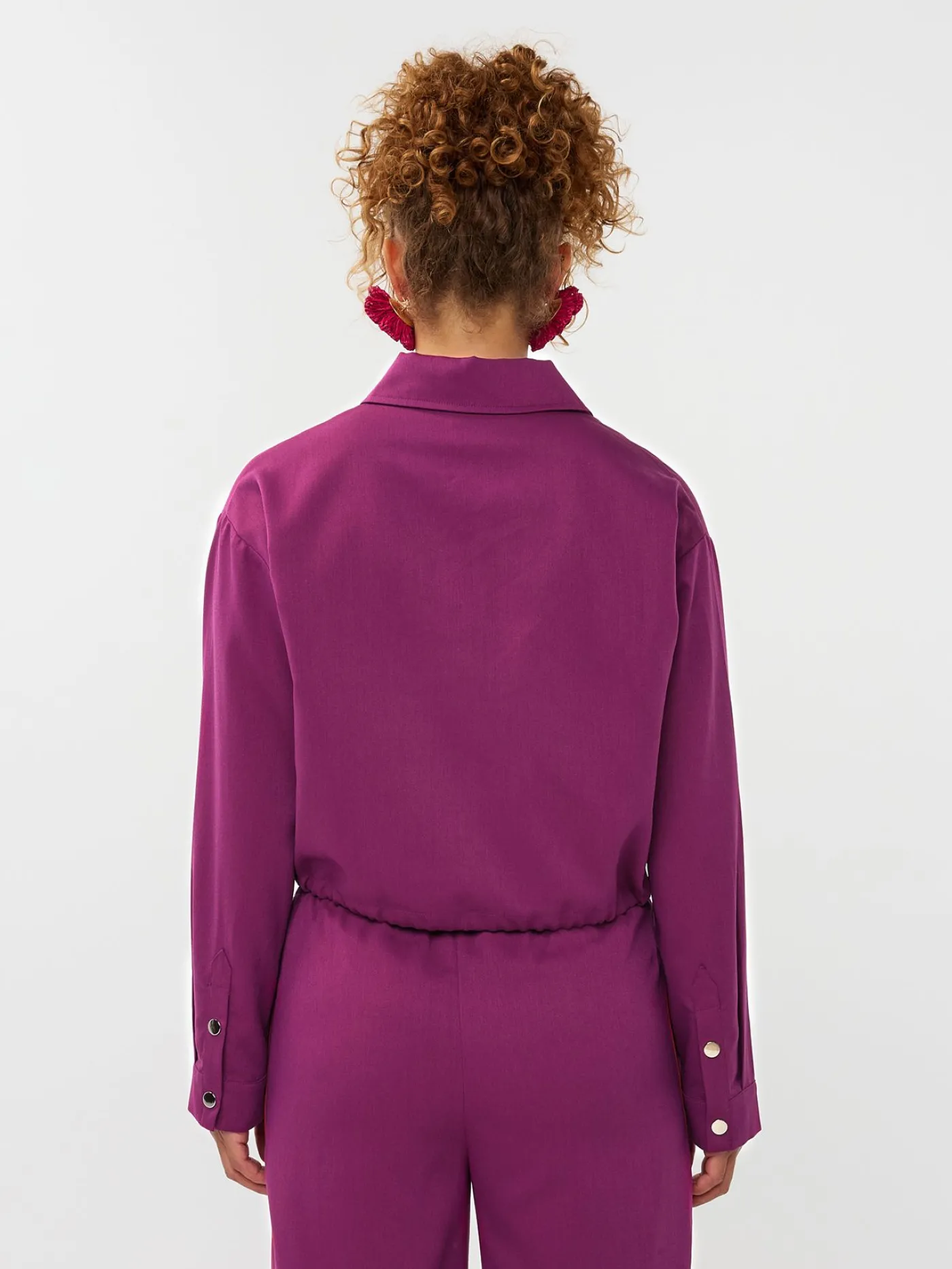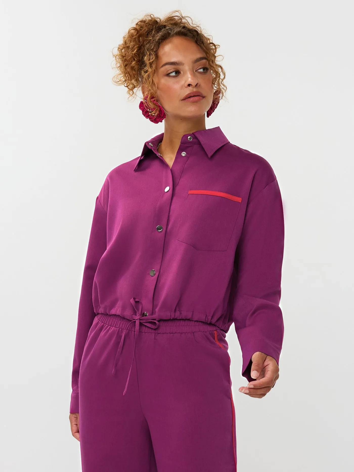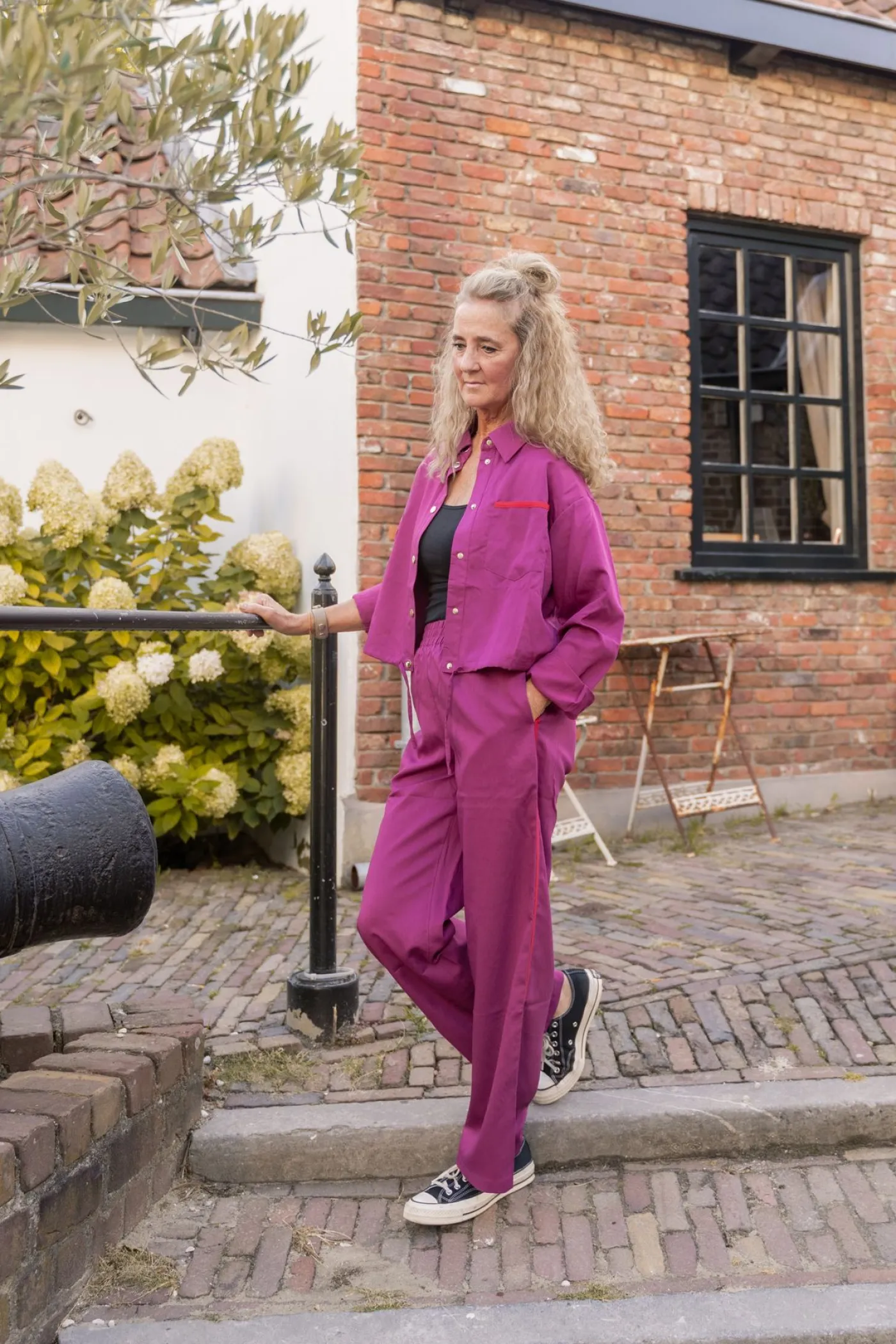 Blouse Kess van Ydence is een echte eye-catcher! Deze paars blouse heeft een opstaande kraag, drukknoopsluiting en een borstzak met rood detail. De mouwen kunnen gesloten worden door middel van twee drukknopen. Onderaan de blouse zit een trekkoord, door deze strak te knopen kan er volume gecreëerd worden. Combineer deze blouse samen met de bijpassende broek voor een complete look!