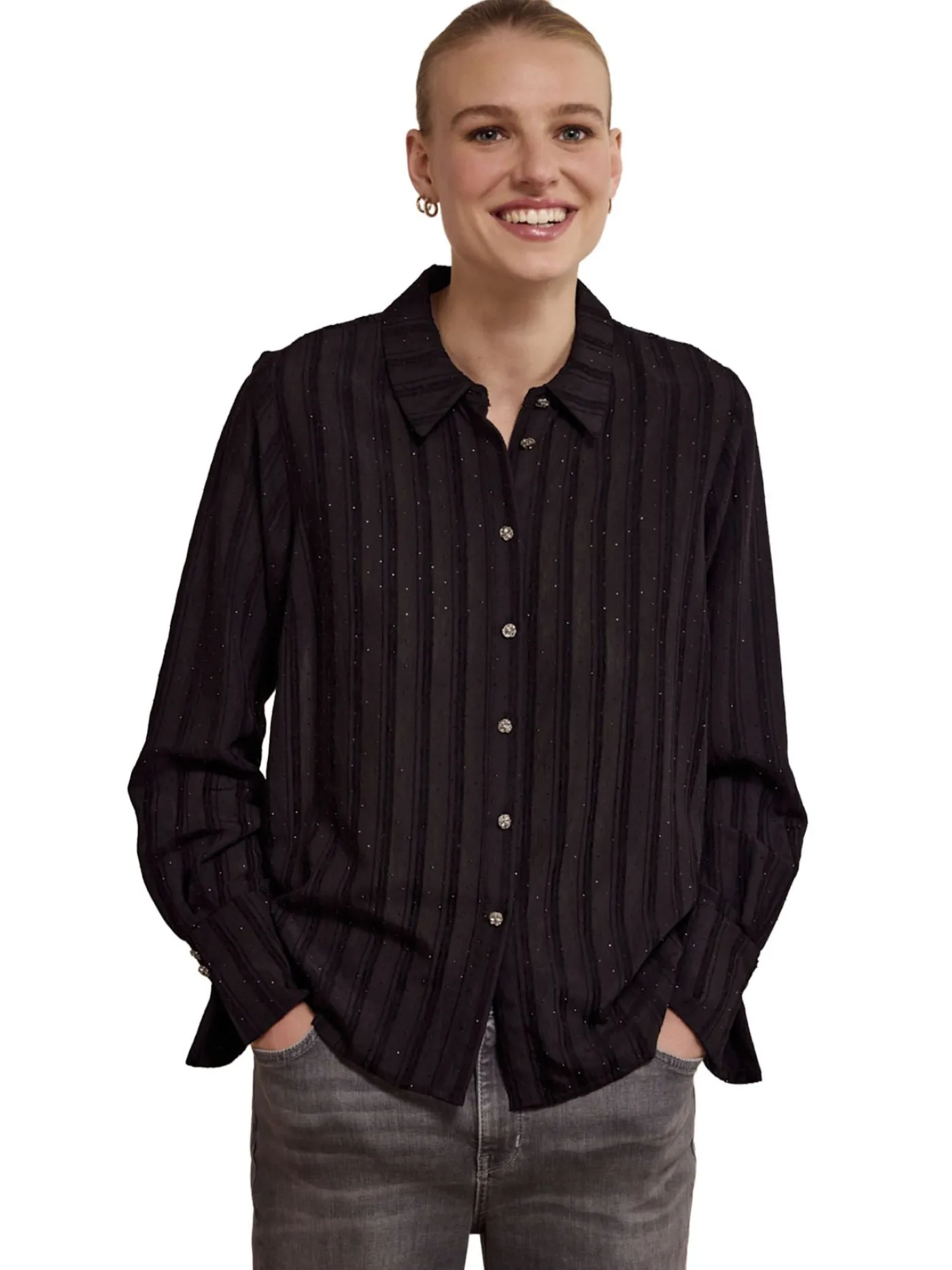 Dit zwarte blousje van Tramontana voor dames is elegant en feestelijk tegelijk. De subtiele glitters geven het blousje een chique uitstraling, terwijl de licht doorschijnende stof zorgt voor een verfijnde, vrouwelijke look. De losvallende pasvorm maakt hem comfortabel om te dragen en ideaal voor zowel een avondje uit als een nette gelegenheid.