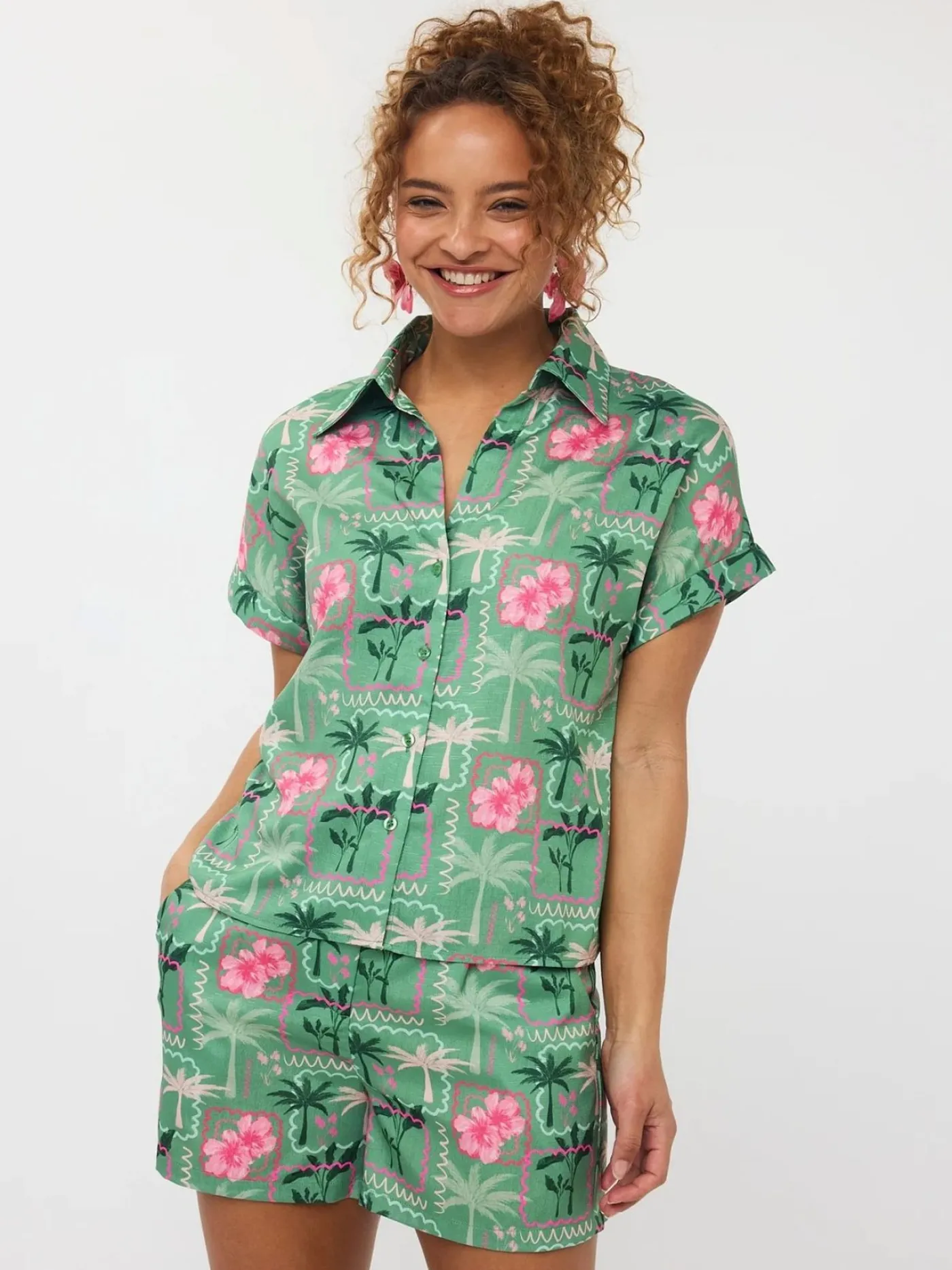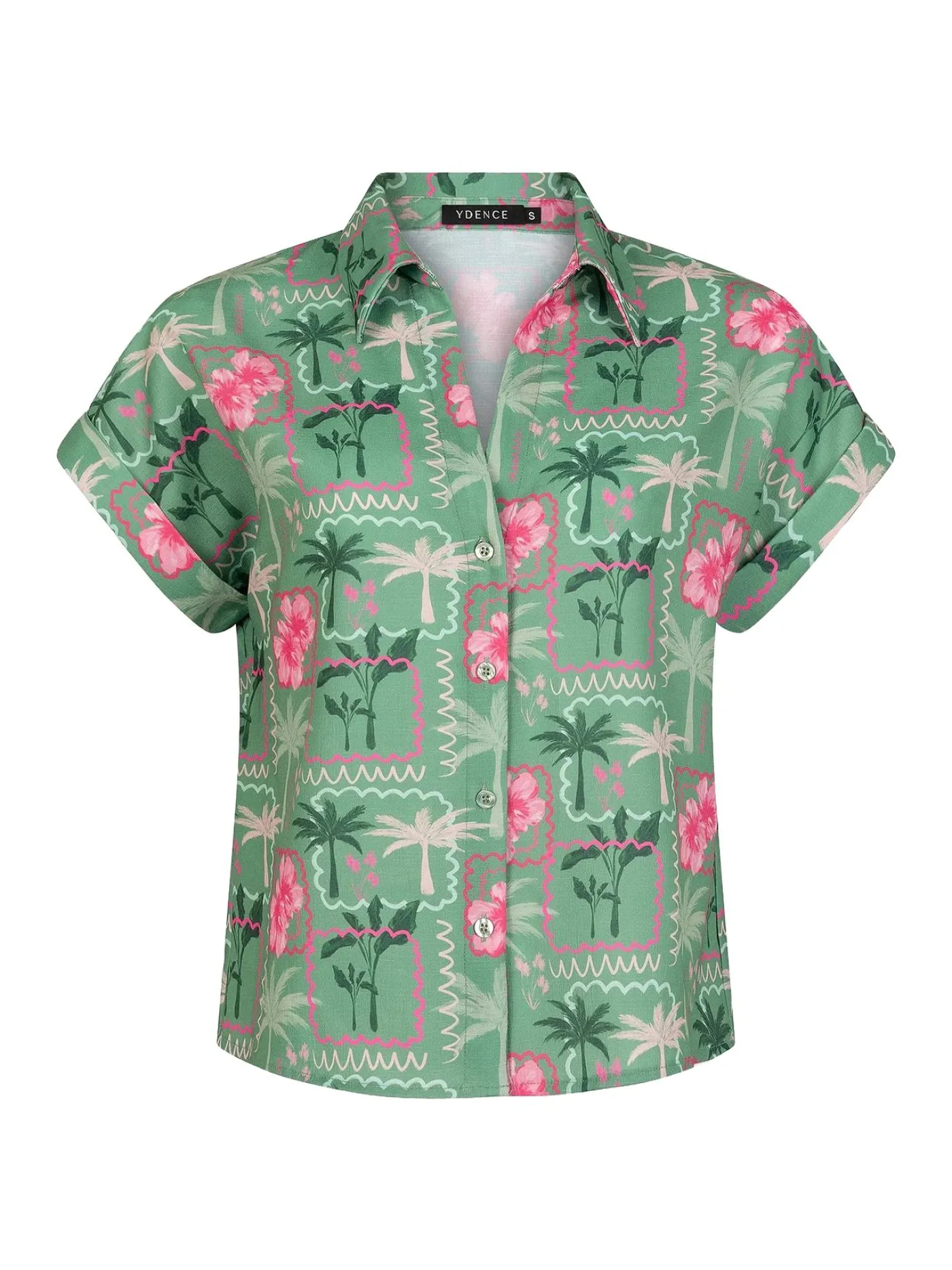 De blouse Tina is een luchtige, casual blouse met een vrolijke print, korte mouwen met omslag, een V-hals met kraagje en een boxy pasvorm. De blouse sluit aan de voorkant met knopen en is ideaal voor een ontspannen en trendy look.
