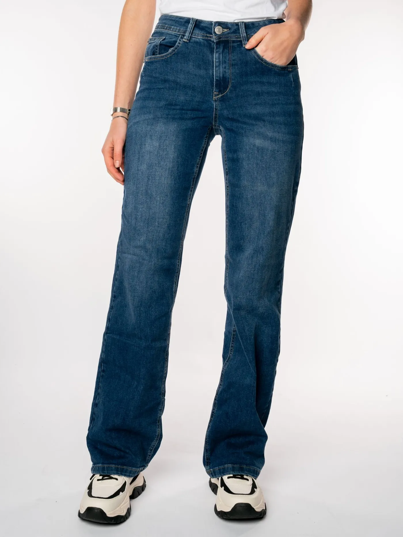 Deze donkerblauwe jeans is een veelzijdige essential voor elke garderobe. Met wijde pijpen en comfortabele hoge taille biedt deze broek een tijdloze pasvorm die mooi aansluit op het lichaam zonder strak te zitten. Het zachte stretchdenim zorgt voor optimaal draagcomfort, de hele dag door. De jeans sluit zich met een knoop- en ritssluiting en heeft vijf zakken.Combineer dit met een t-shirt en sneakers voor een casual fit