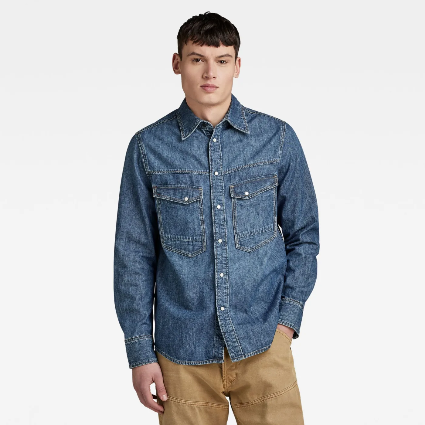 Dit overhemd van g-star is gemaakt van een spijkerstof. Het sluit zich met een drukknoop sluiting. Het heeft twee zakken op de borst, en aan de onderkant van de mouw is een manchet met knoopsluiting. Combineer dit met jeans en sneakers voor een casual fit.