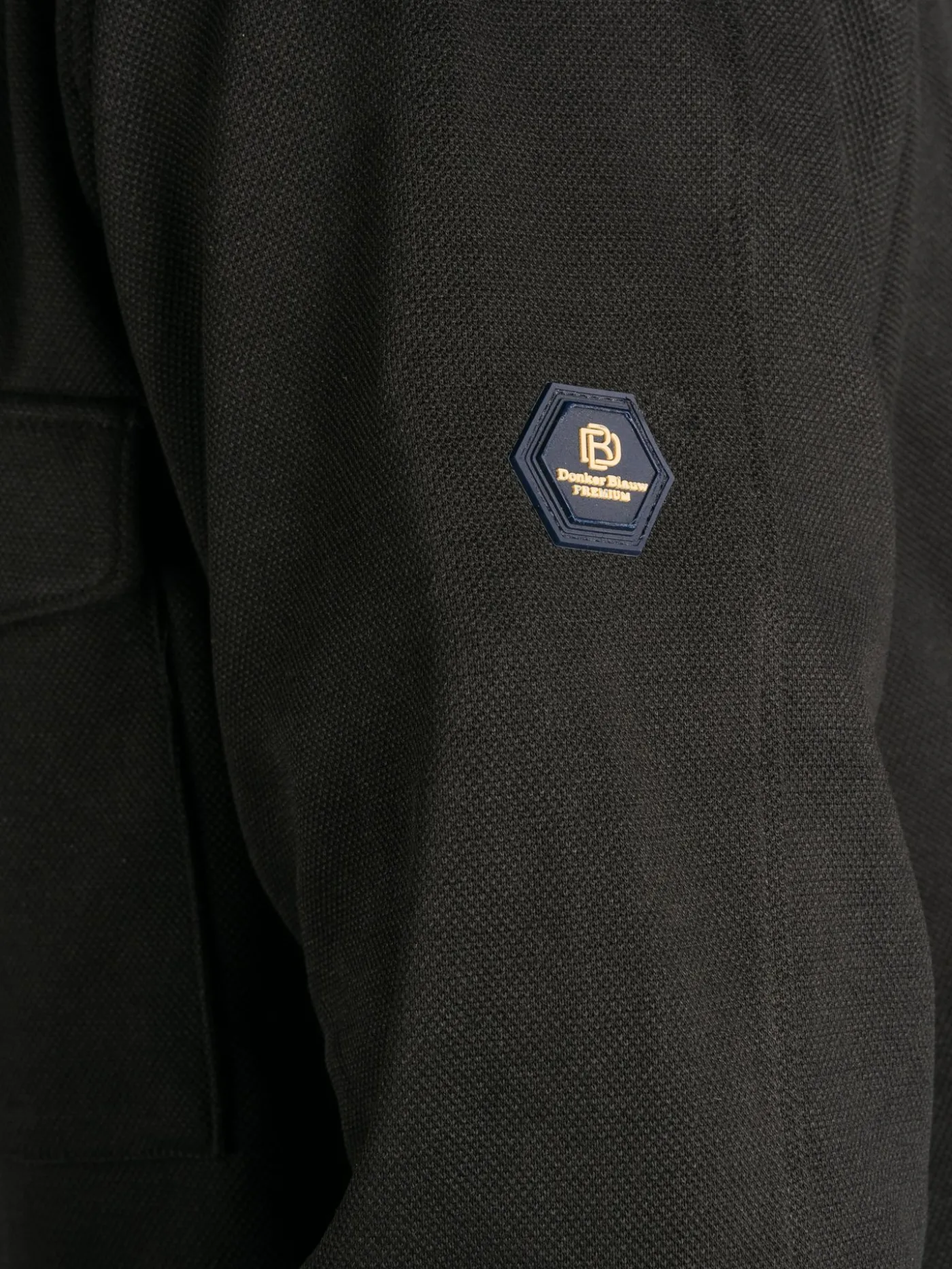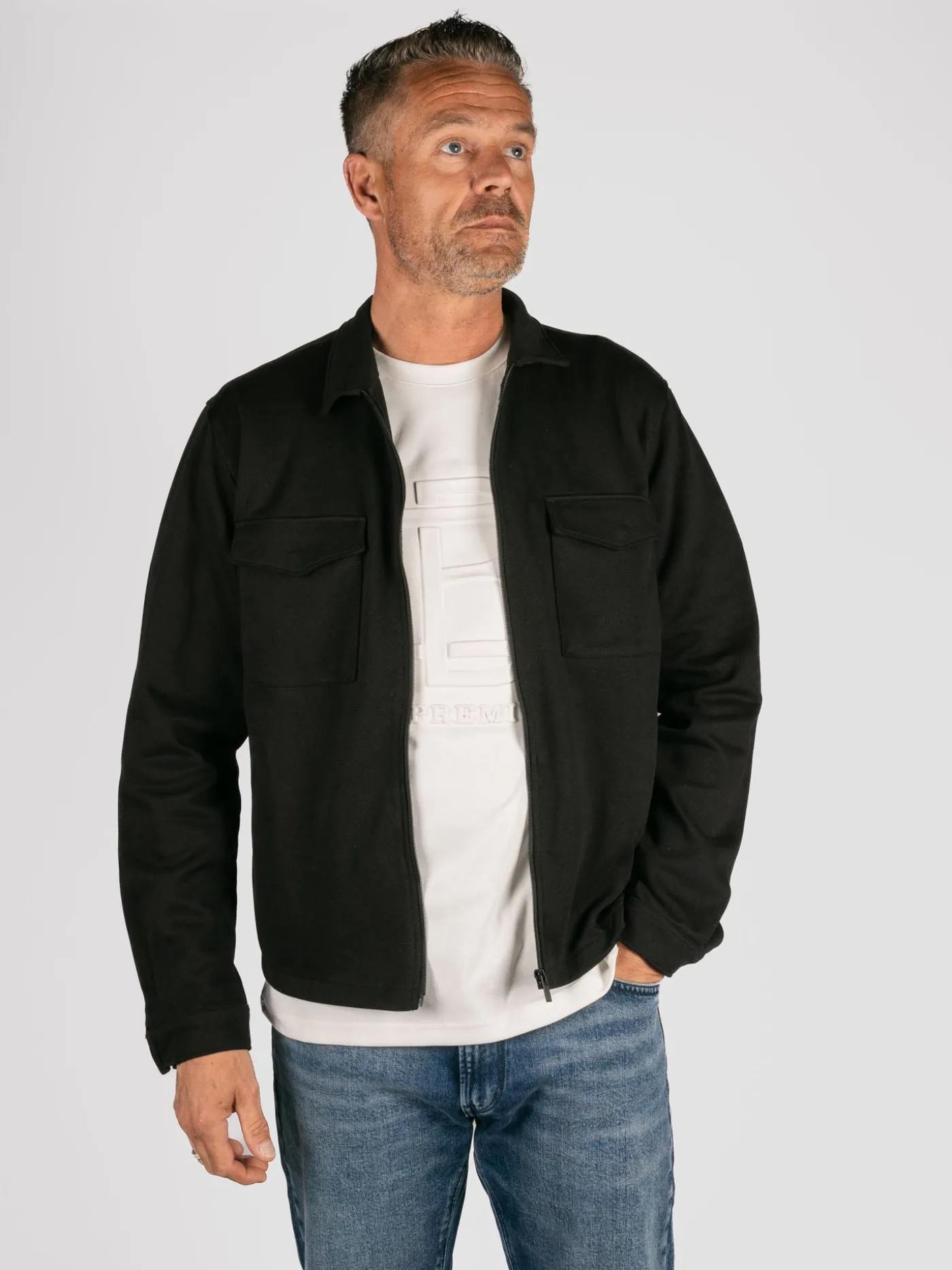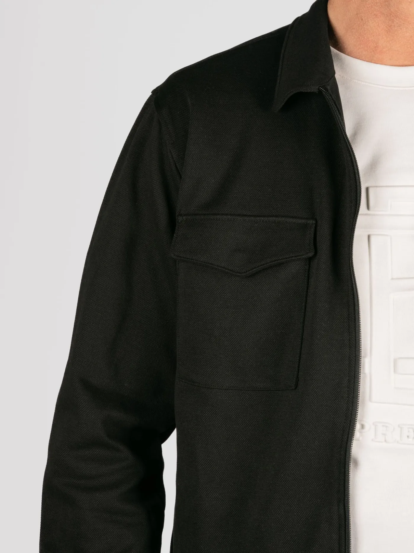 Zwart overshirt van het merk Donkerblauw voor heren. Dit item is voorzien van een kraagje, ritssluiting en twee borstzakken met klep- en knoopsluiting. Dit model heeft lange mouwen met aan het uiteinde een knoopsluiting.
