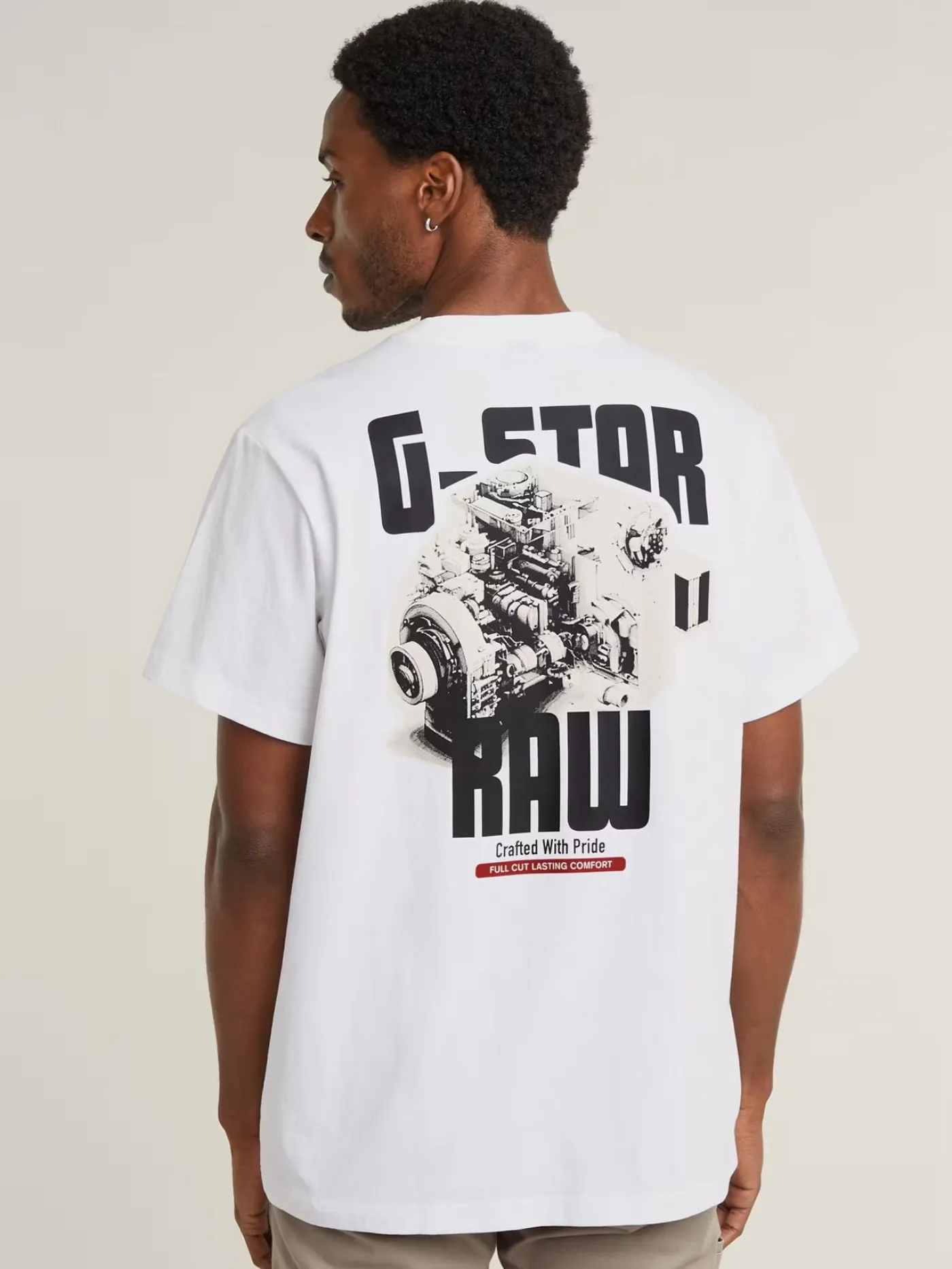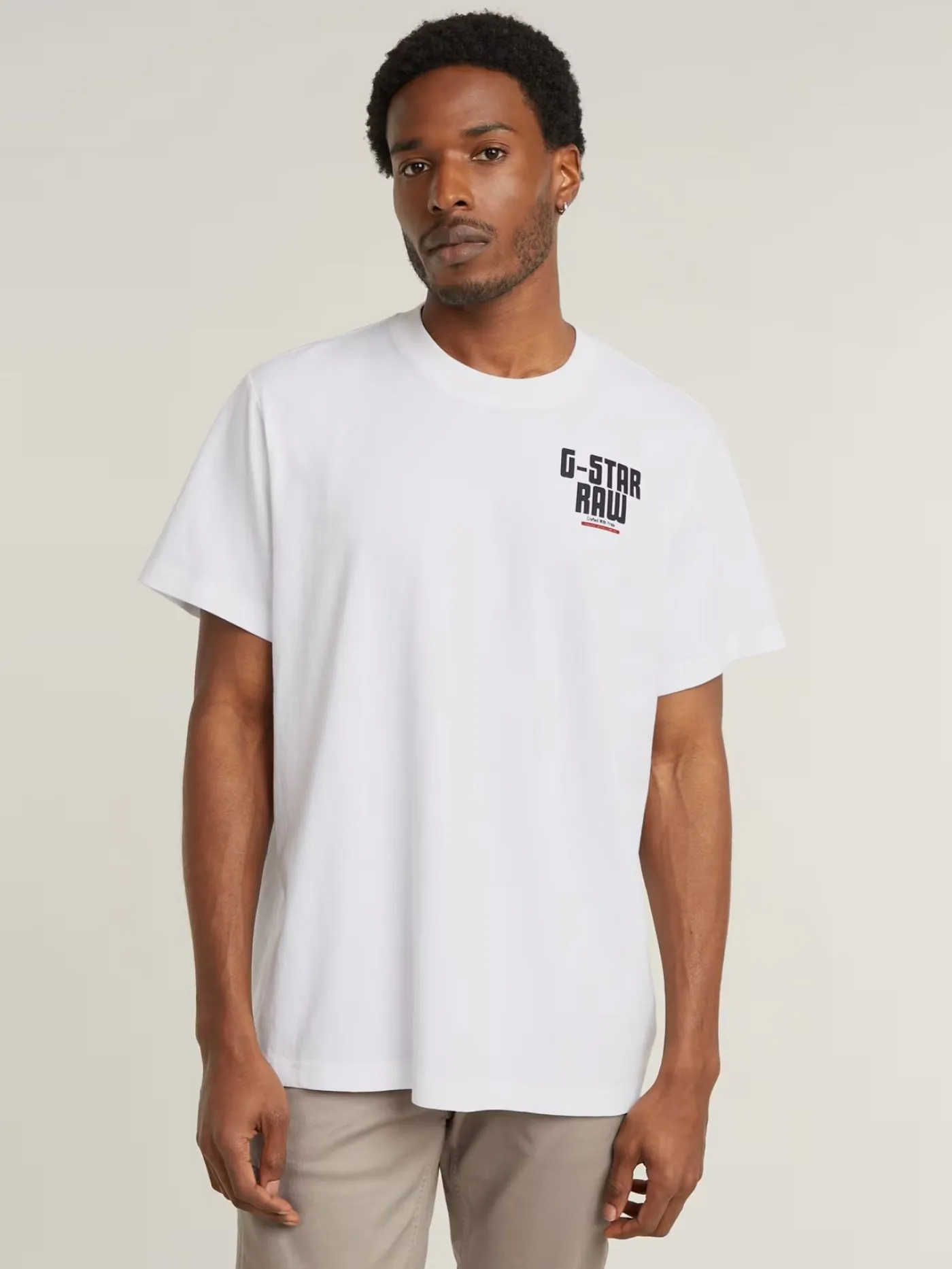 Dit T-shirt is van het merk G-Star Raw en heeft een bedrukking op de voor en achterkant. Het T-shirt heeft een ronde hals en korte mouwen, je kan dit T-shirt combineren met een paar loose fit jeans.