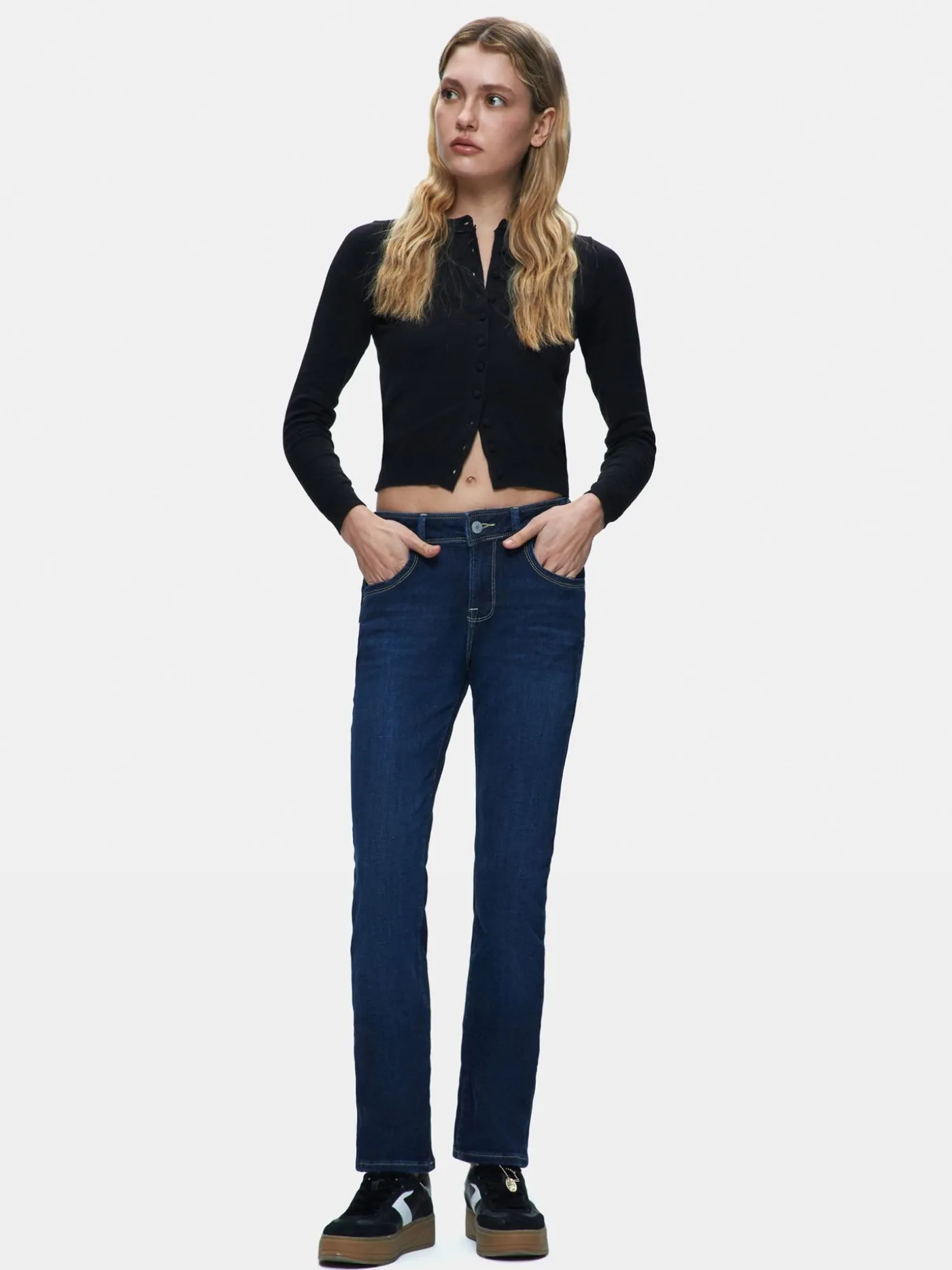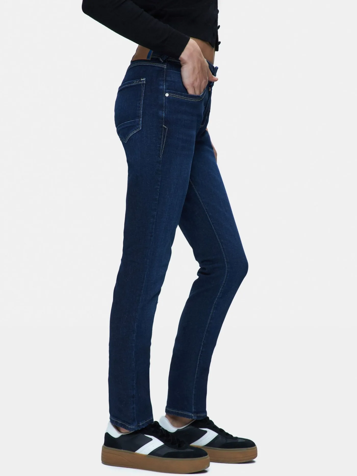 Deze stijlvolle slim fit jeans is een tijdloze aanvulling op je garderobe. De jeans is gemaakt in een diepe donkerblauwe wassing. De licht aansluitende pijpen zorgen voor een klassiek silhouet dat moeiteloos te combineren is met zowel casual als meer geklede outfits.De jeans is voorzien van vijf zakken en een knoop- en ritssluiting. Perfect te dragen met sneakers en een cropped top voor een moderne, alledaagse look.