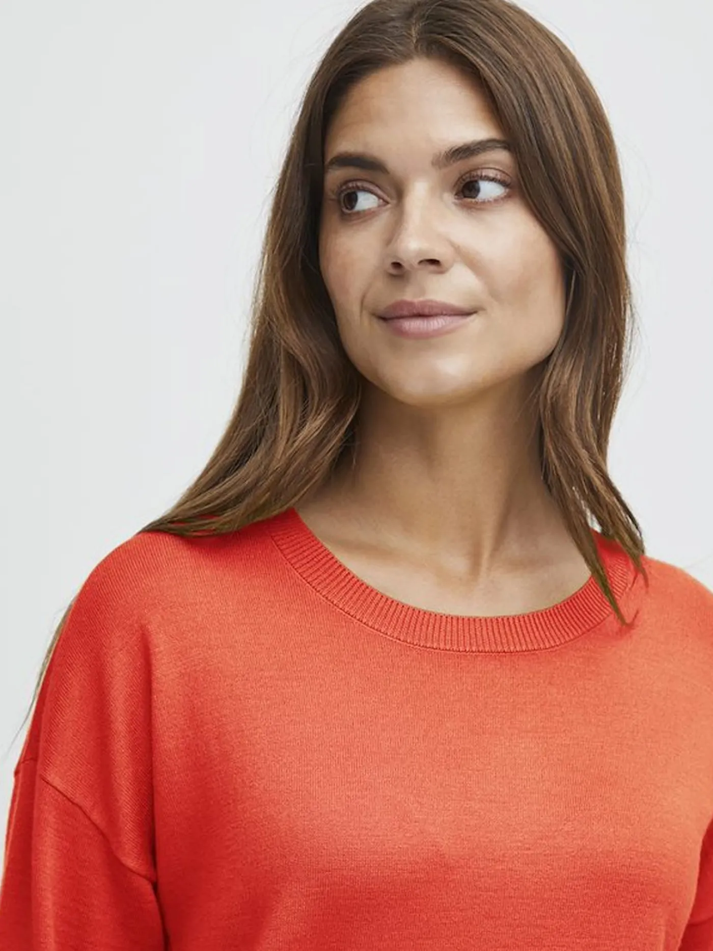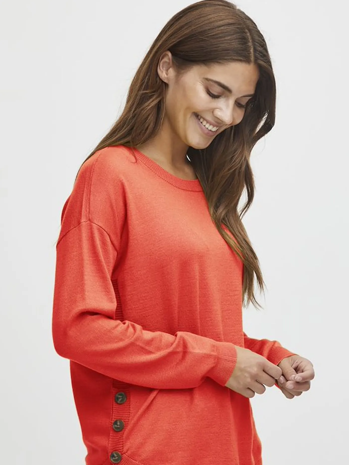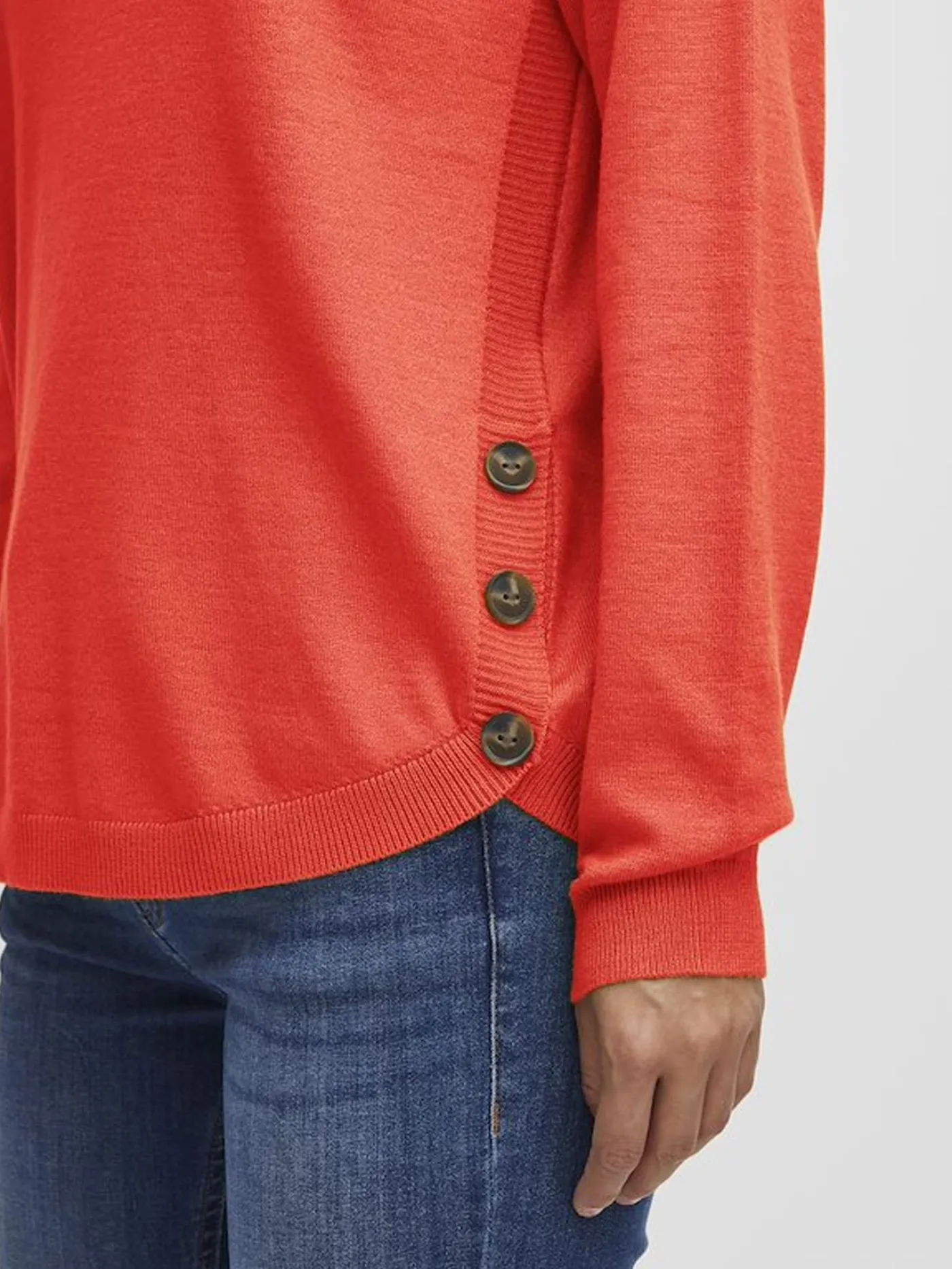 Pullover in de kleur oranje van het merk Fransa. De trui heeft aan de onderkant aan beide kanten een knoopsluiting.