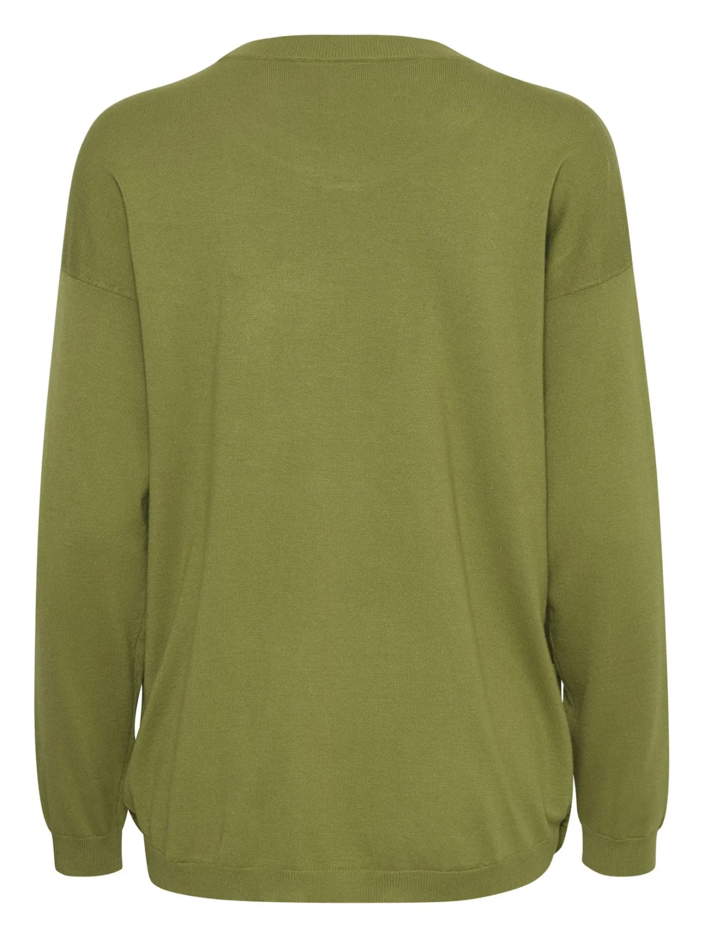 Een erg leuk, zacht truitje van Fransa in een olijfgroene kleur. De trui heeft een ronde hals en een leuk knoopdetail aan beide zijdes aan de onderkant van de trui.