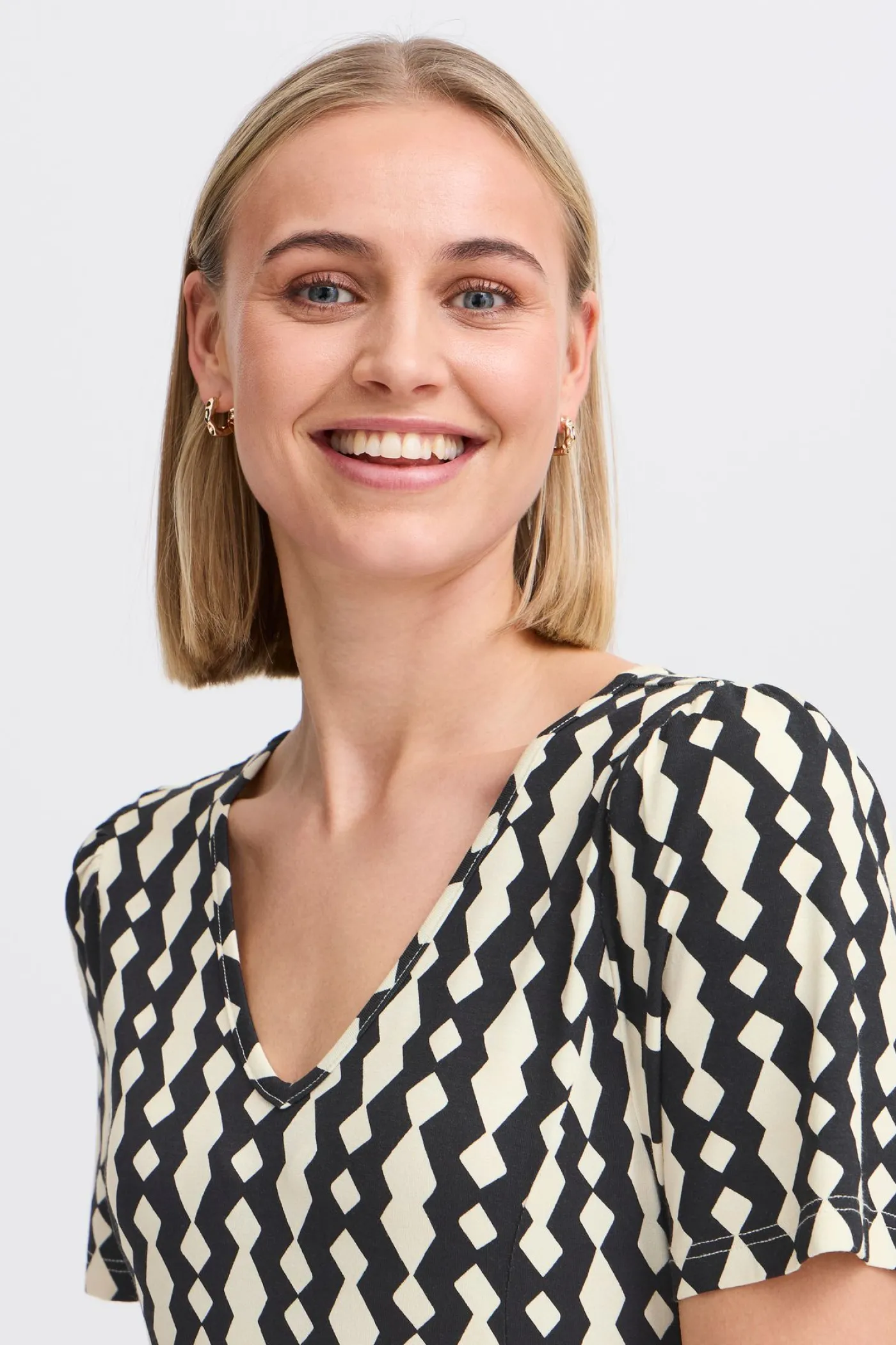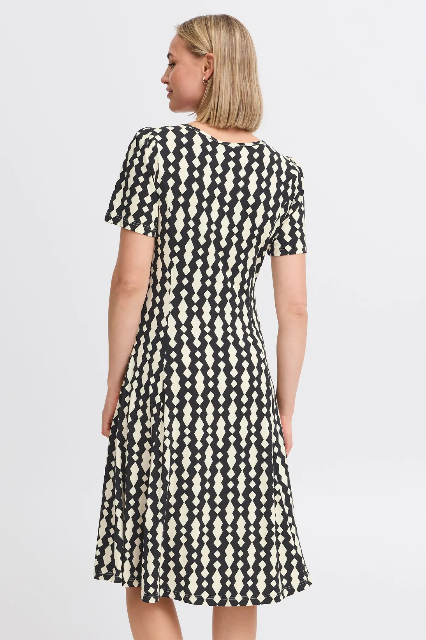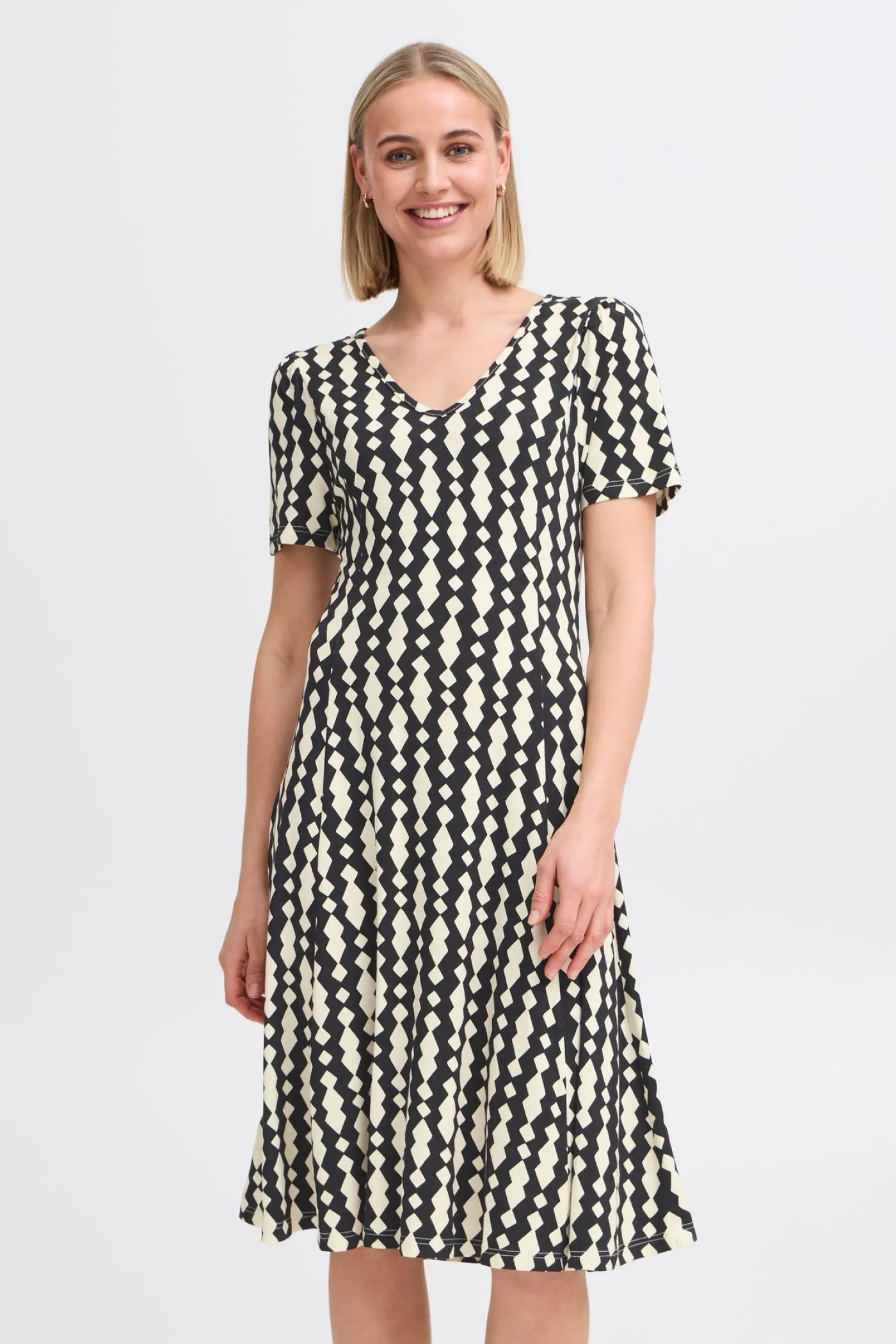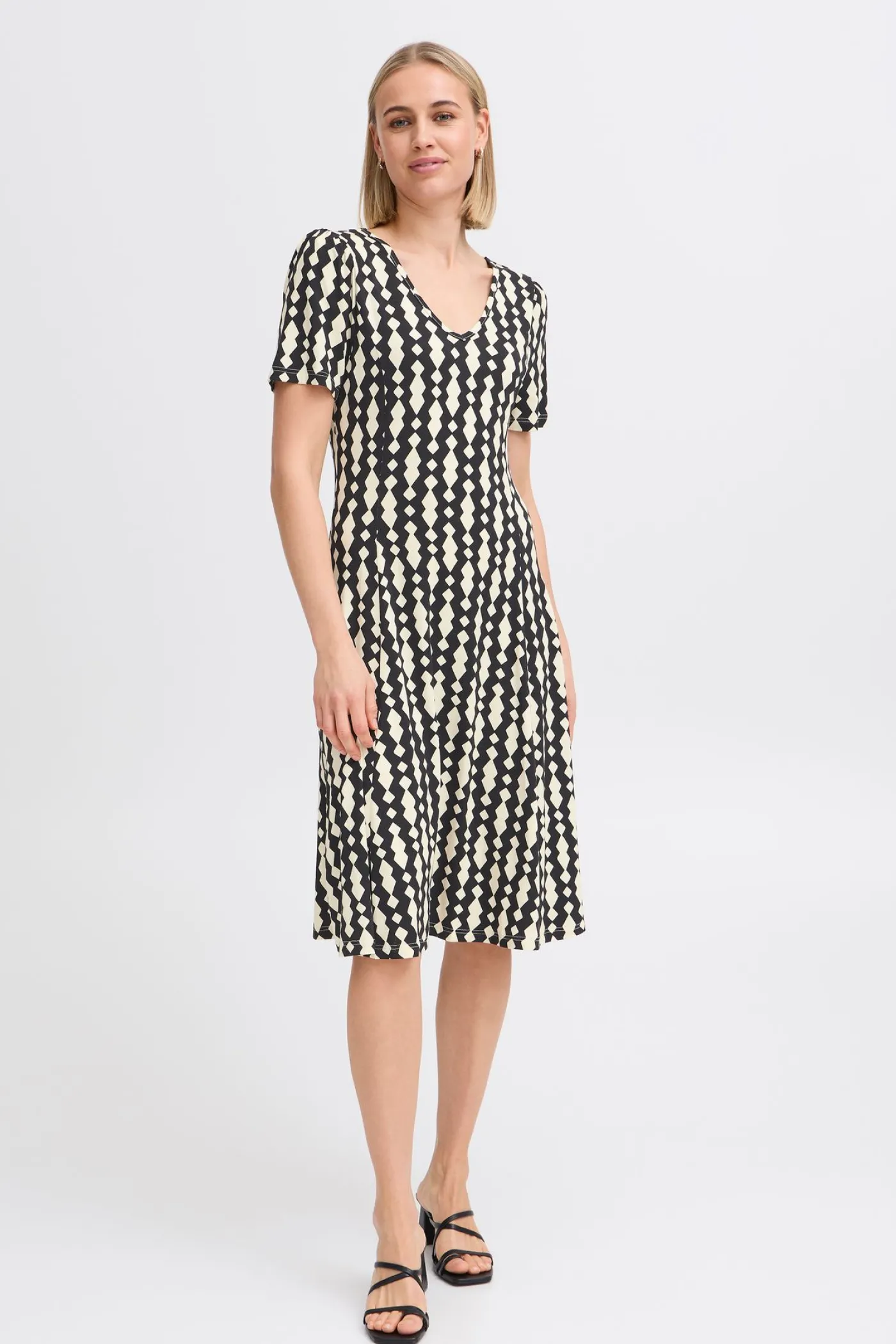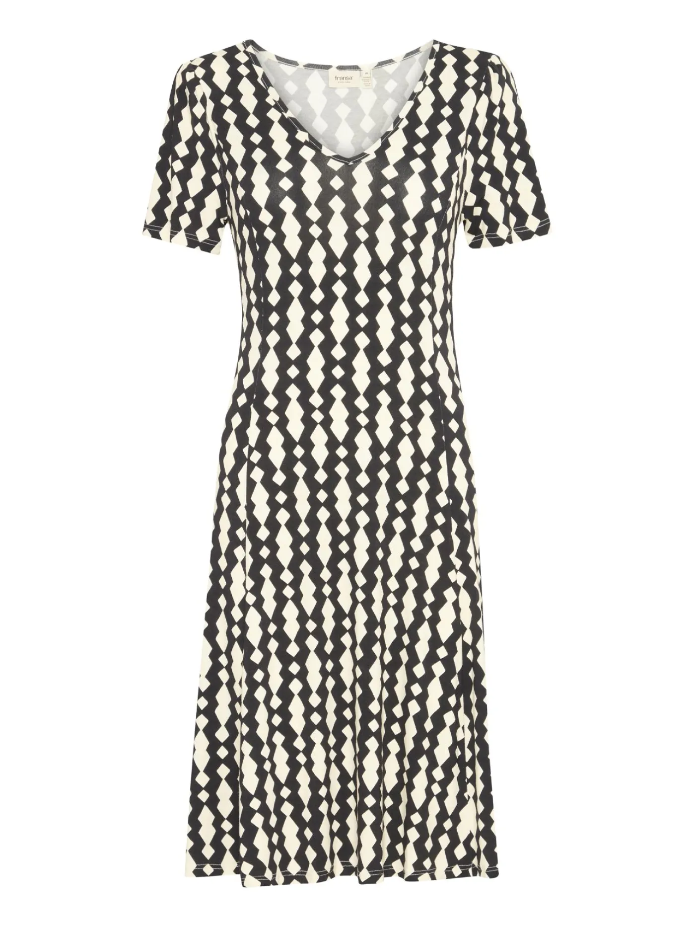 Deze aansluitende jurk van Fransa heeft een elegante uitstraling. De jurk valt tot op de knie en heeft een zwart-witte geblokte print. De jurk heeft korte mouwen en een V hals. De stof is zacht en rekbaar, wat zorgt voor een comfortabele pasvorm die zich mooi aan het lichaam vormt. De jurk is perfect voor een nette gelegenheid of voor die belangrijke meeting in de warme zomerdagen!