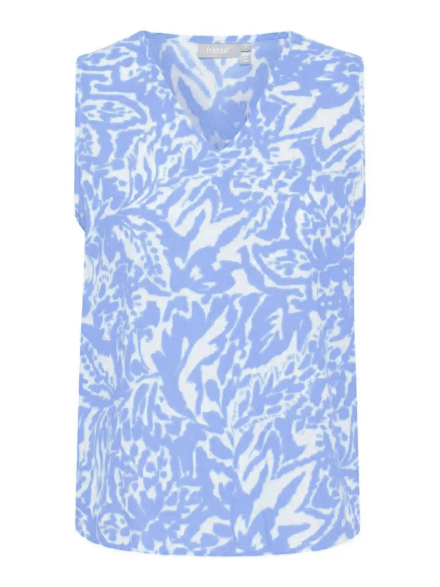 Top van het merk Fransa met een blauwwitte print en een V-hals. Deze top is ideaal voor de zomer en kan je combineren met een rok of een korte broek.