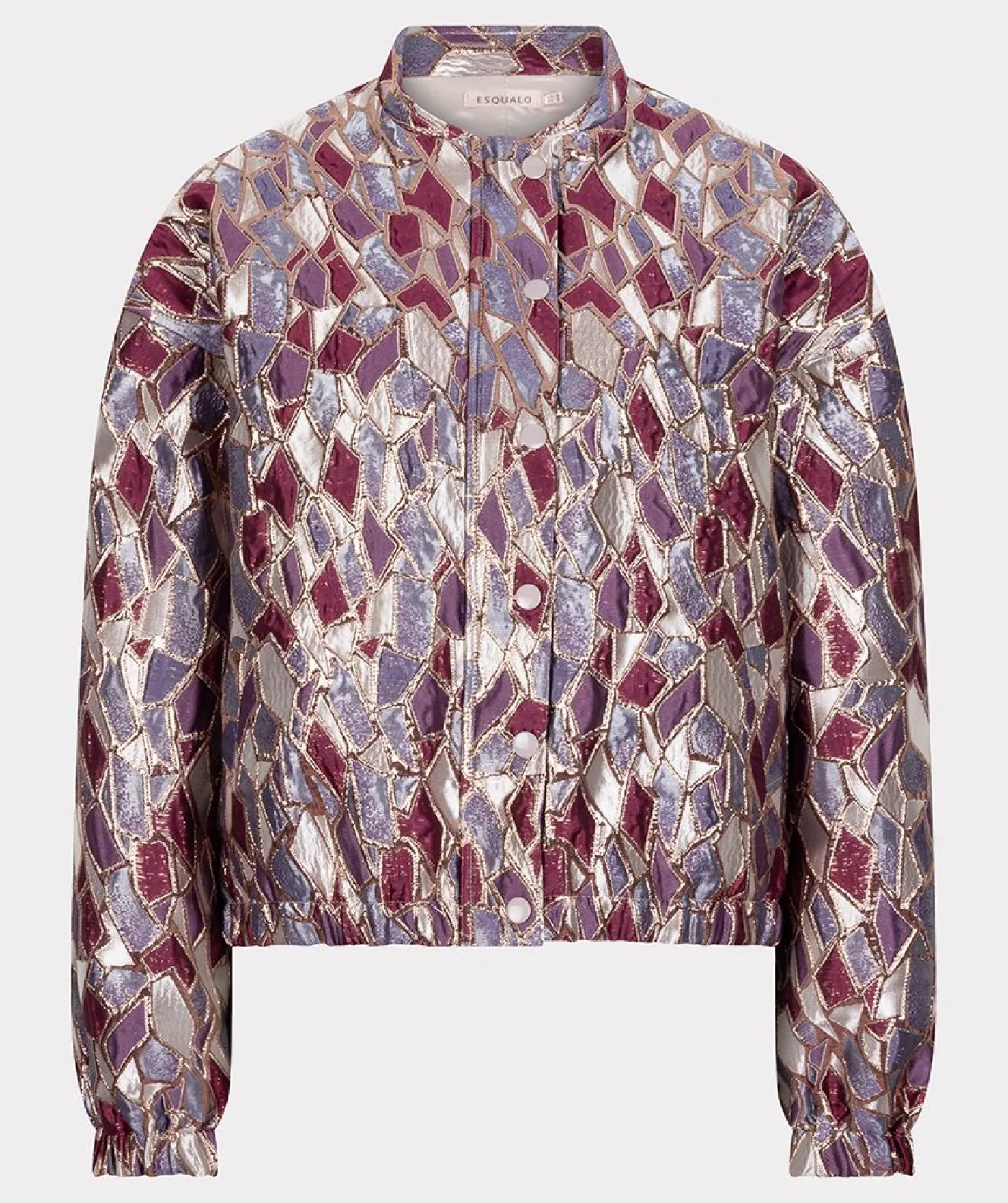 Metallic mosaic jasje van Esqualo. Dit item is valt direct op door de metallicmozaïekprint met tintenvan zilver, lila, paars, goud en roze. Het lichte polyester voelt comfortabel aan. De regular fit zorgt voor een goede pasvorm zonder strak te zitten. Elastische boorden bij de mouwen en een sportieve afwerking. De jas sluit met drukknopen. Perfect om een casual outfit snel een feestelijke twist te geven. Combineer met een basic top en jeans voor een stijlvolle outfit.