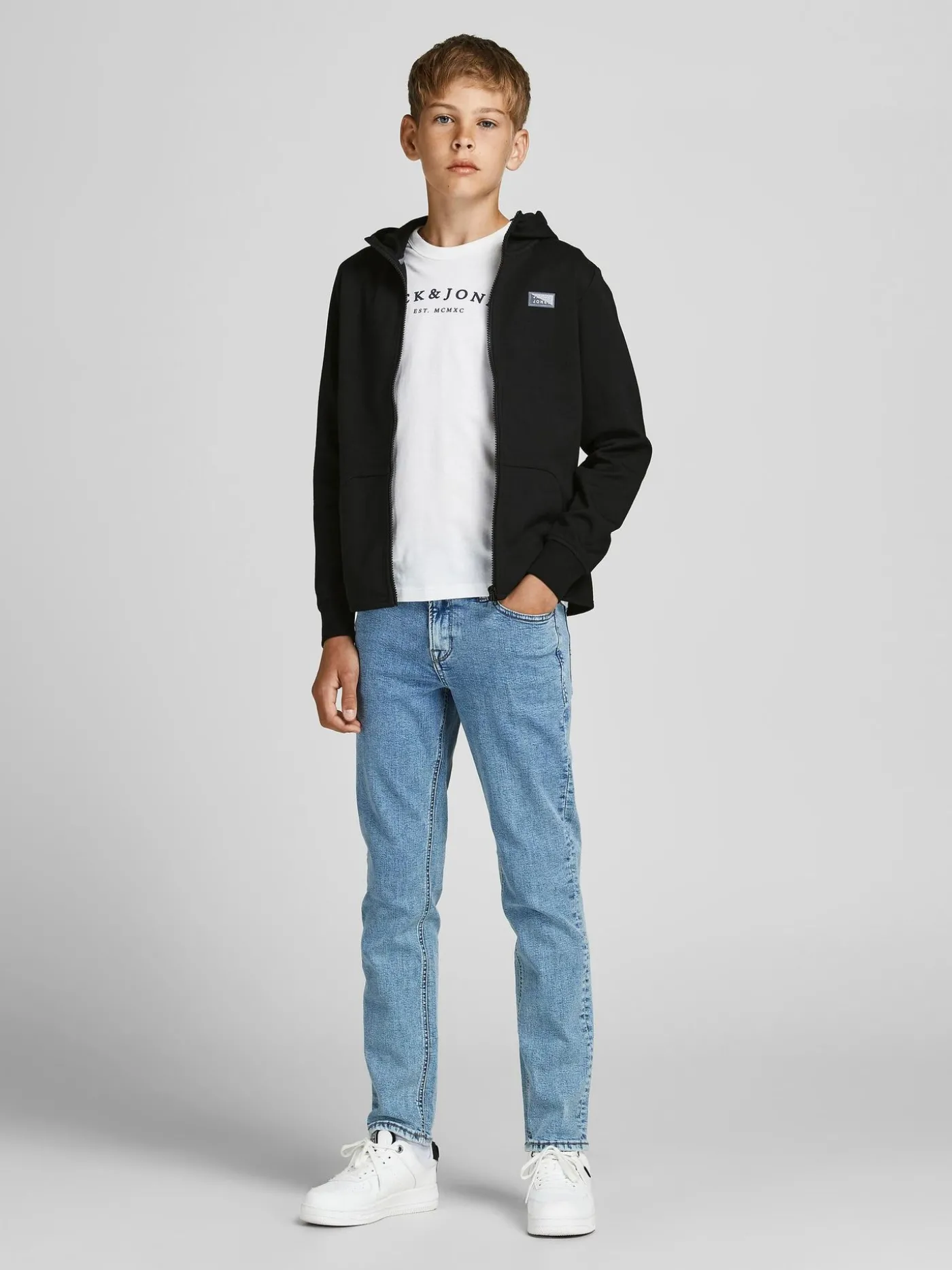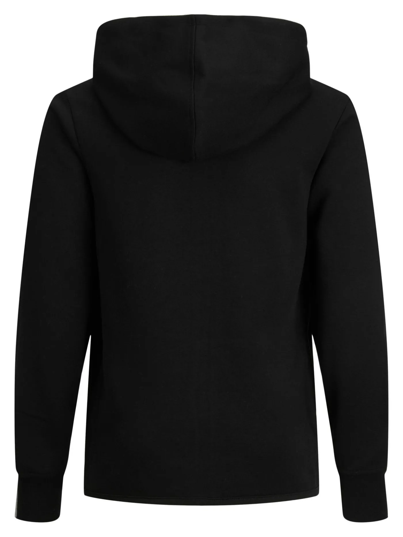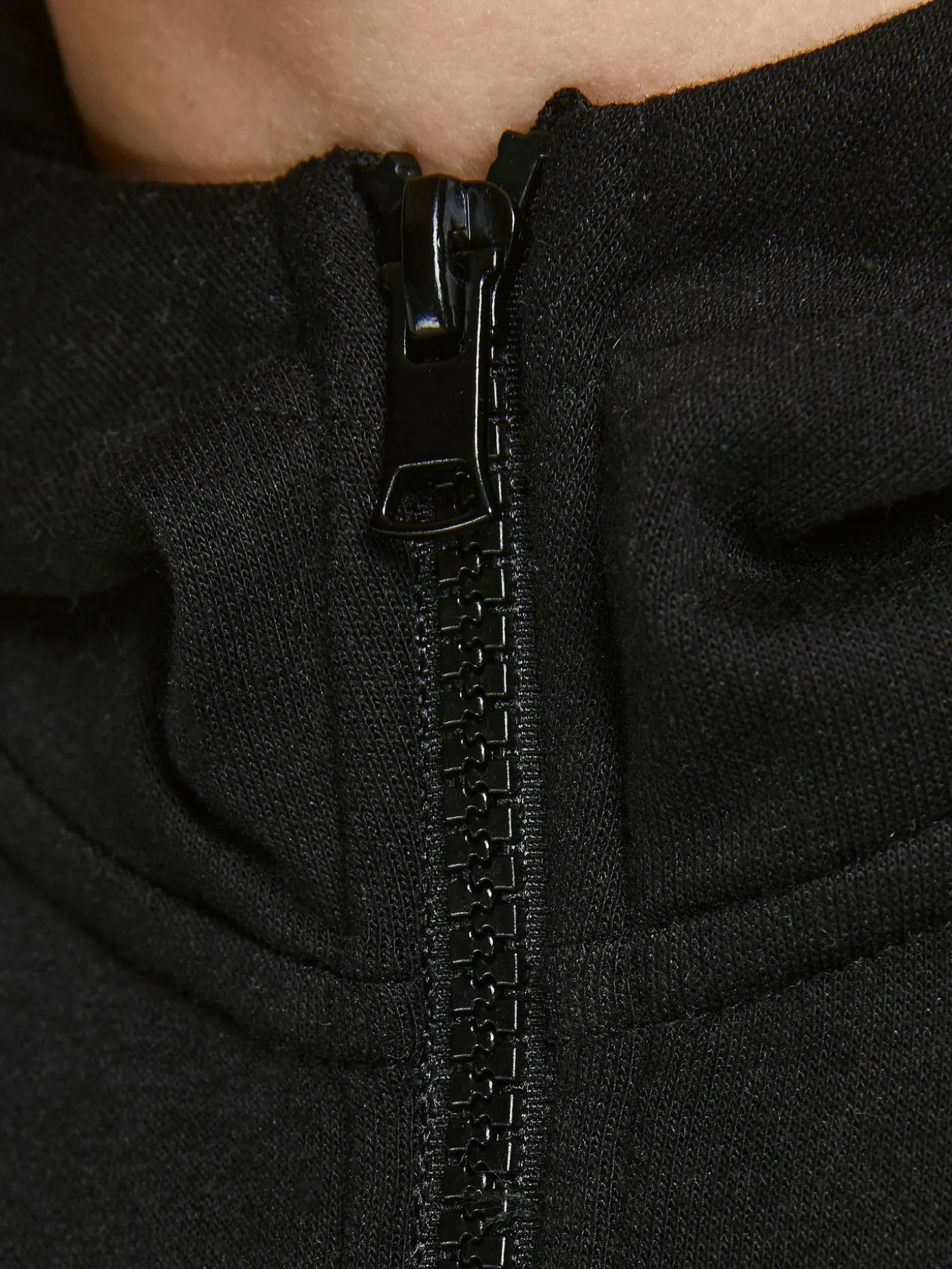 Zwart vest voor jongens van Jack & Jones. Het vest heeft een capuchon, ritssluiting en twee steekzakken. Een fijn vest met een sportieve look.