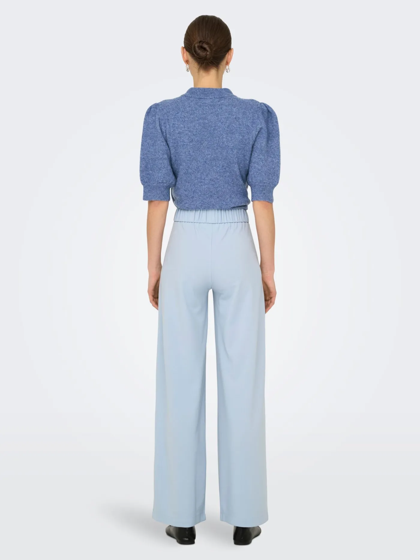 Comfortabele wide fit pantalon van het merk JDY. De lichtblauwe pantalon is gemaakt van een stretch stof en heeft een elastische tailleband. De broek heeft twee steekzakken en twee zwarte knopen aan de voorzijde.