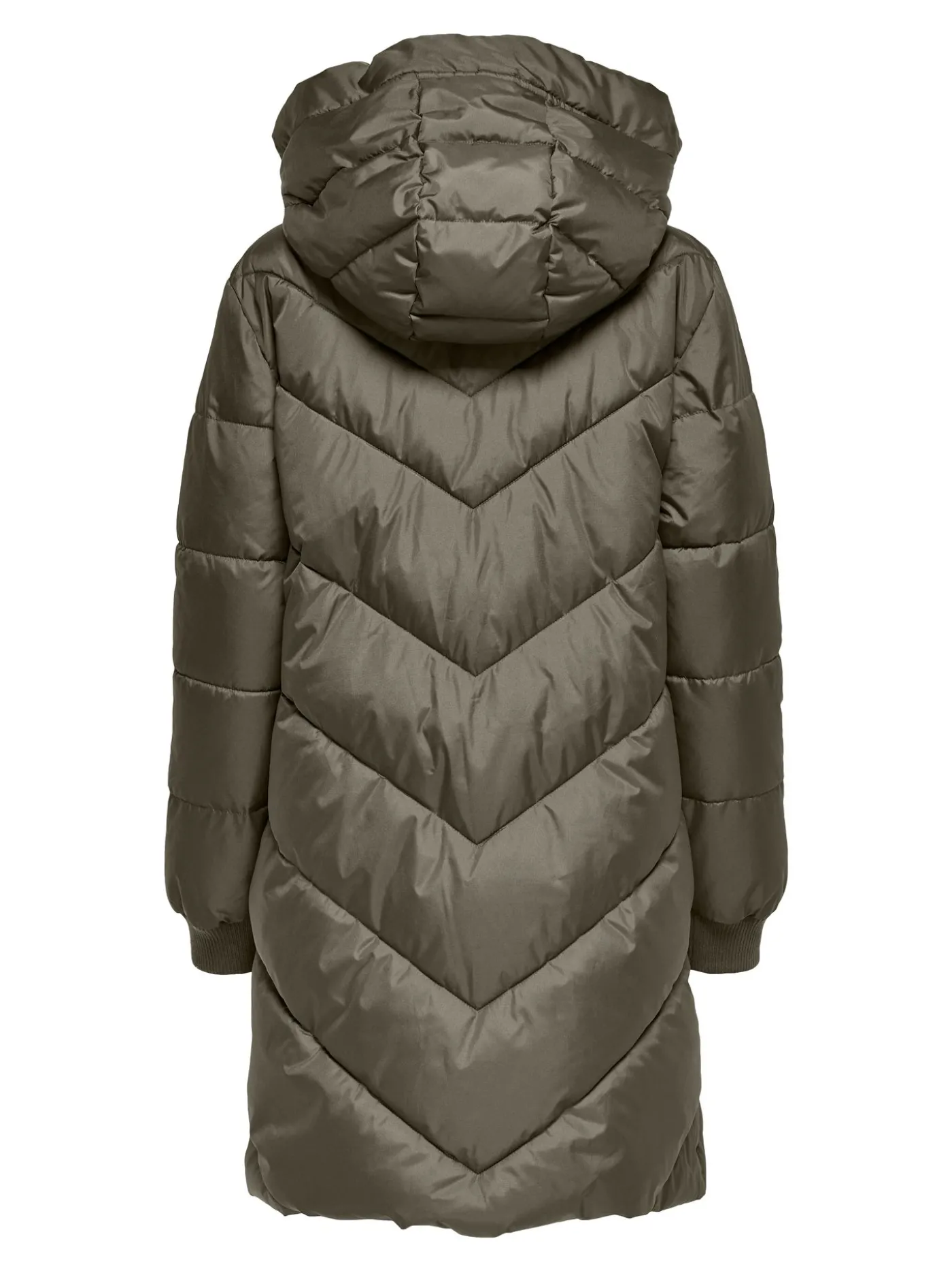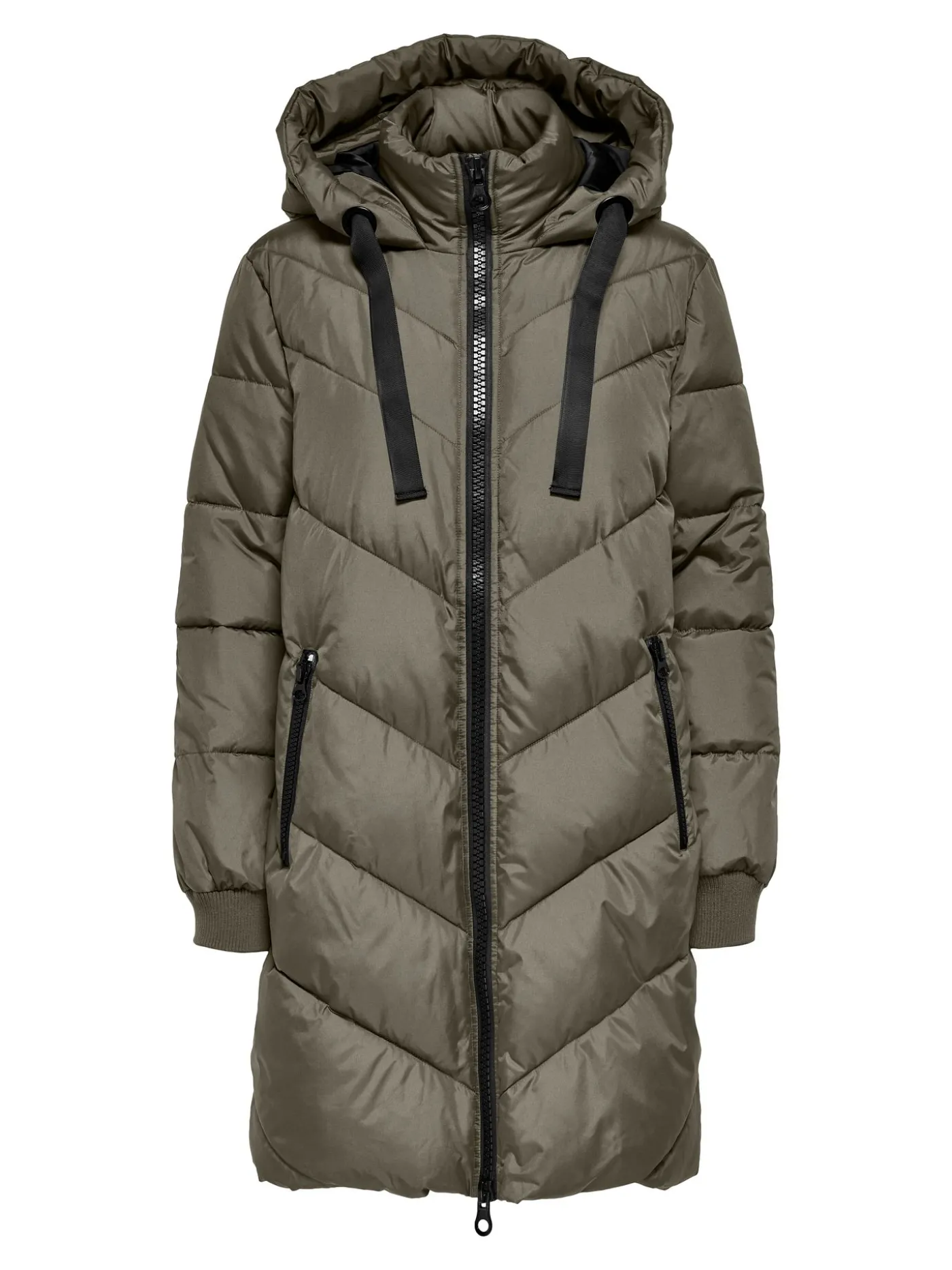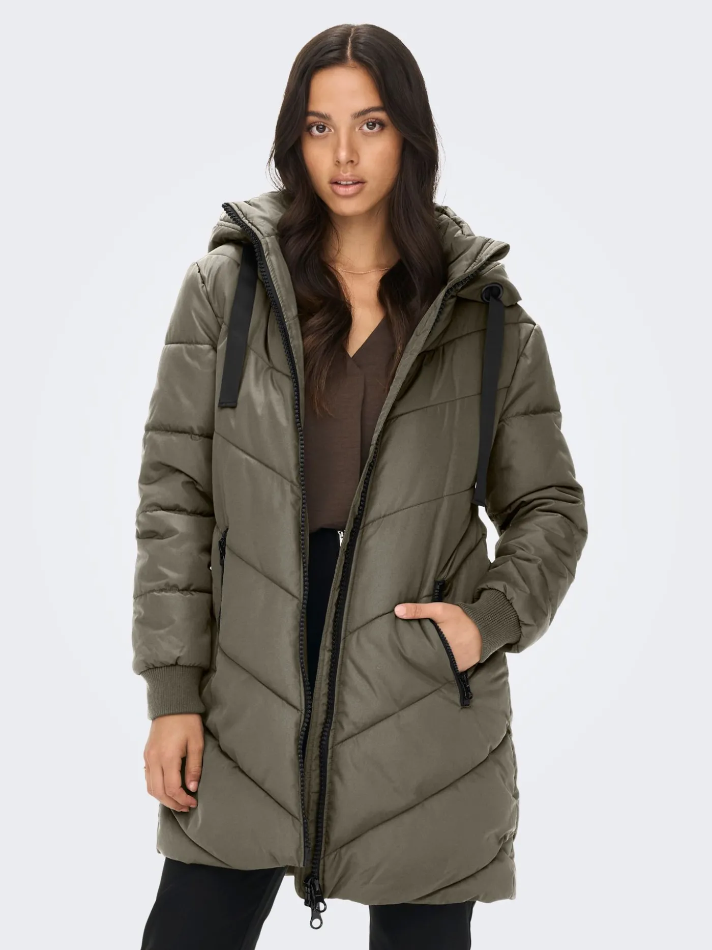 Blijf stijlvol warm tijdens koude dagen met deze elegante gewatteerde parka. De jas is uitgevoerd in een tijdloze groene kleur en heeft een flatterende, licht getailleerde pasvorm. De diagonale stiknaden zorgen voor een moderneuitstraling, terwijl de zachte vulling optimale warmte biedt.Voorzien van een stevige ritssluiting, twee praktische zakken met rits en een comfortabele capuchon.De geribde boorden aan de mouwen houden de warmte binnen en geven de jas een sportieve touch. Combineer met een jeans en laarzen voor een casual winterlook of draag over een jurkje met panty voor een meer geklede stijl.