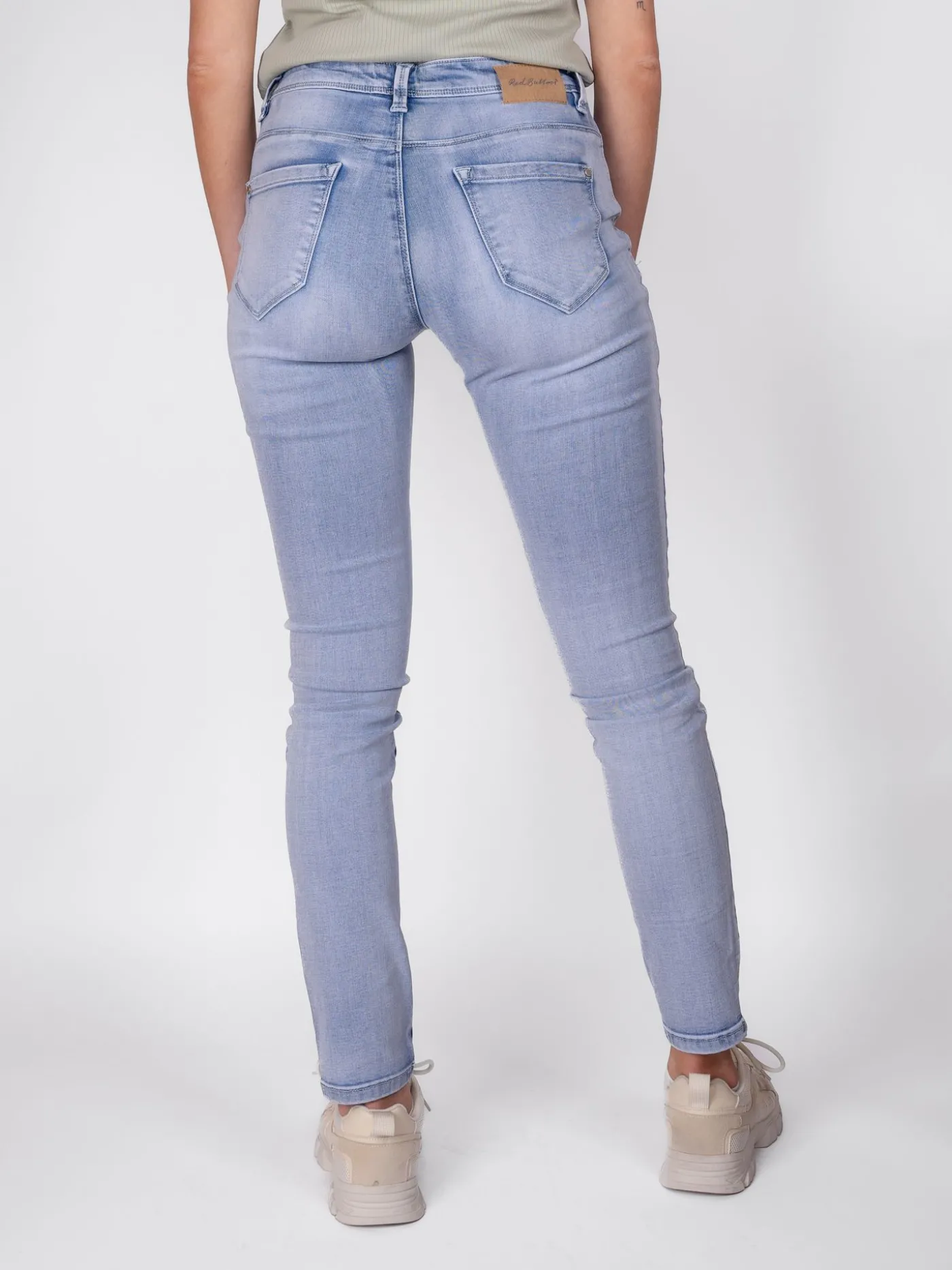 Lichtblauwe superstretch skinny jeans van het merk Red Button. De 5-pocket jeans heeft een lichte wassing en is voorzien van riemlussen. De broek heeft een ritssluiting met enkele knoopsluiting.