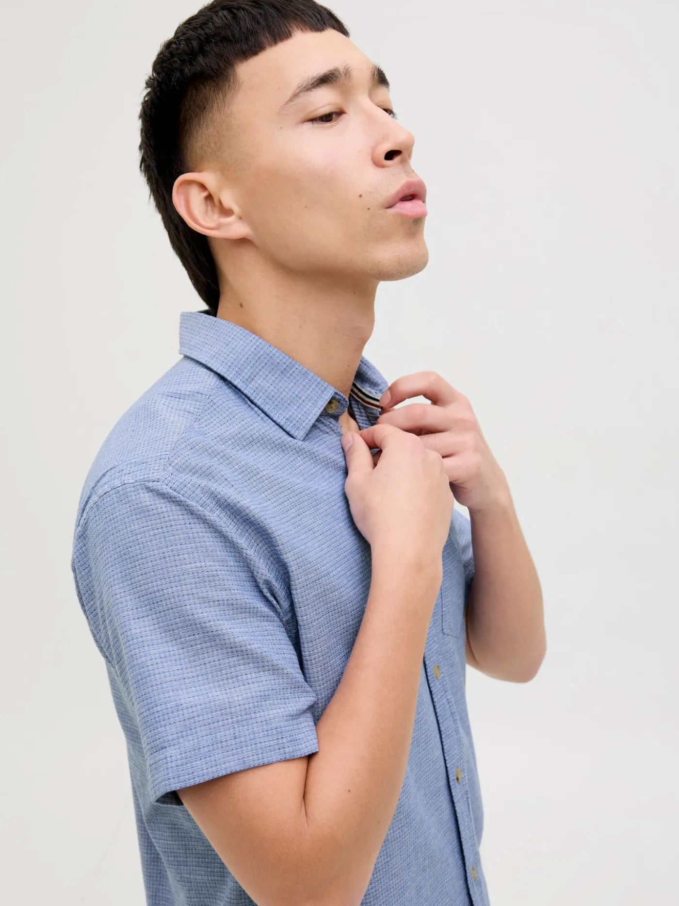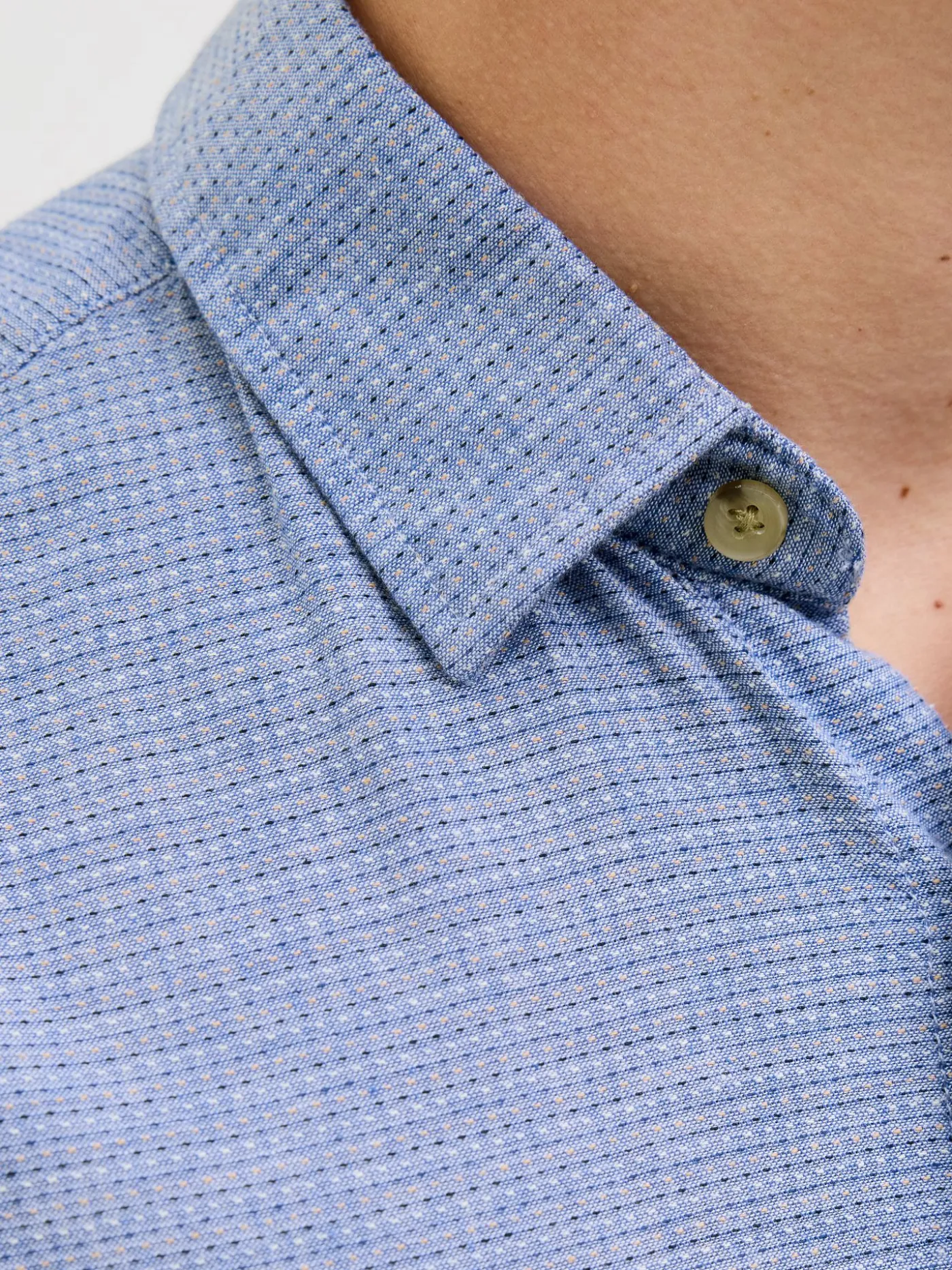 Een blauw Jack & Jones overhemd met een all-over print, casual en modern van stijl, met een donker blauwe kleur en een subtiele, verspreide print. Perfect voor een relaxte, maar stijlvolle look.