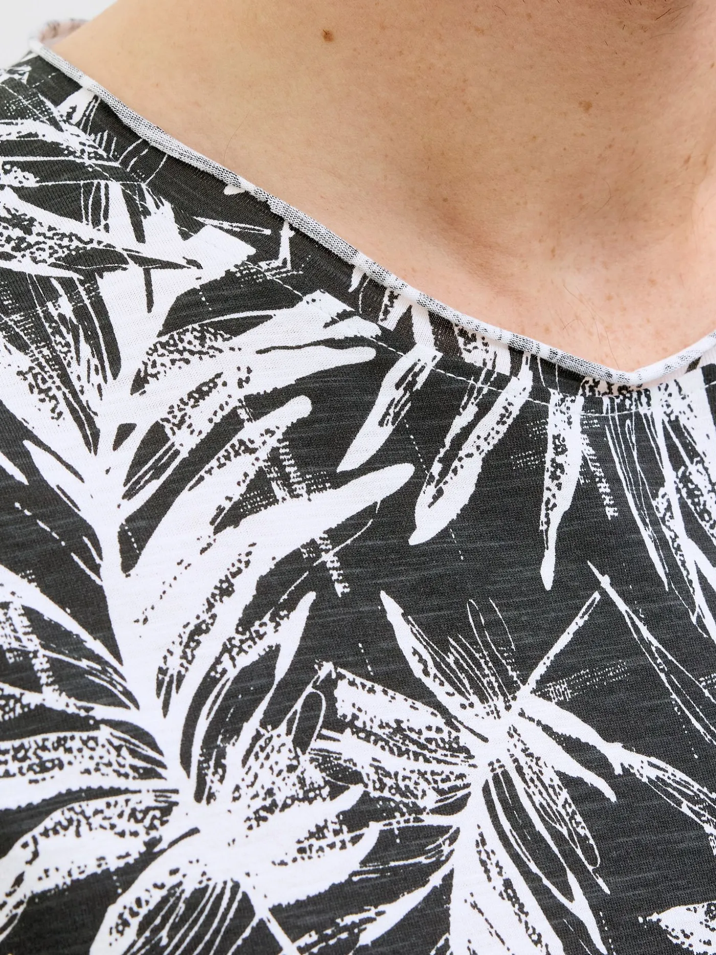 Dit zwart met witte t-shirt van Jack & Jones heeft een ronde hals en korte mouwen. het t-shirt zelf is zwart met witte bloemen en bladeren erop. Door de kleur is het item makkelijk te combineren. Je kunt dit item combineren met een korte broek en slippers voor een zomerse look.