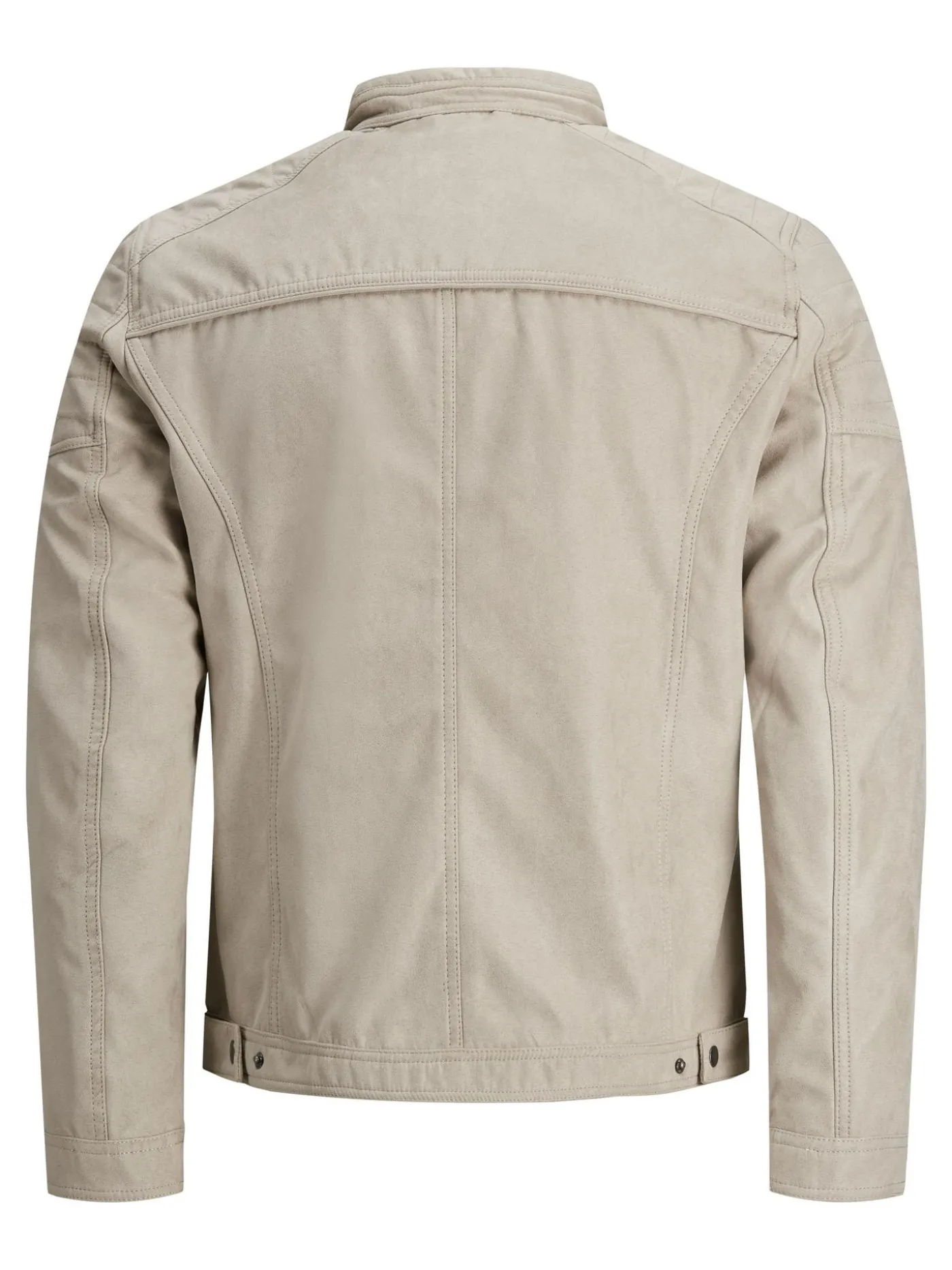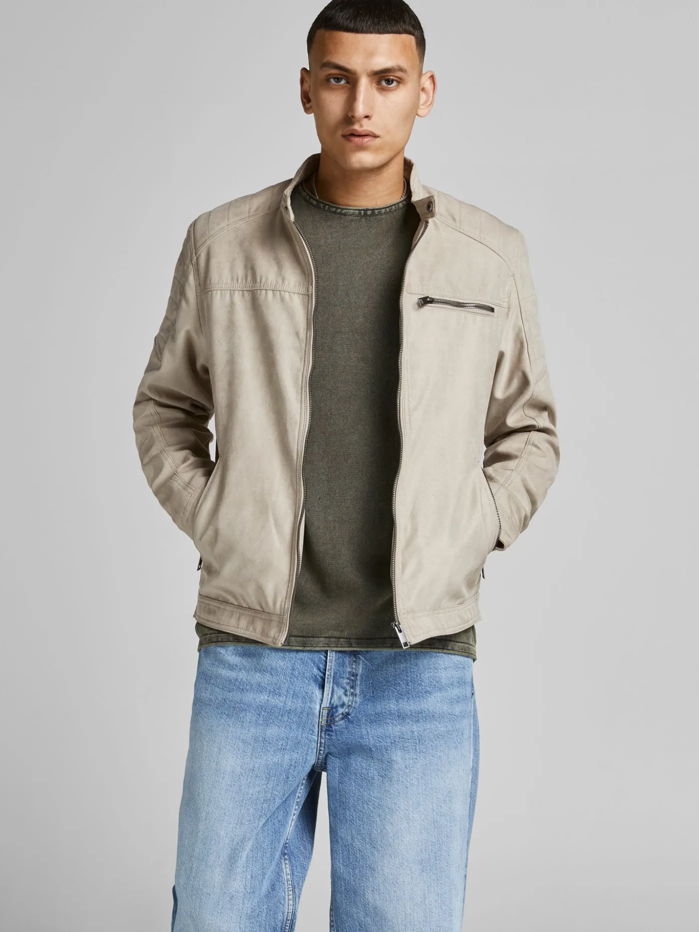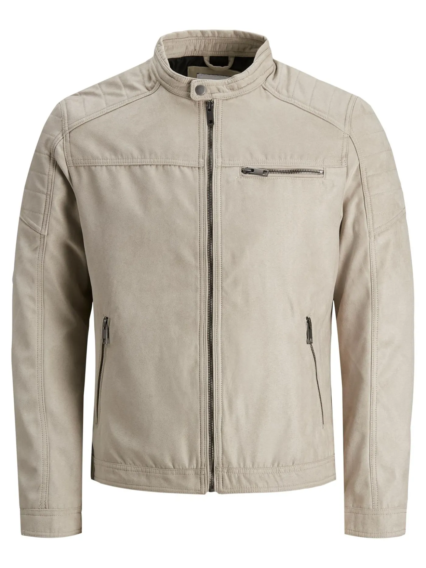 Deze jas van Jack & Jones is gemaakt van suéde het is voorzien van manchetten. Dit model heeft een ronde hals met een drukknoop en sluit met een rits. Ook heeft het een borstzak die sluit met een rits, twee ritszakken aan de voorkant en een binnenzak.
