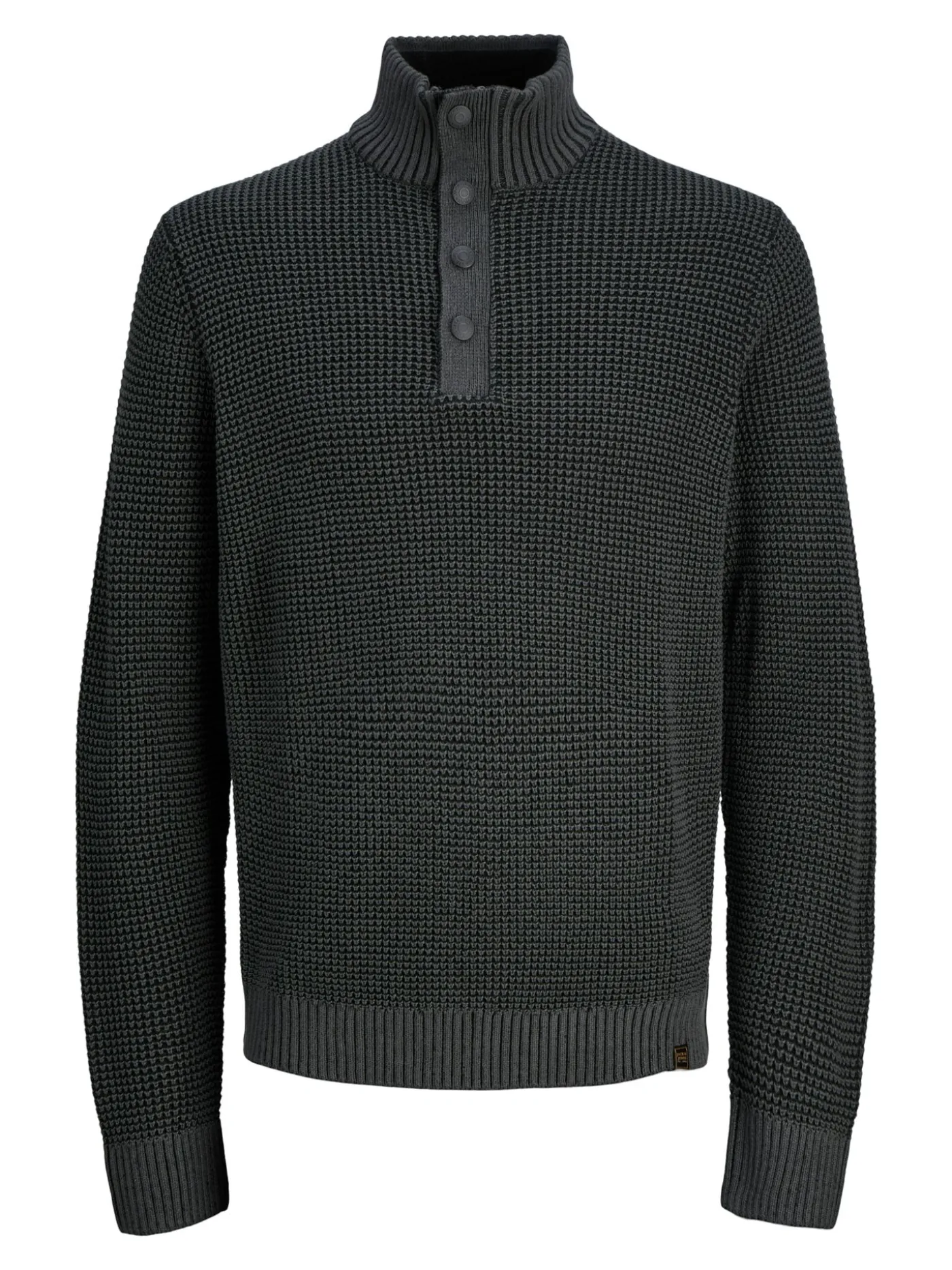 Deze donkergrijze trui biedt een perfecte balans tussen comfort en stijl. Het grofgebreide patroon geeft de trui een moderne, stoere uitstraling, terwijl de hoge kraag met drie knopen zorgt voor een veelzijdige look. Draag de kraag open voor een ontspannen uitstraling of gesloten voor extra warmte.De trui heeft een regular fit die comfortabel zit en makkelijk te combineren is met zowel casual als nette outfits. De geribde boorden aan de mouwen en zoom zorgen voor een aansluitende pasvorm en een verzorgde afwerking. De trui is verkrijgbaar in drie kleuren.