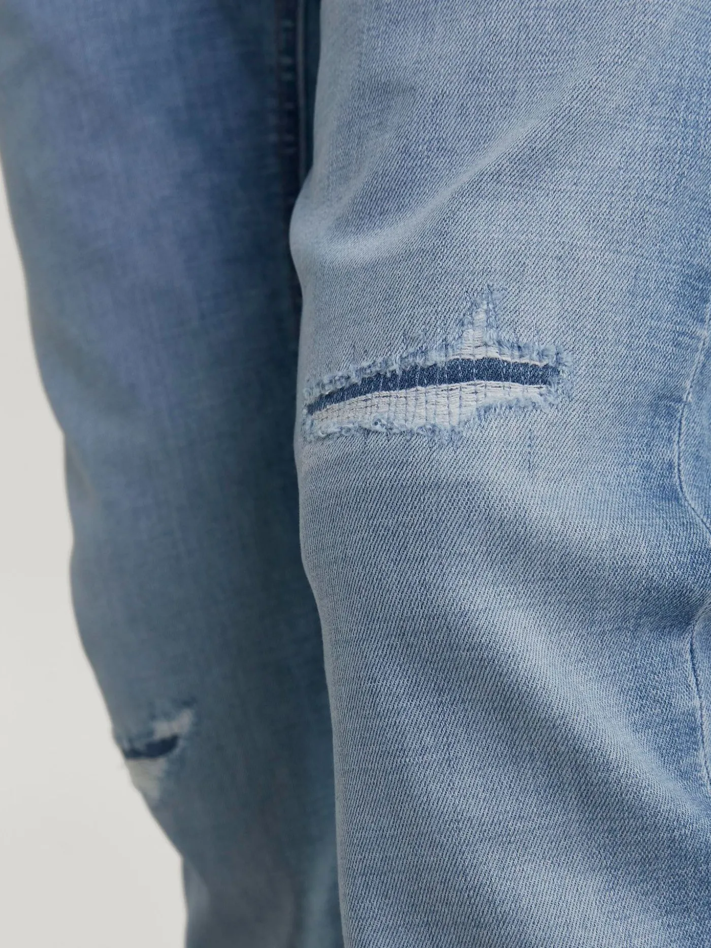 Lichtblauwe Slim fit jeans van Jack & Jones voor heren. Deze broek heeft een 5-pocket model en sluit doormiddel van knoopsluitingen. Hij heeft een regular waist en is voorzien van kniescheuren wat de broek een stoerdere look geeft.