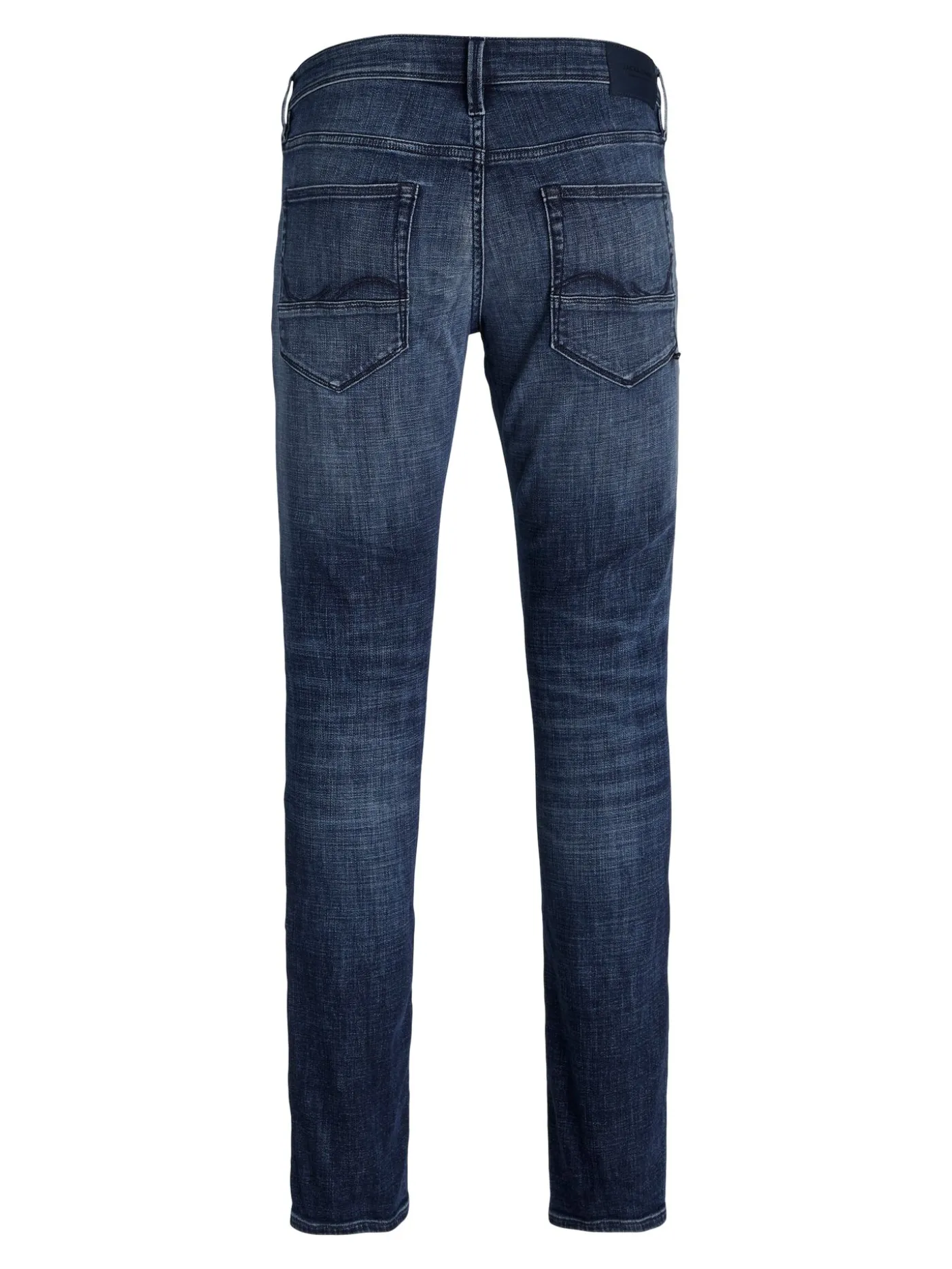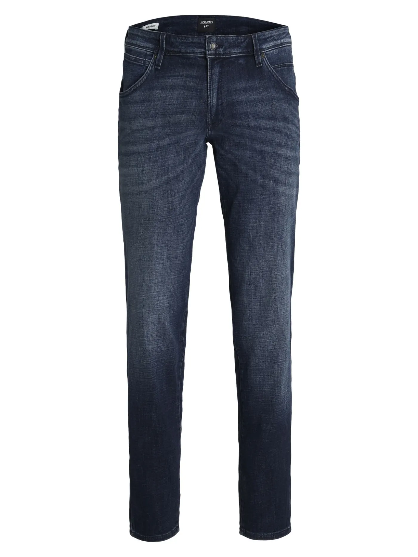 Donkerblauwe Slim fit jeans van Jack & Jones voor heren. Deze broek heeft een 5-pocket model en sluit doormiddel van knoopsluitingen. Hij heeft een regular waist en is voorzien van een lichte wassing.