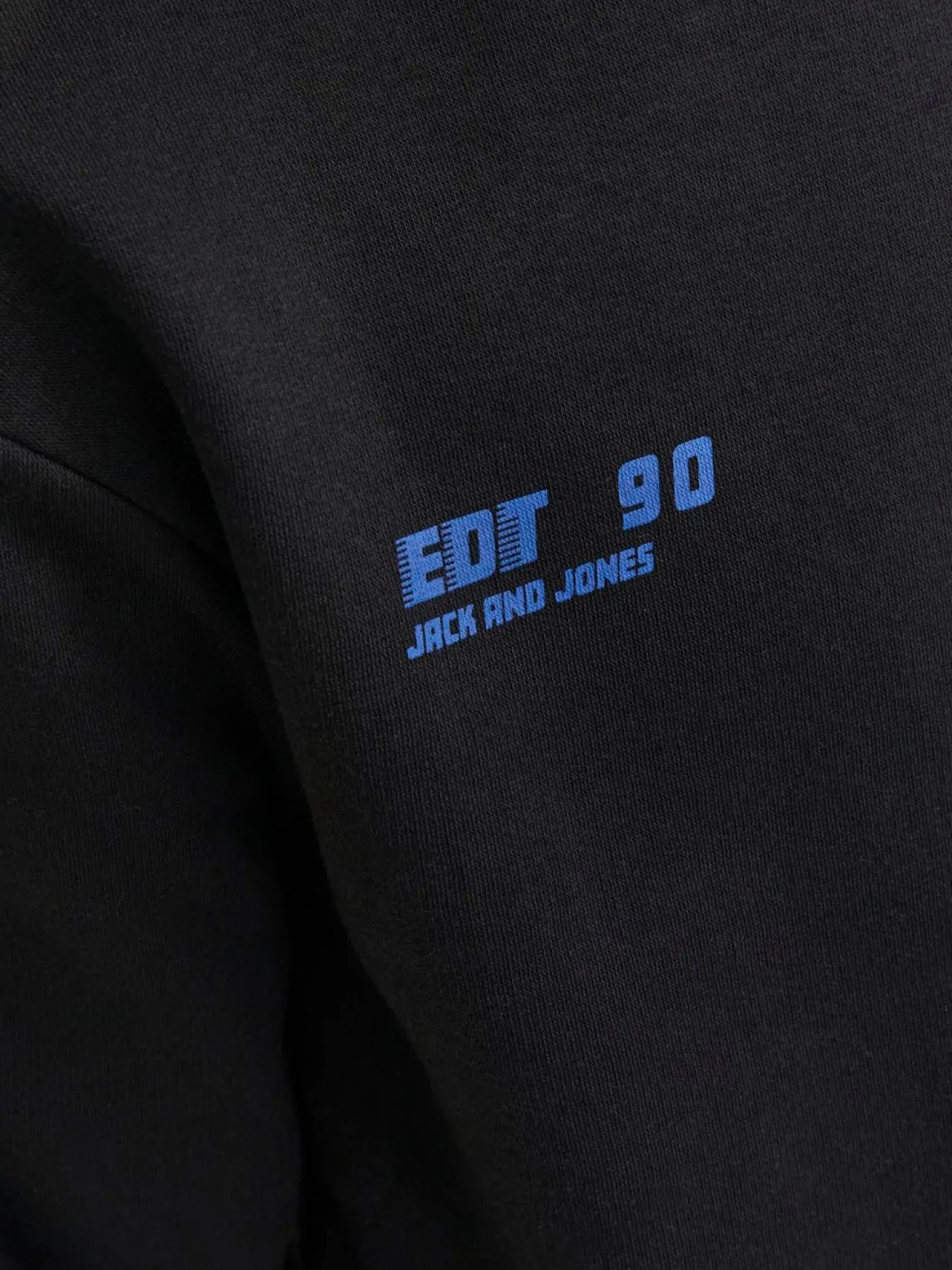 Deze zwarte trui van Jack & Jones combineert comfort met een stoere, moderne uitstraling. Op de rechterborst staat in blauw EDT 90, met daaronder Jack & Jones, ook in blauw. Op de achterkant is hetzelfde detail te zien, maar dan groter: EDT 90 en Jack & Jones in blauw, waardoor de trui een opvallend en herkenbaar statement maakt. De zachte stof zorgt voor een comfortabele pasvorm, perfect voor dagelijks gebruik. Een ideale trui voor jongens die een sportieve en stijlvolle look willen met extra impact.