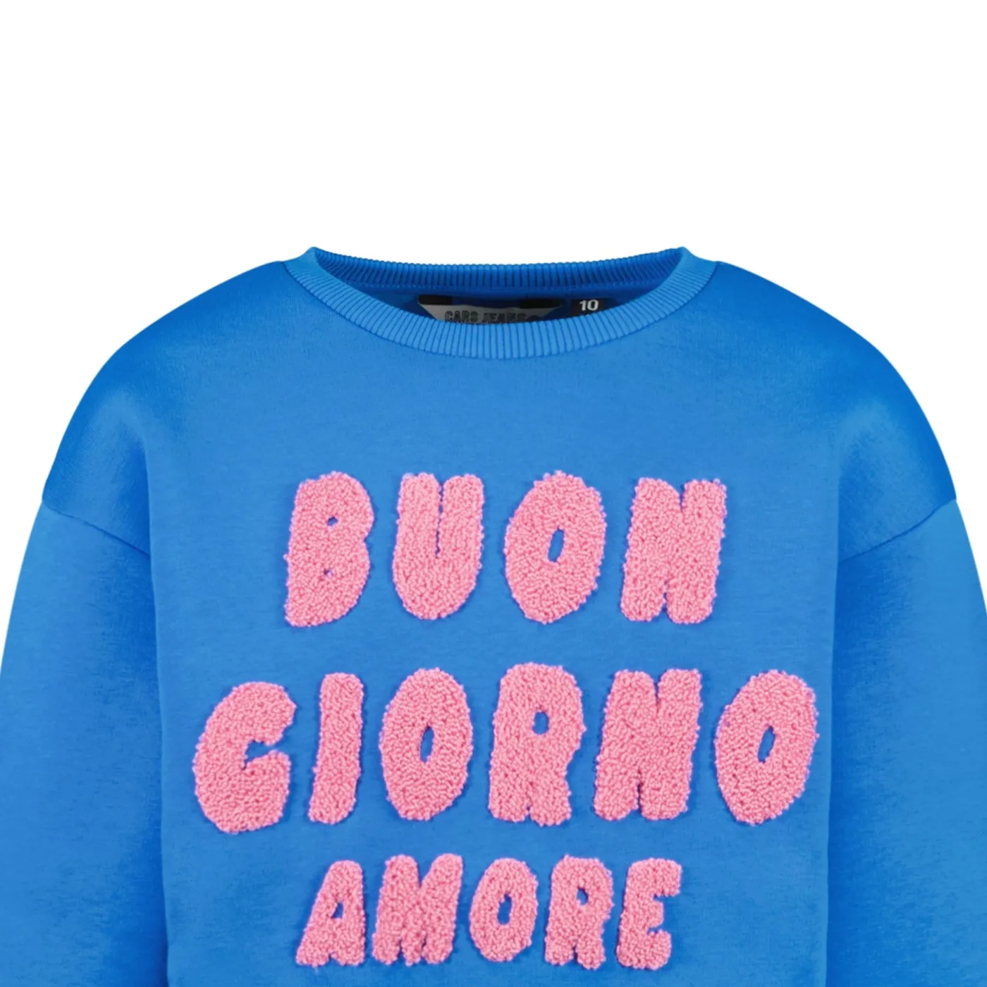Deze blauwe sweater heeft een 3D opdruk van roze letters met de tekst ´Buon ciorno amore´. De sweater heeft lange mouwen en een crew neck. Door de zachte binnenkant is deze sweater extra lekker voor de winter.