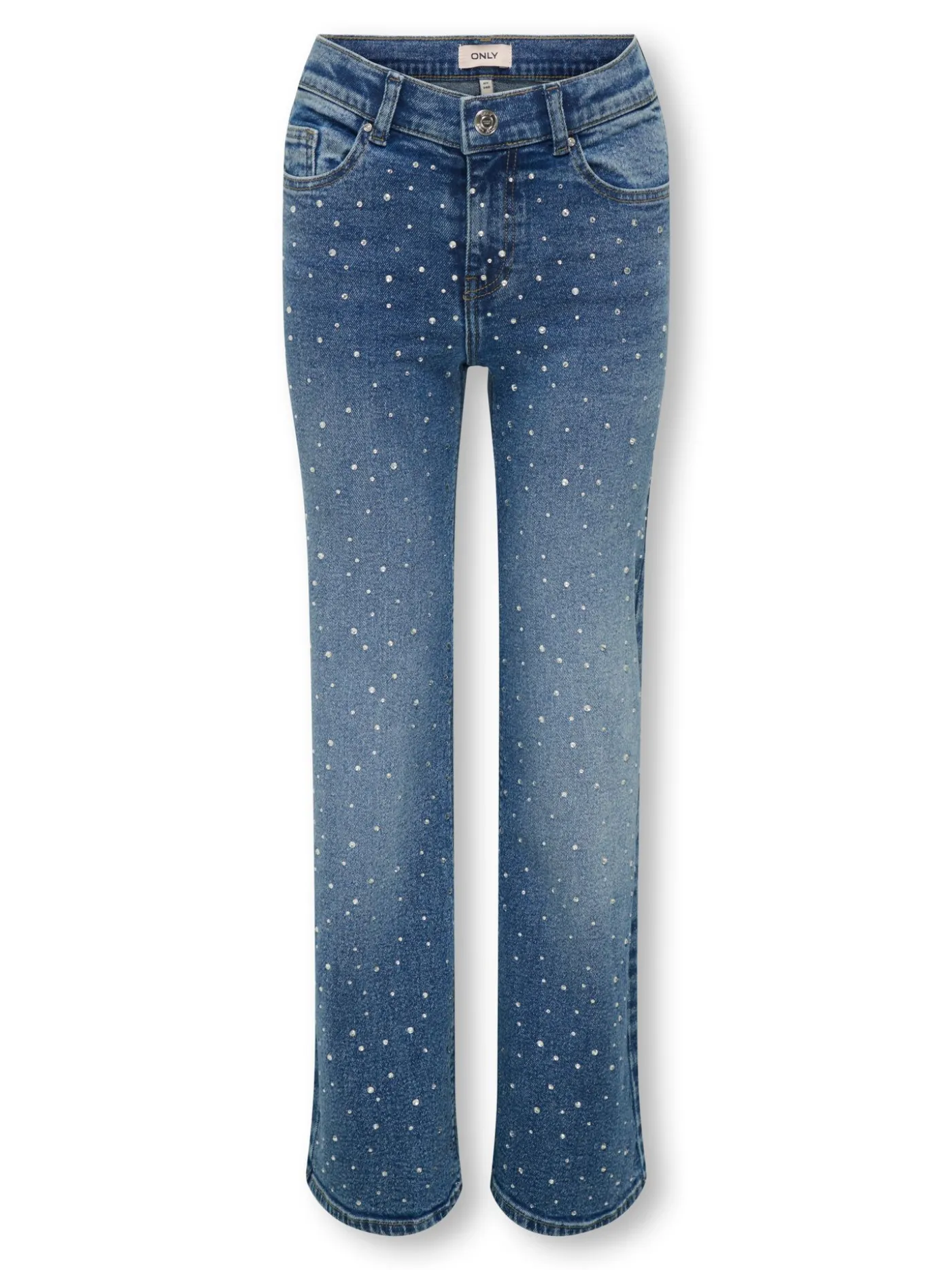 Deze wide leg jeans van de Only kids collectie is een echte eye-catcher. De broek heeft een mooie blauwe wassing en heeft een de voorkant allemaal glittersteentjes. Dit geeft een speels effect aan de broek. Je kunt dit item dagelijks dragen maar uiteraard ook voor een leuk feestje.