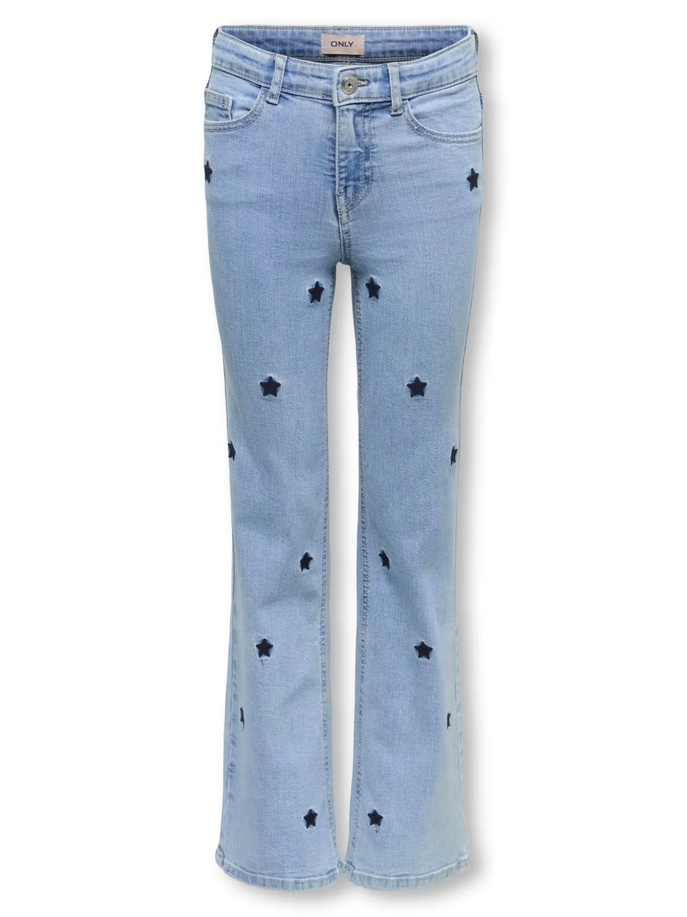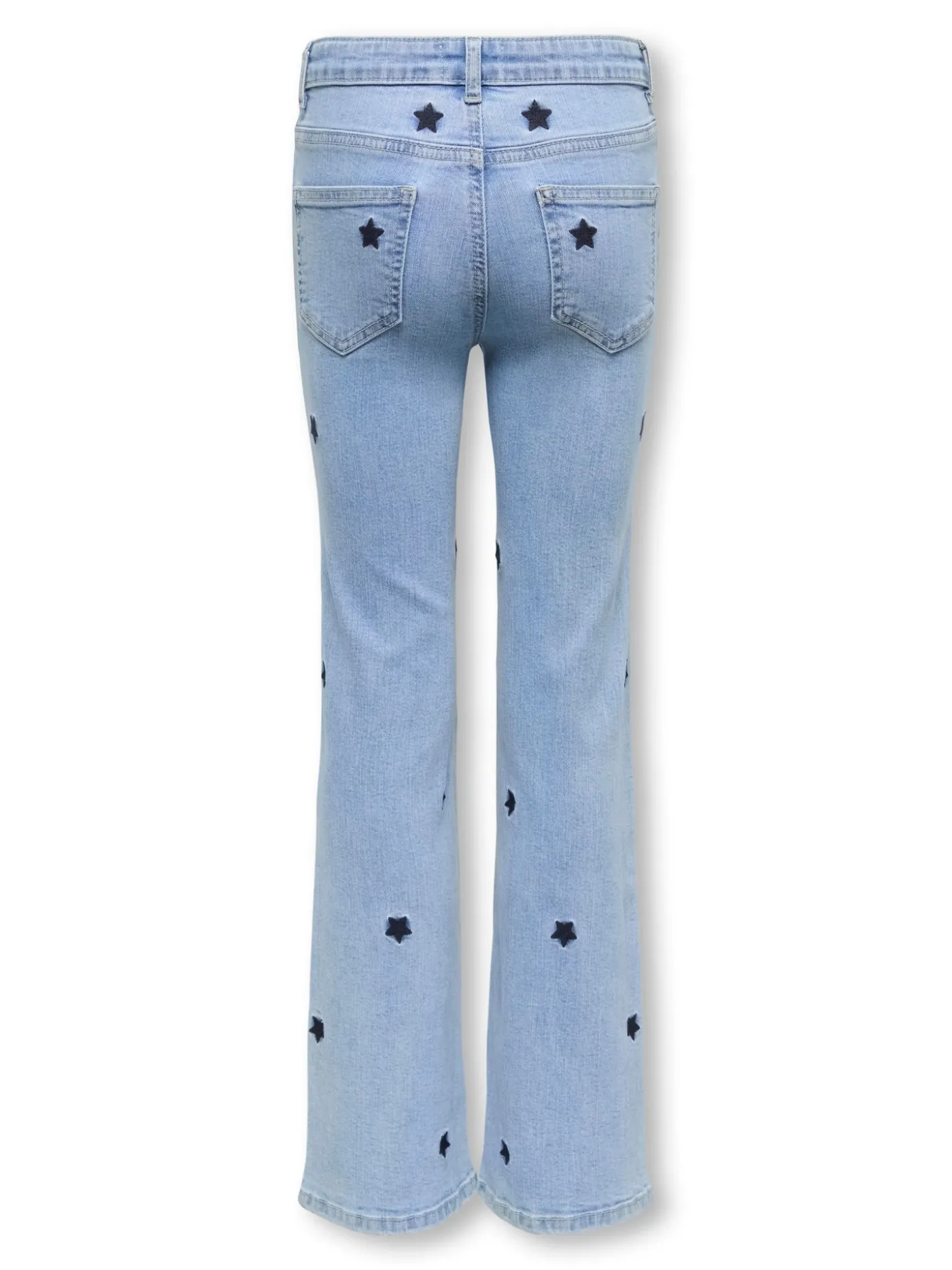 Deze spijkerbroek ONLY KOGJUICY WIDE LEG STAR JEANSheeft een wijd uitlopende broekspijp en is uitgevoerd in lichtblauw denim. Hij is ontworpen met extra ruimte van de heup tot de enkel, waardoor hij comfortabel zit en goed past bij een ontspannen, modieuze look. De verstelbare taille zorgt voor een goede pasvorm. Ideaal voor een trendy outfit op school of in het weekend.