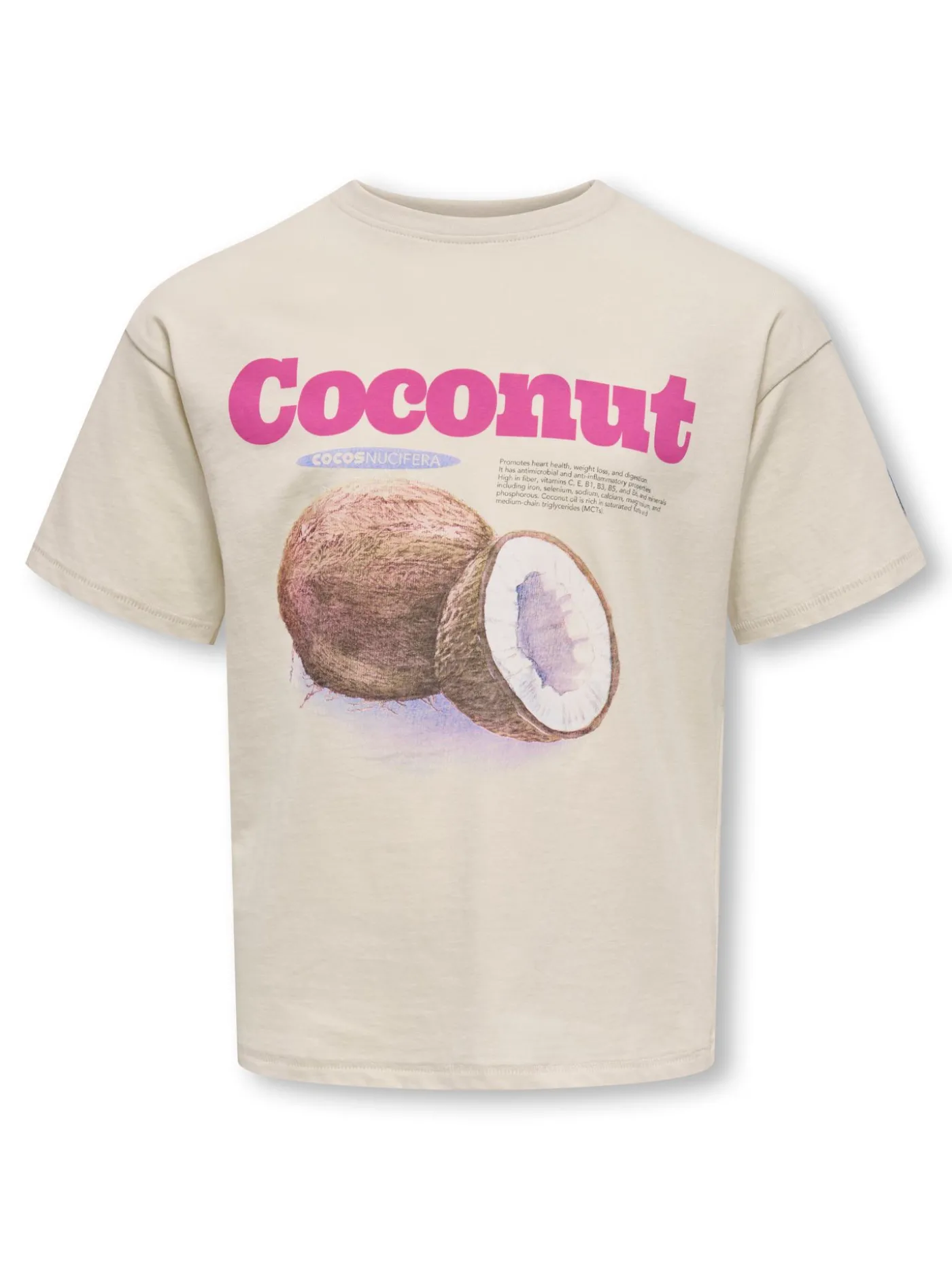 Dit katoenen t-shirt van Only is één perfecte toevoeging aan jouw kledingkast. Het t-shirt heeft korte mouwen en op de voorkant van het shirt staat een kokosnoot. Het t-shirt is makkelijk te combineren met bijvoorbeeld een leuke jeansshort of een leuke rok.
