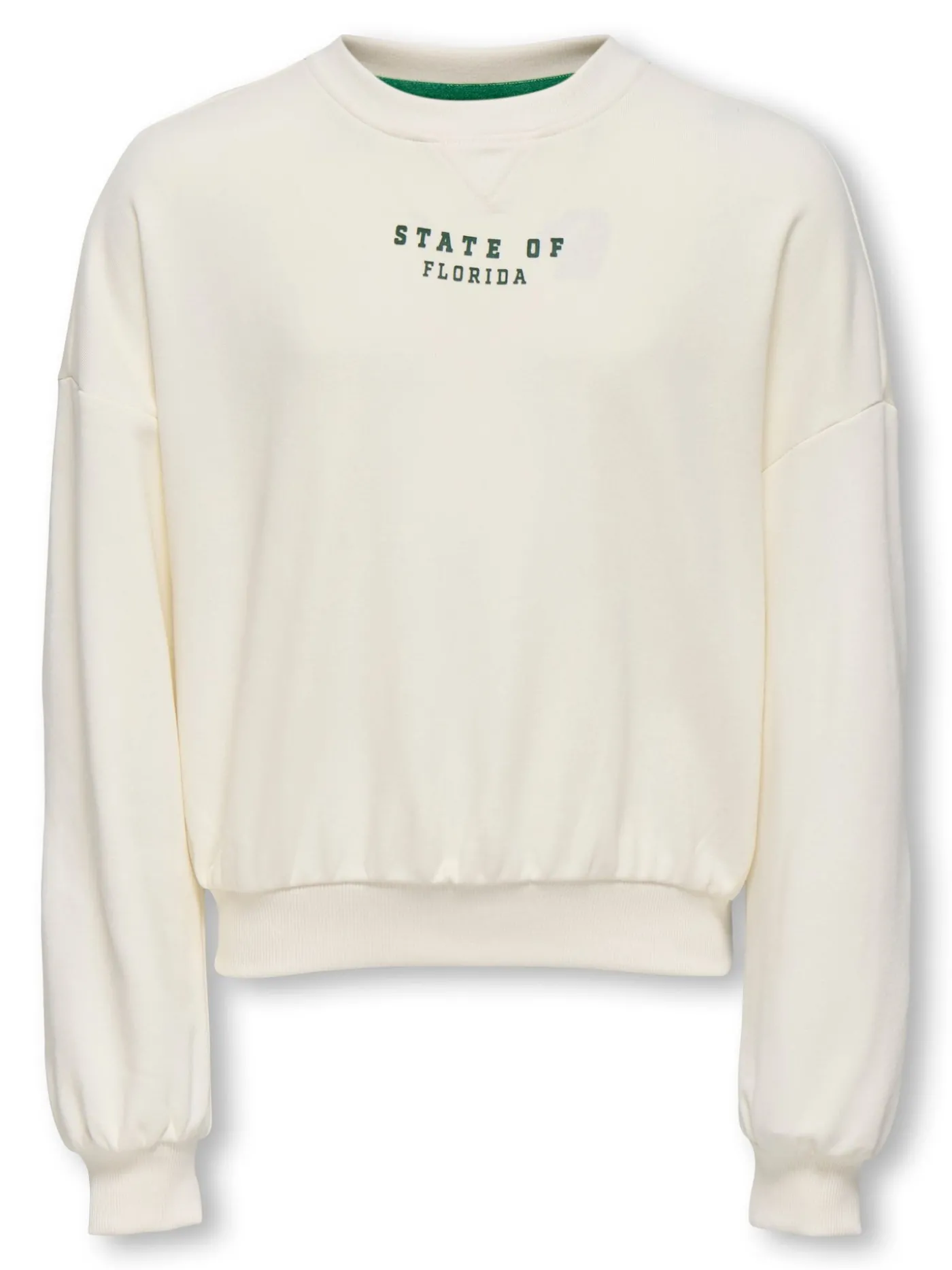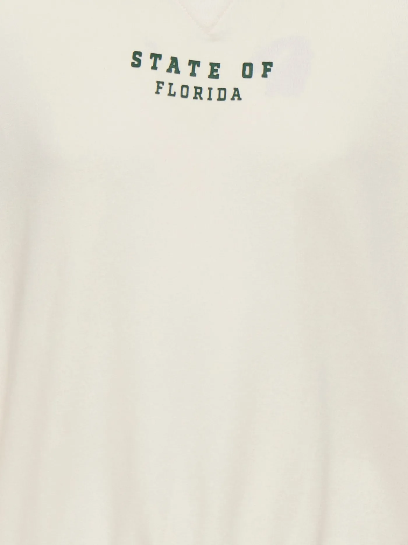 Deze crèmekleurige sweater combineert comfort en stijl dankzij de warme, zachte binnenkant. Op de voorkant van de sweater staat subtiel in groene letters “state of florida” en aan de achterkant een gedurfde print voor een moderne, sportieve uitstraling. De ronde hals en geribde boorden aan mouwen en taille zorgen voor een optimale pasvorm. Een sweater die makkelijk te combineren is!