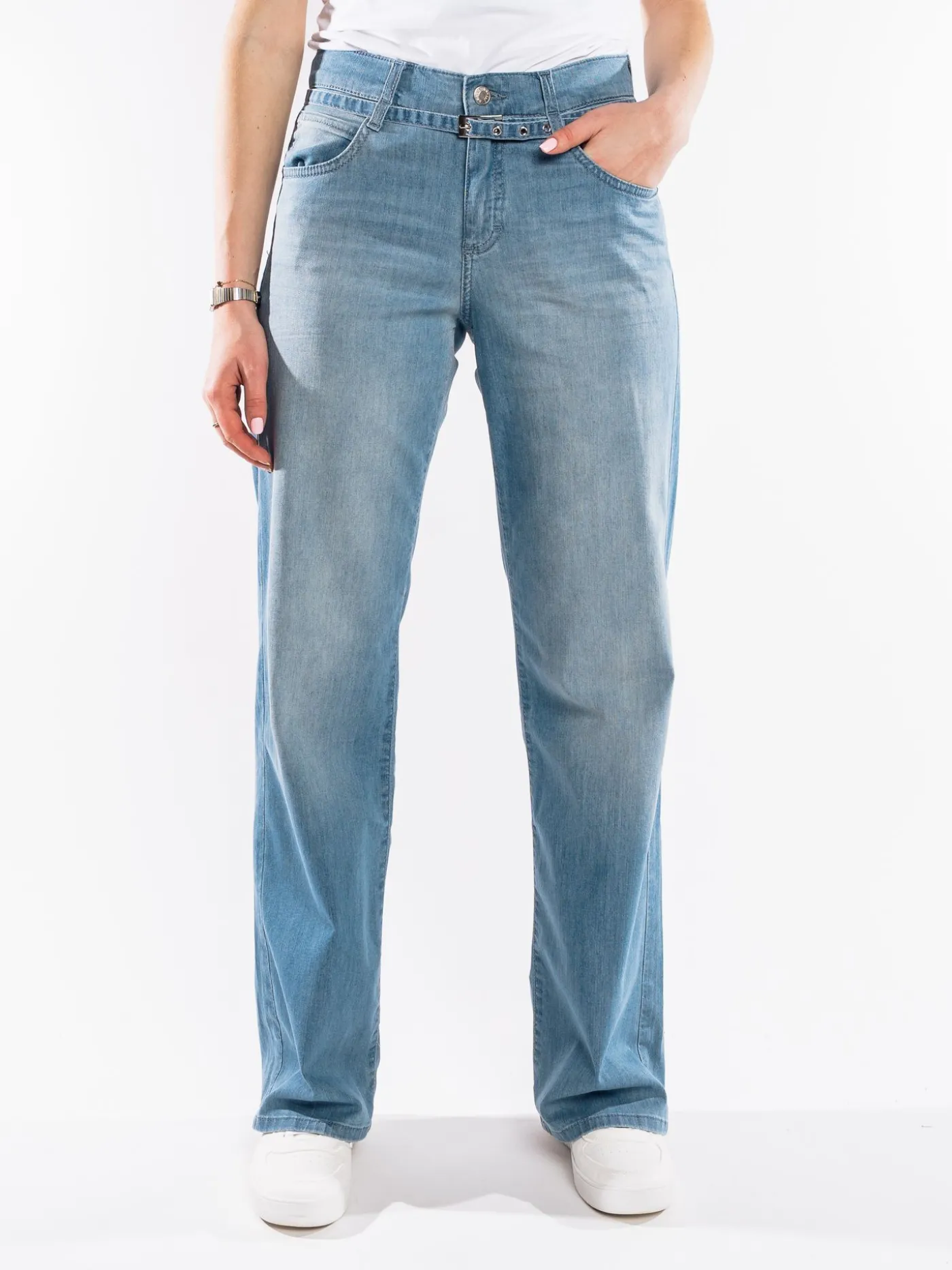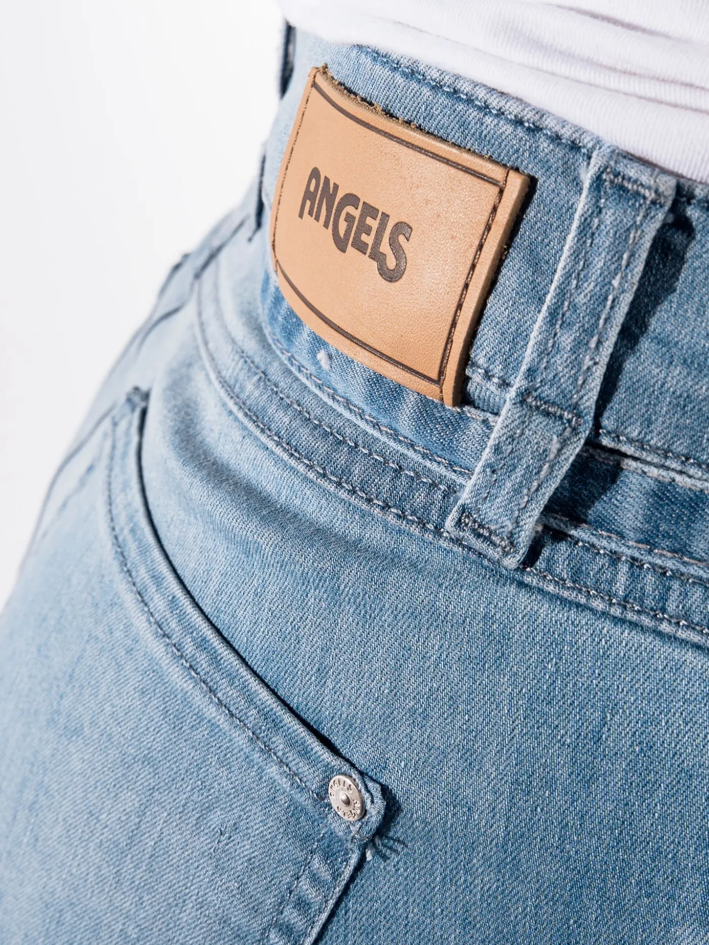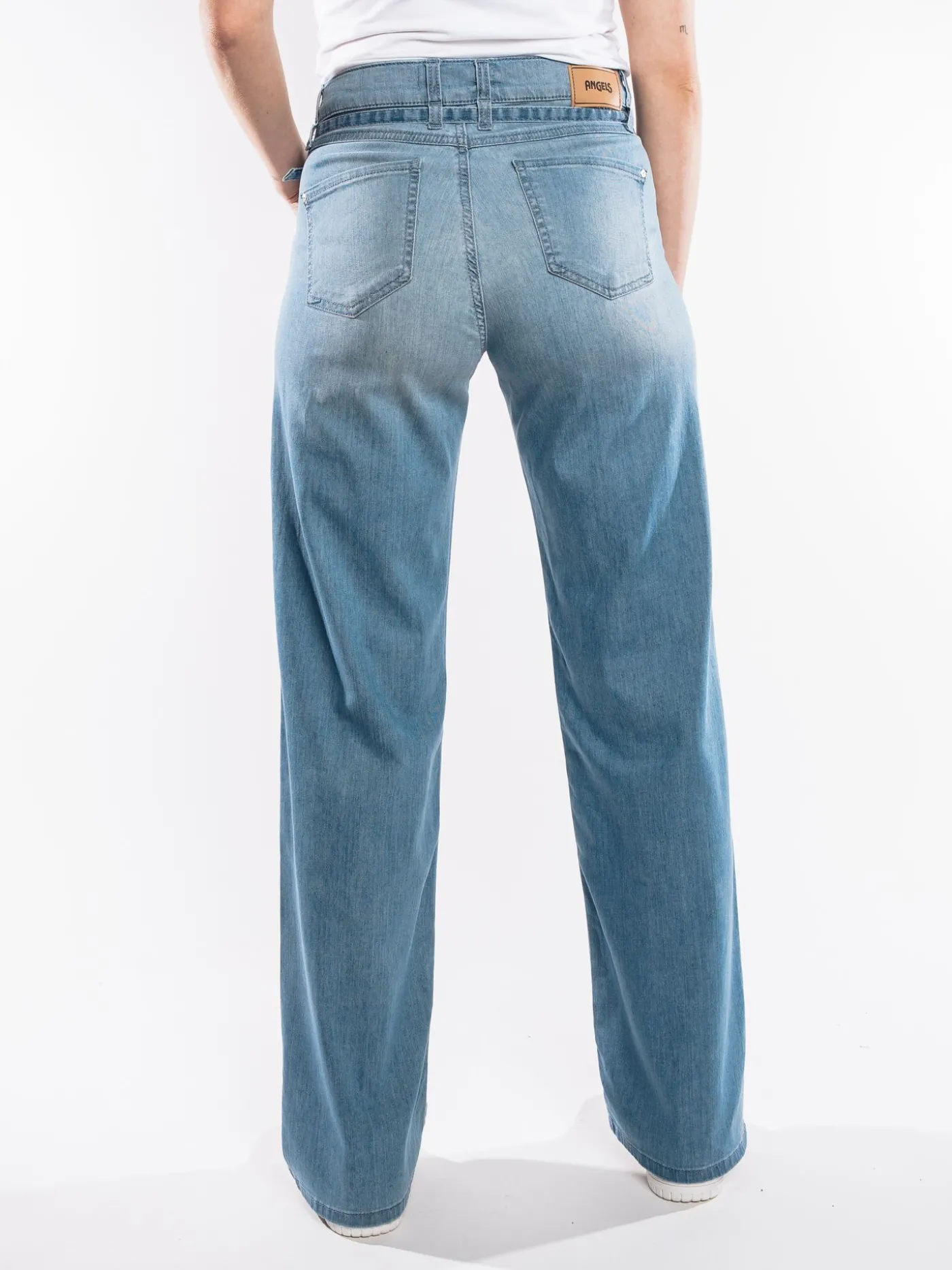 Jeans van het merk Angels in een blauwe kleur. Dit item heeft twee zakken aan de voor -en achterzijde, knoop -en ritssluiting en een riempje. Leuk te combineren met een T-shirt en sneakers.