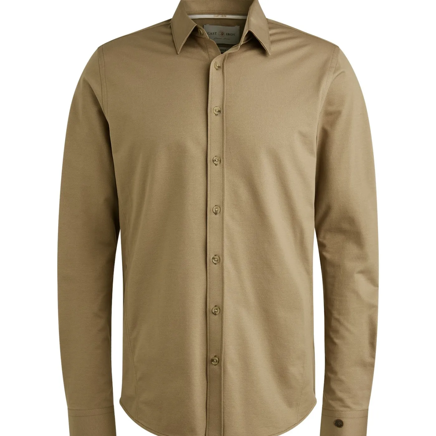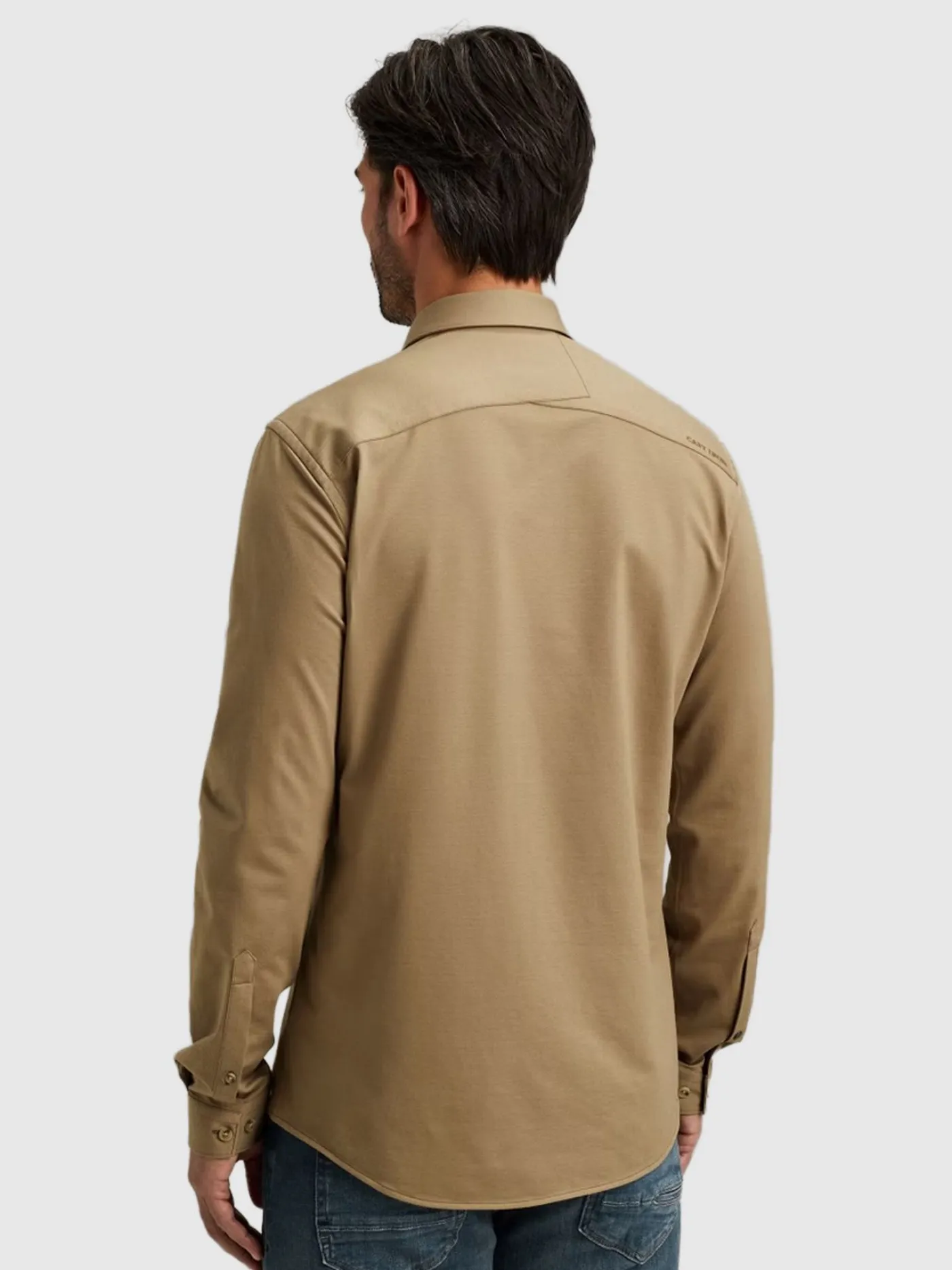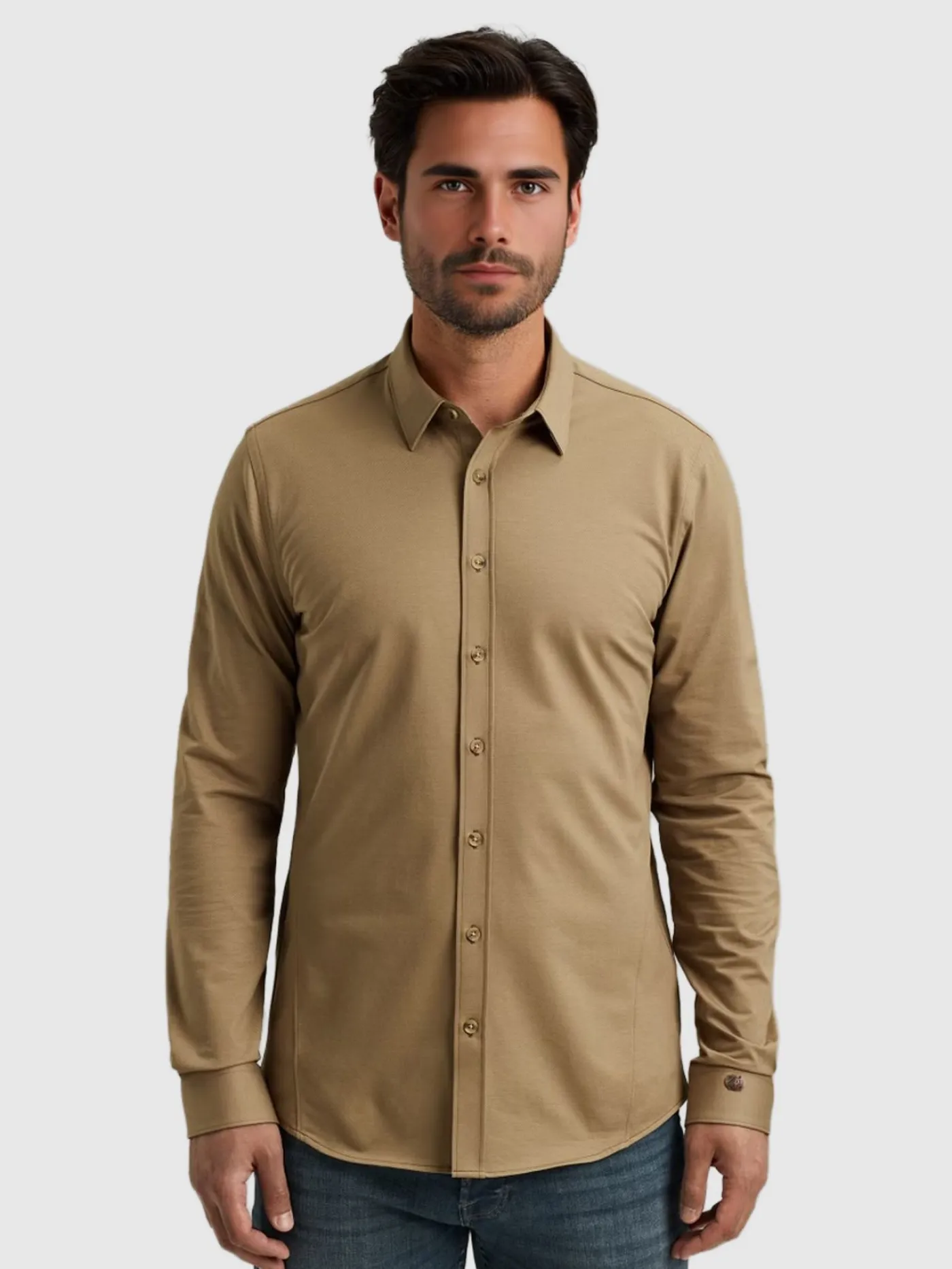 Dit stijlvolle overhemd in een licht bruine tint is een moderne essential voor elke garderobe. Gemaakt van een zachte, soepele stretchende stof biedt het de perfecte balans tussen het uiterlijk van een net overhemd en het comfort van een T-shirt. De minimalistische afwerking en subtiele details zorgen voor een verfijnde look die zowel formeel als casual gedragen kan worden.