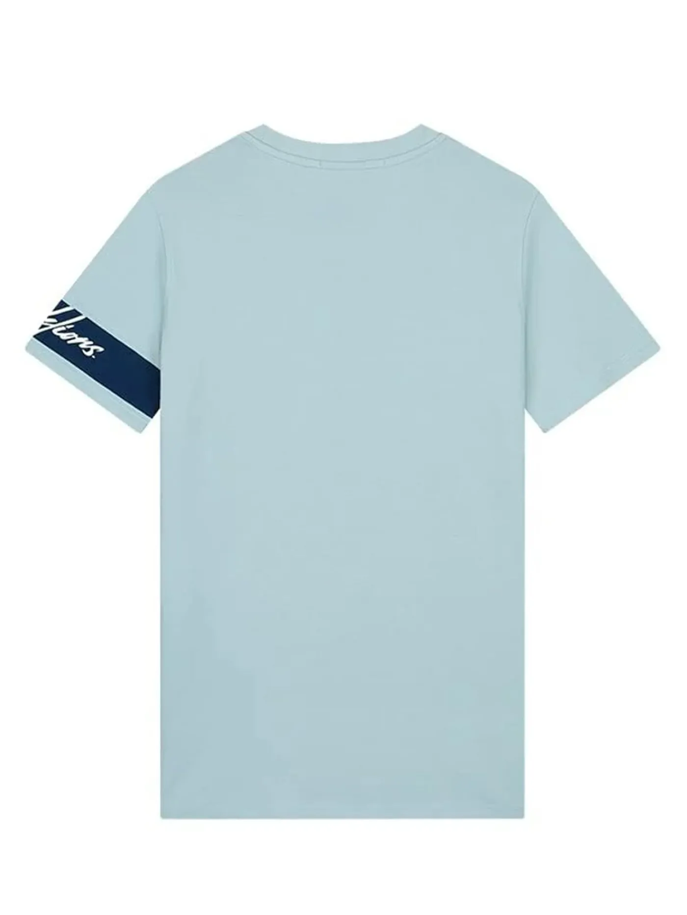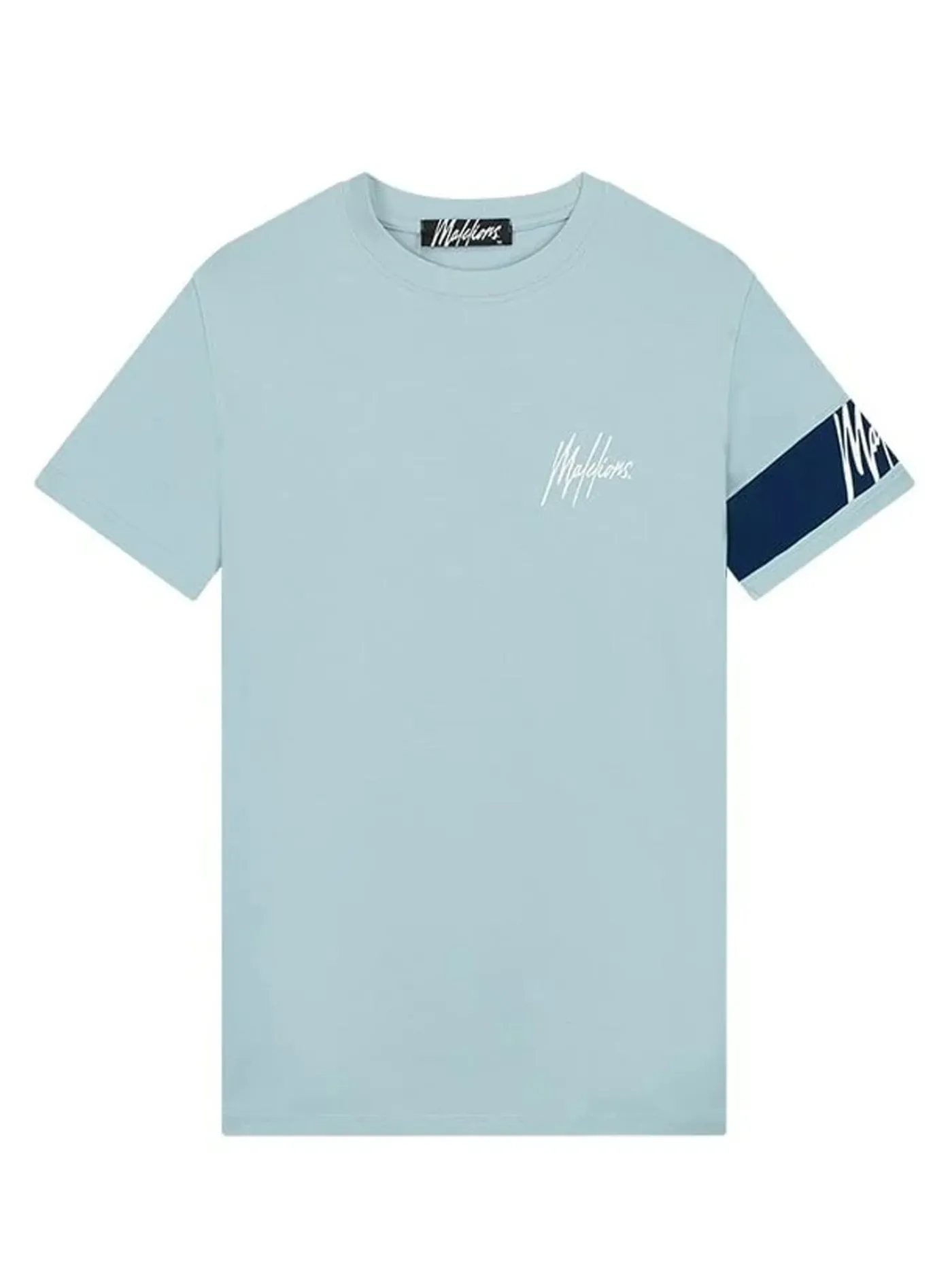 T-shirt van het merk Malelions met logo op de voorkant en op de arm een band met logo erop. het T-shirt heeft ronde hals en korte mouwen.
