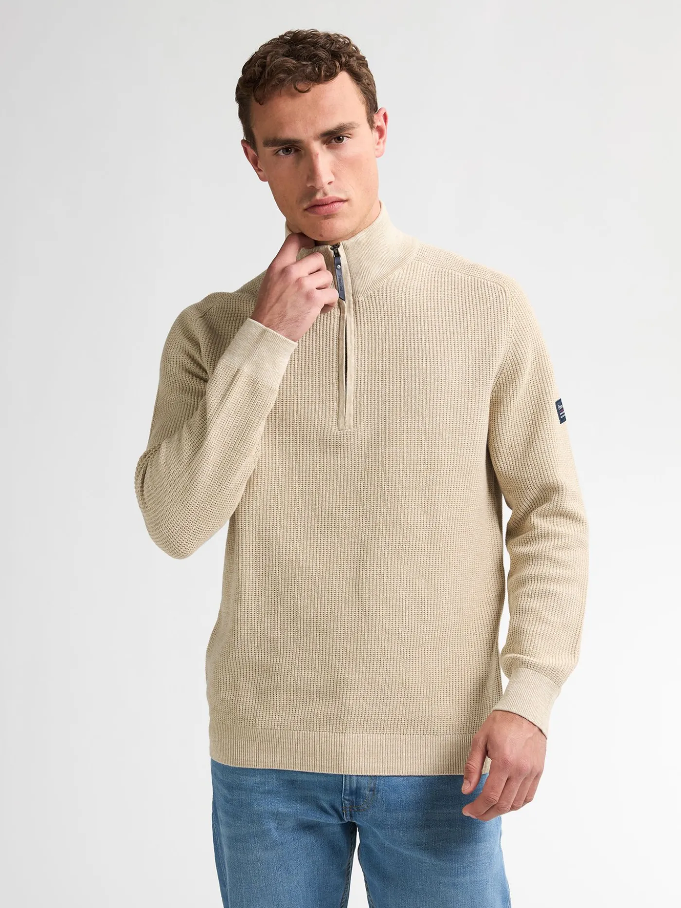 Dit is een stijlvolle heren trui met een moderne, verfijnde uitstraling, perfect voor het najaar en de winter. De trui is vervaardigd uit een fijngebreide stof die zorgt voor optimale warmte en comfort. Het ontwerp heeft een halfhoge kraag met een praktische ritssluiting, waardoor de trui zowel functioneel als modieus is. De lichtbeige kleur maakt deze trui gemakkelijk te combineren met diverse outfits, terwijl de subtiele structuur in de stof een extra dimensie aan het design toevoegt. Een tijdloos kledingstuk dat perfect is voor zowel ontspannen weekenddagen als verzorgde casual outfits.