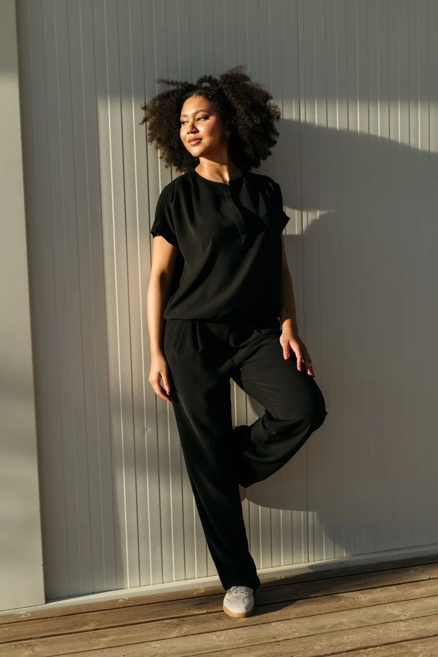 dit is een T-shirt van &Co Women in de kleur zwart het heeft elastische banden in het middenstuk en het heeft een v-hals. omdat het zo lekker luchtig is het een perfecte shirt voor in de zomer.