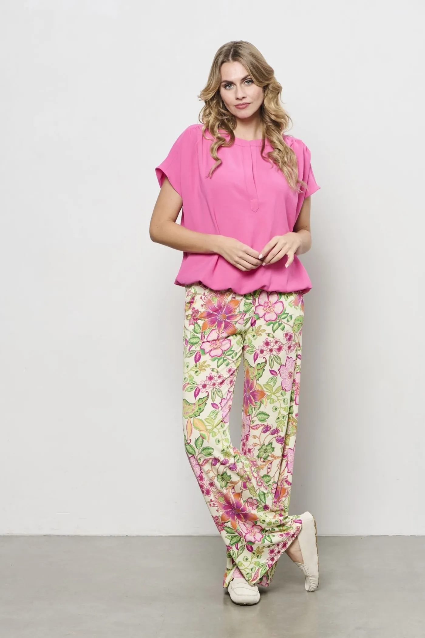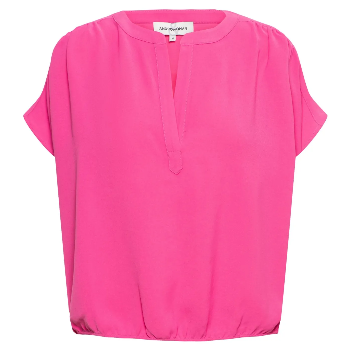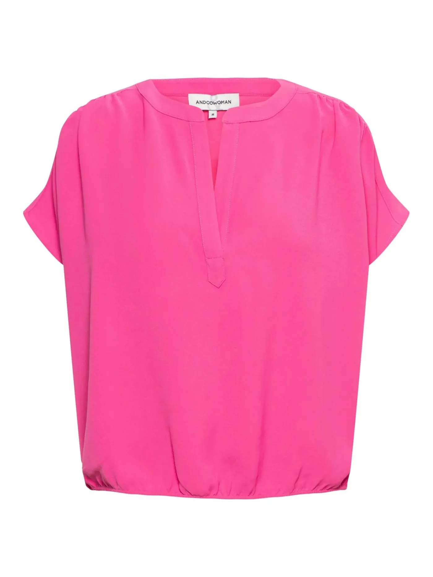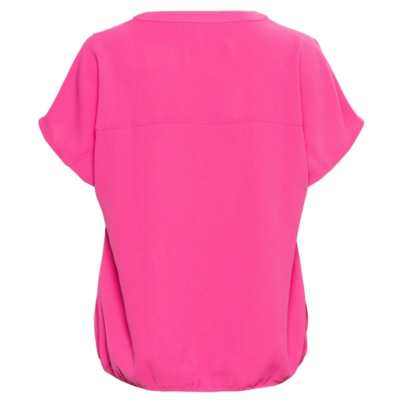 Deze vrolijke roze top is van de nieuwste collectie van &Co Woman. De top heeft korte mouwen en een v-hals. Ook heeft de top een elastieken band aan de onderkant. Je kunt deze top leuk combineren met een lichtgekleurde jeans en een zwarte blazer.