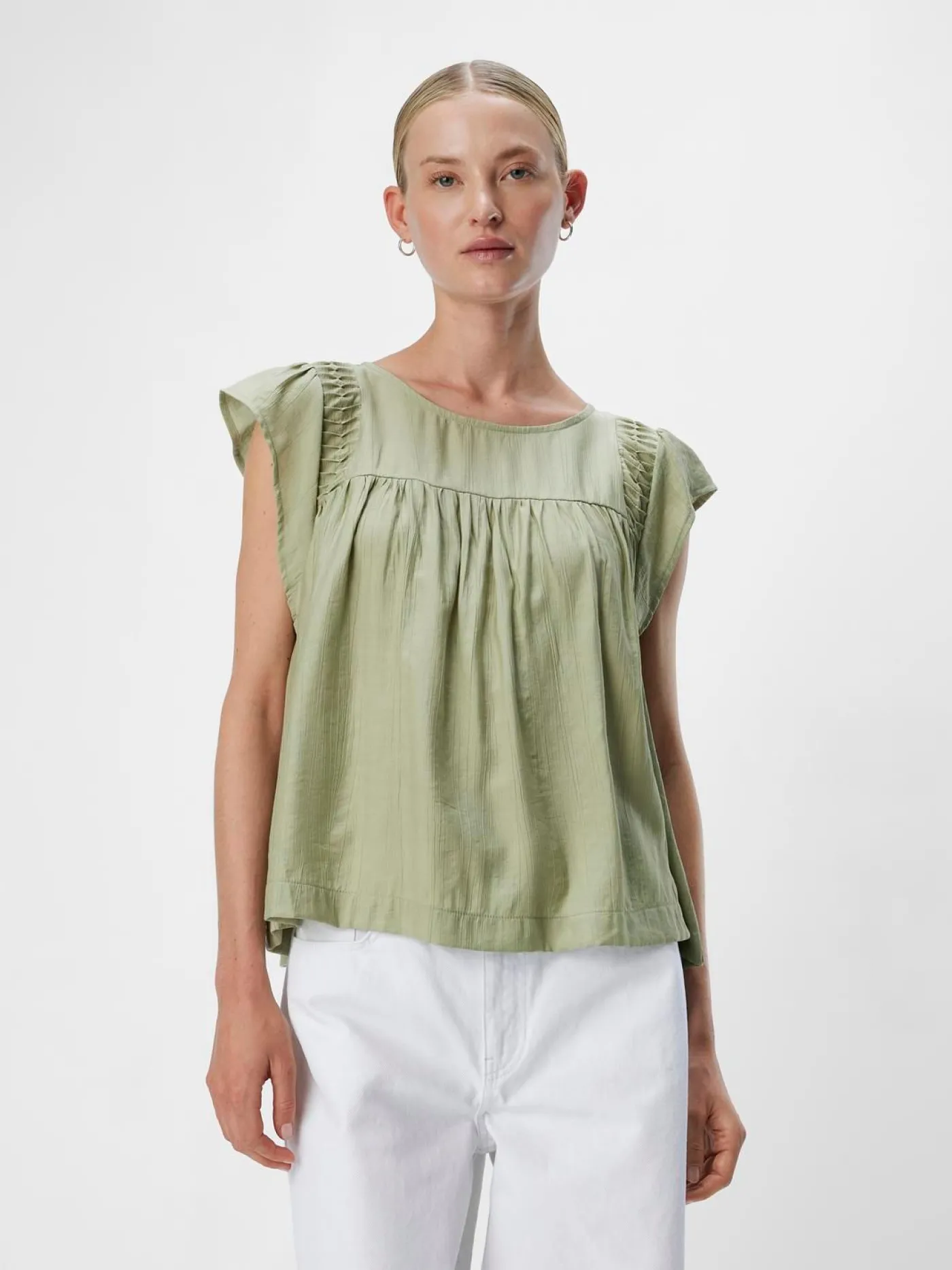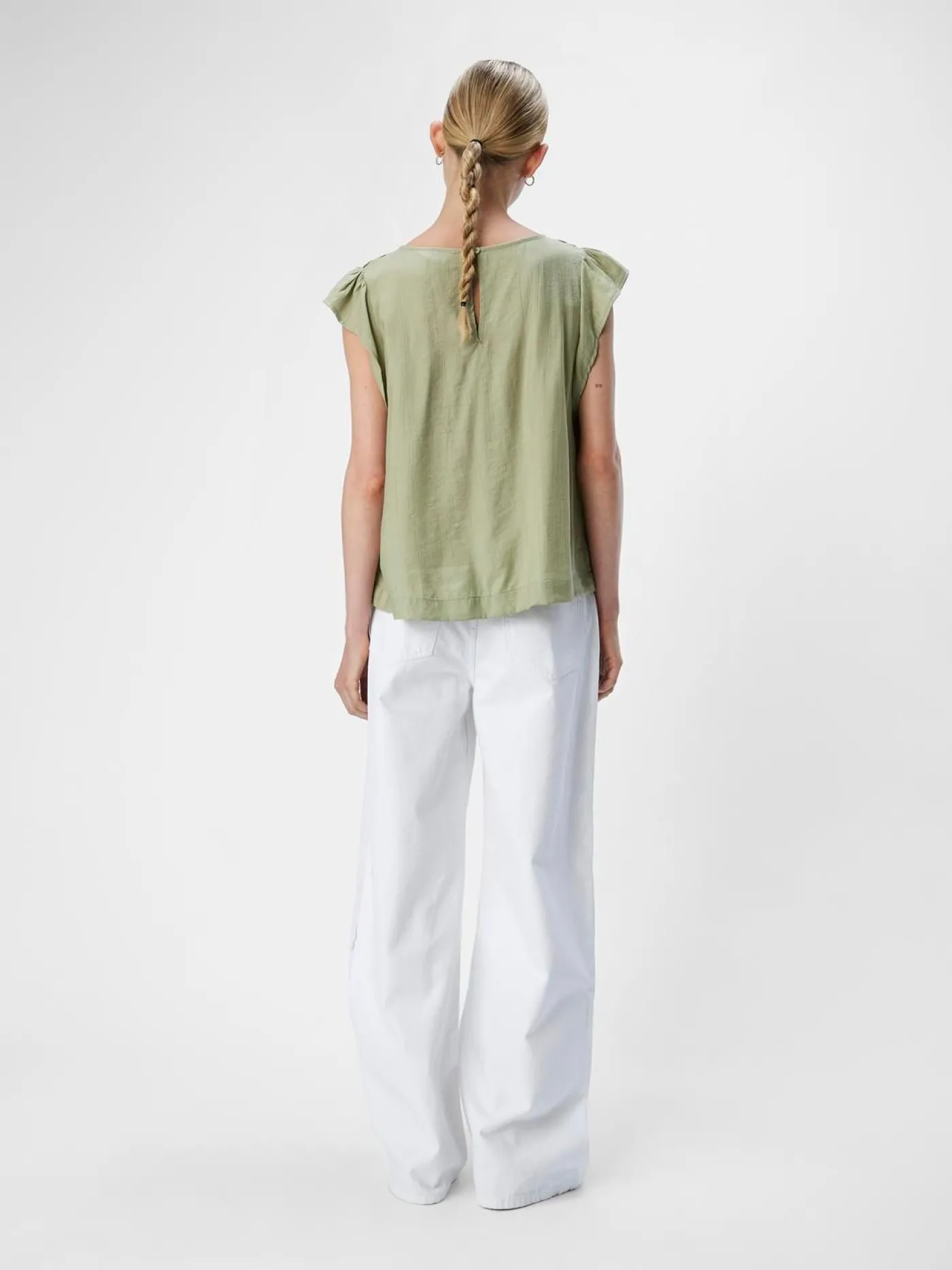 Vrolijke blouse van het merk Object. De blouse heeft korte kapmouwtjes en een structuur op de schouders. Verder sluit de blouse achteraan met een knoopje. Leuk te combineren met een jeans of korte broek!