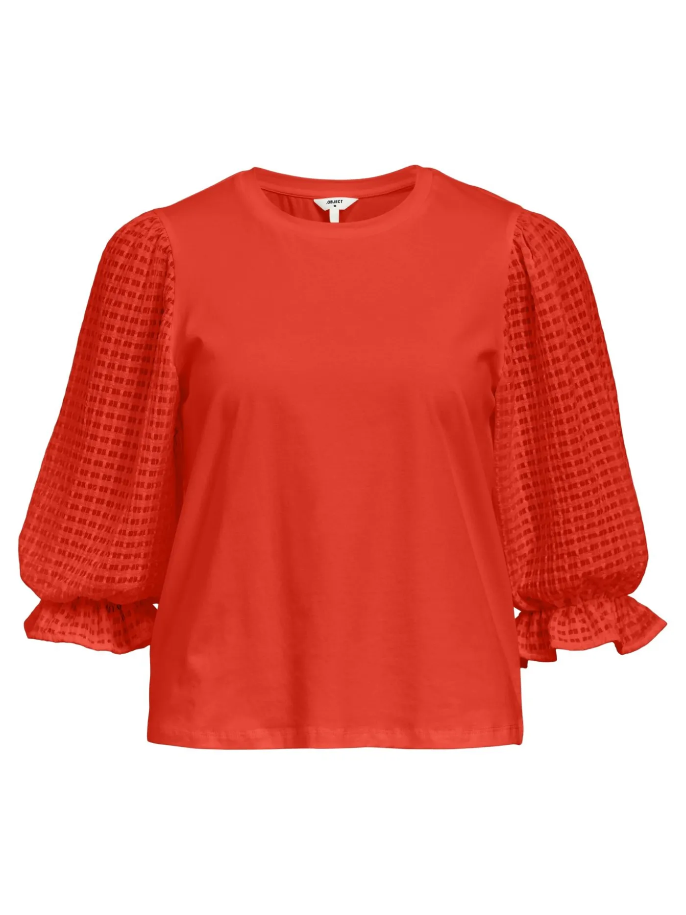 Top van het merk Object in een rode kleur. Dit item heeft een ronde hals en lange mouwen die doorschijnend zijn.