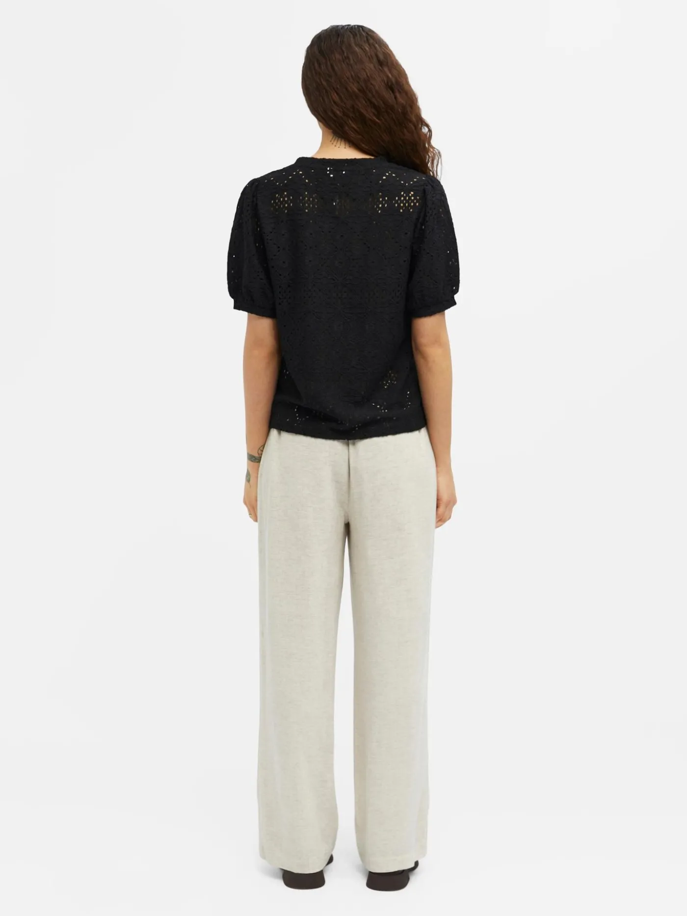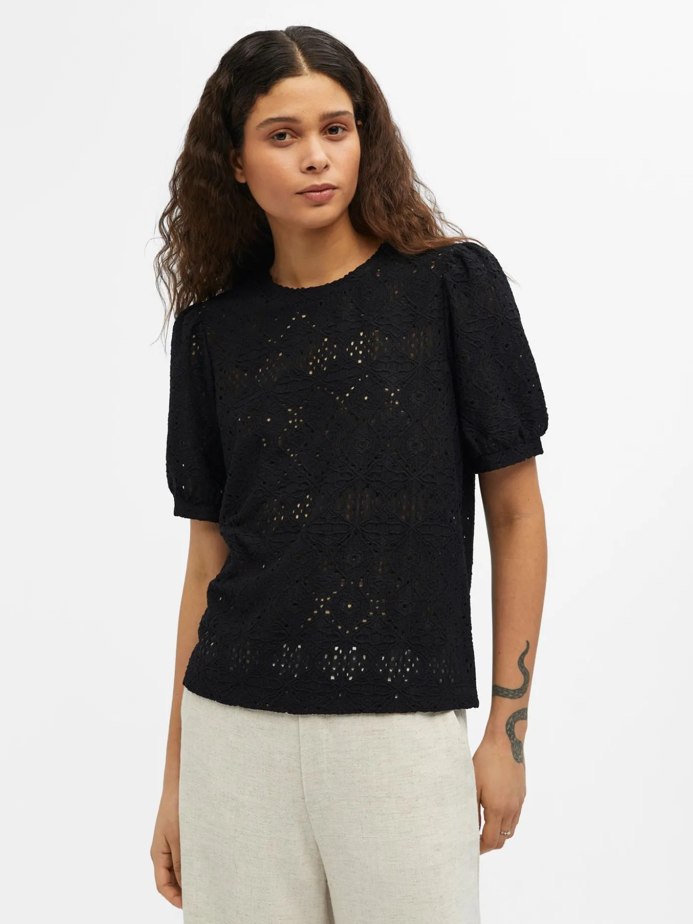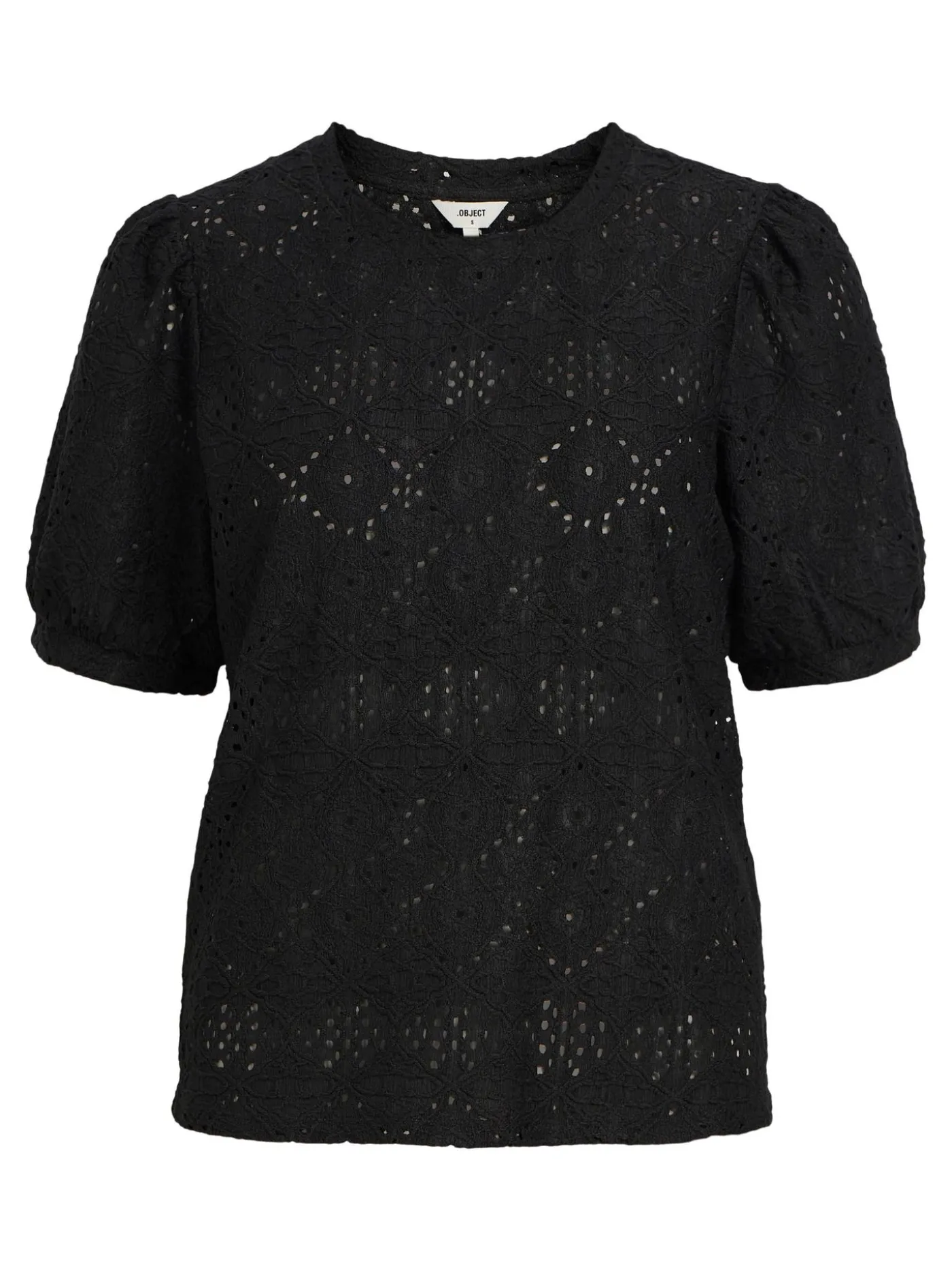 Zwart broderie T-shirt van het merk Object met een all-over motiefje. Het shirt heeft korte pofmouwtjes en ronde halslijn. Verkrijgbaar in verschillende kleuren.