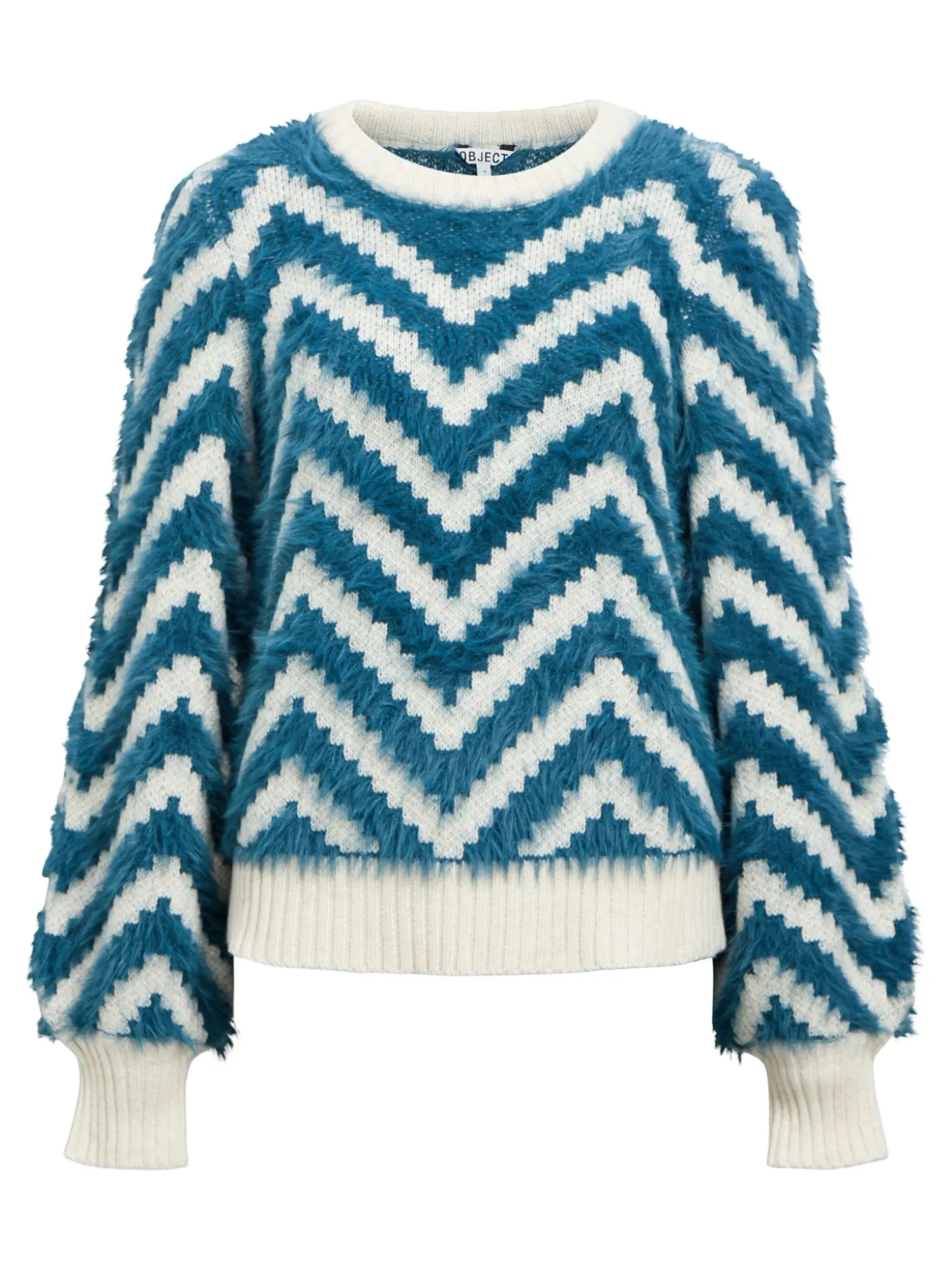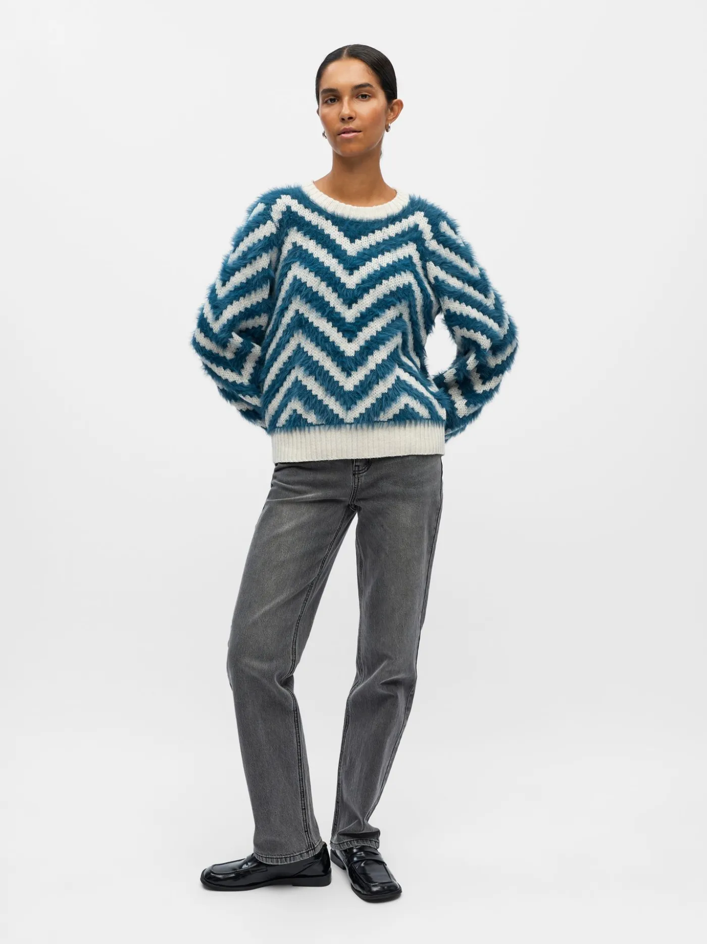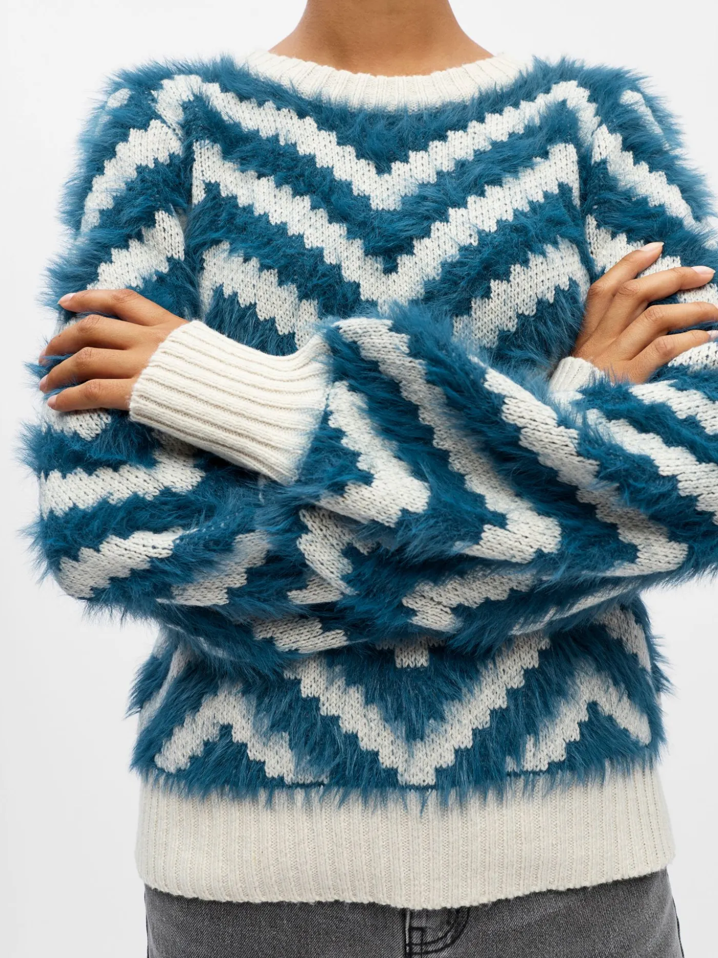 Geef je wintergarderobe een stijlvolle upgrade met deze opvallende gebreide trui van OBJECT. De trui is ontworpen met een speels en modern chevronpatroon in crème en diep petrolblauw, waarbij de combinatie van het gebreide en zachte, pluizige textuur zorgt voor een unieke en luxe uitstraling.De trui heeft een ontspannen pasvorm, terwijl de brede ribboorden aan de mouwen en zoom zorgen voor een mooie vorm en een goede aansluiting. Dankzij het warme, zachte materiaal is deze trui ideaal voor koude dagen.