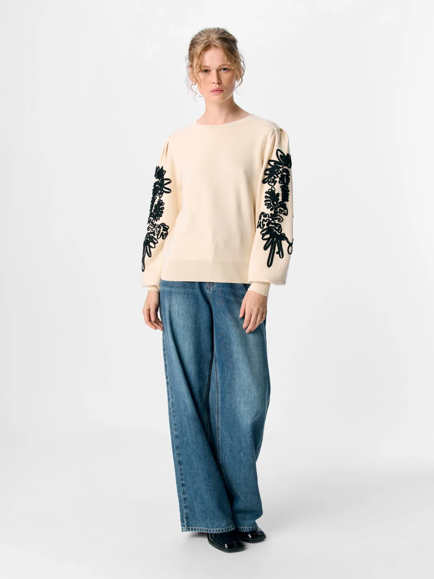 Deze beige sweater is de perfecte mix van comfort en stijl. De zachte stof zorgt voor een prettig draagcomfort, terwijl het opvallende bloemenborduursel op de mouwen de trui een bijzondere en vrouwelijke uitstraling geeft. De ballonmouwen voegen extra flair toe aan het ontwerp, waardoor deze trui ideaal is voor een casual maar toch chique look. Een must-have voor een trendy outfit, die je zowel overdag als ’s avonds kunt dragen.