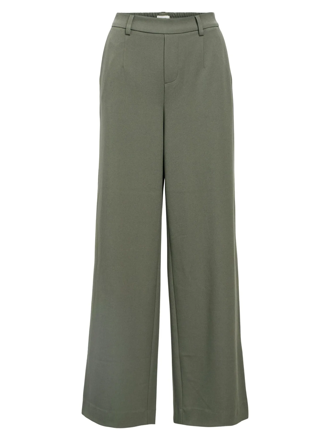 Deze stijlvolle wide-leg pantalon in een elegante legergroene kleur is een tijdloos item dat moeiteloos comfort en klasse combineert. De hoge taille en wijde pijpen zorgen voor een flatterend silhouet. De pantalon is gemaakt van een soepelvallende, lichtgewicht stof die prettig aanvoelt en elegant meebeweegt.De pantalon heeft een elastische tailleband en bevat riemlussen. Aan de voorkant heeft de pantalon twee steekzakken en aan de anderkant twee sierzakken. De pantalon is perfect te combineren met een top of blazer voor een zakelijke look, of met een casual top voor een relaxte, stijlvolle outfit.