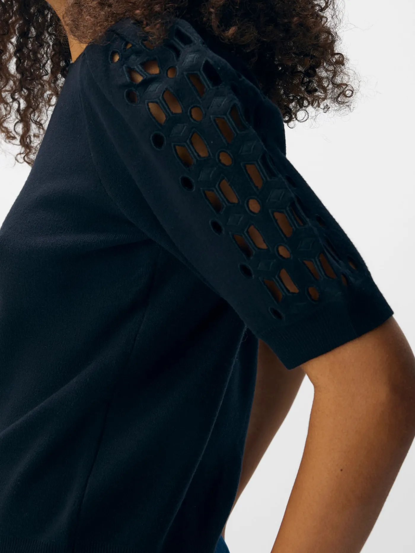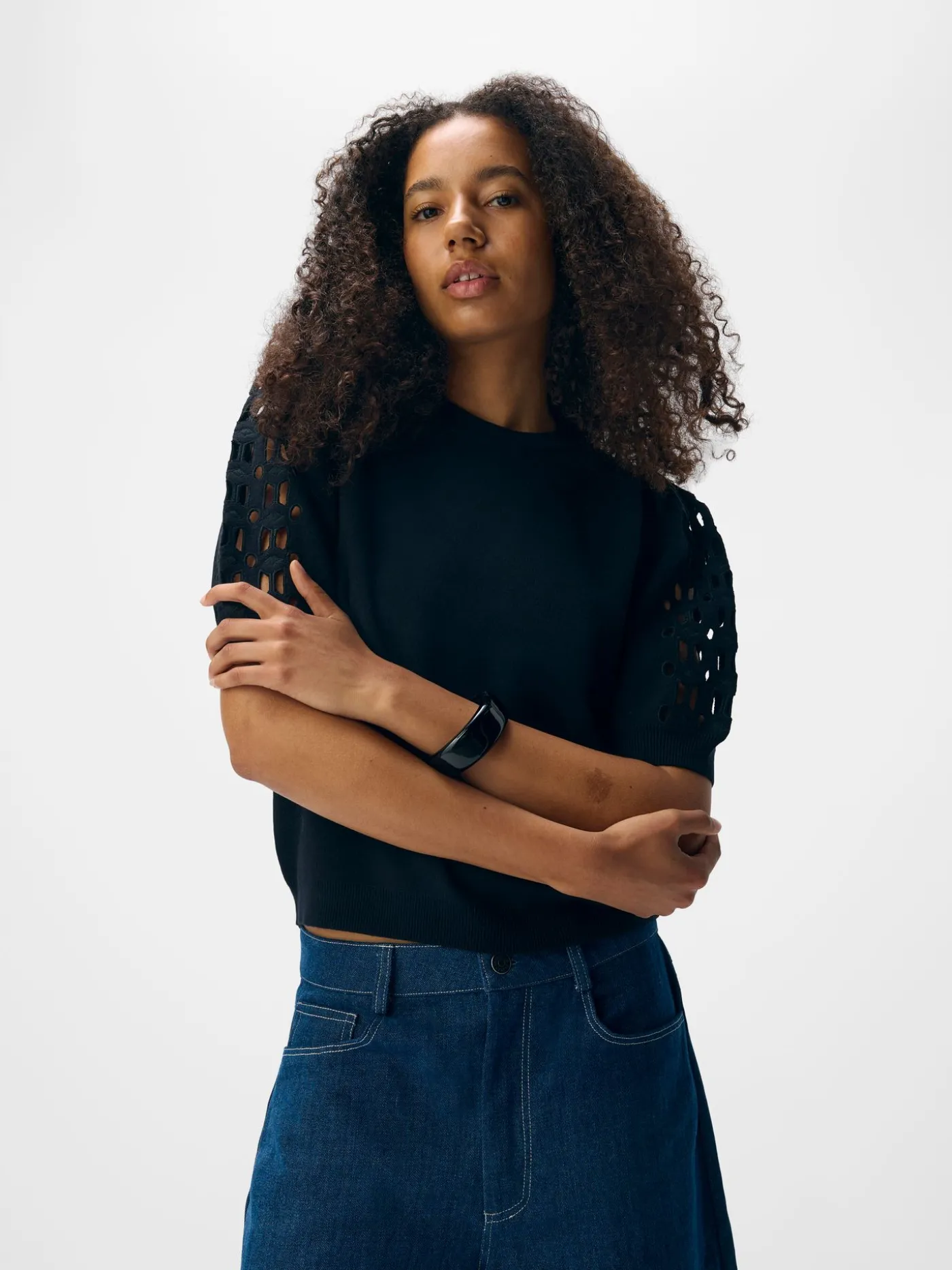 Deze zwarte gebreide top is een perfecte mix van stijl en comfort. De korte ballonmouwen met opengewerkte details geven een speelse twist aan het minimalistische ontwerp. Dankzij de zachte stof en de tijdloze ronde hals is deze top moeiteloos te stylen, van casual tot chic.