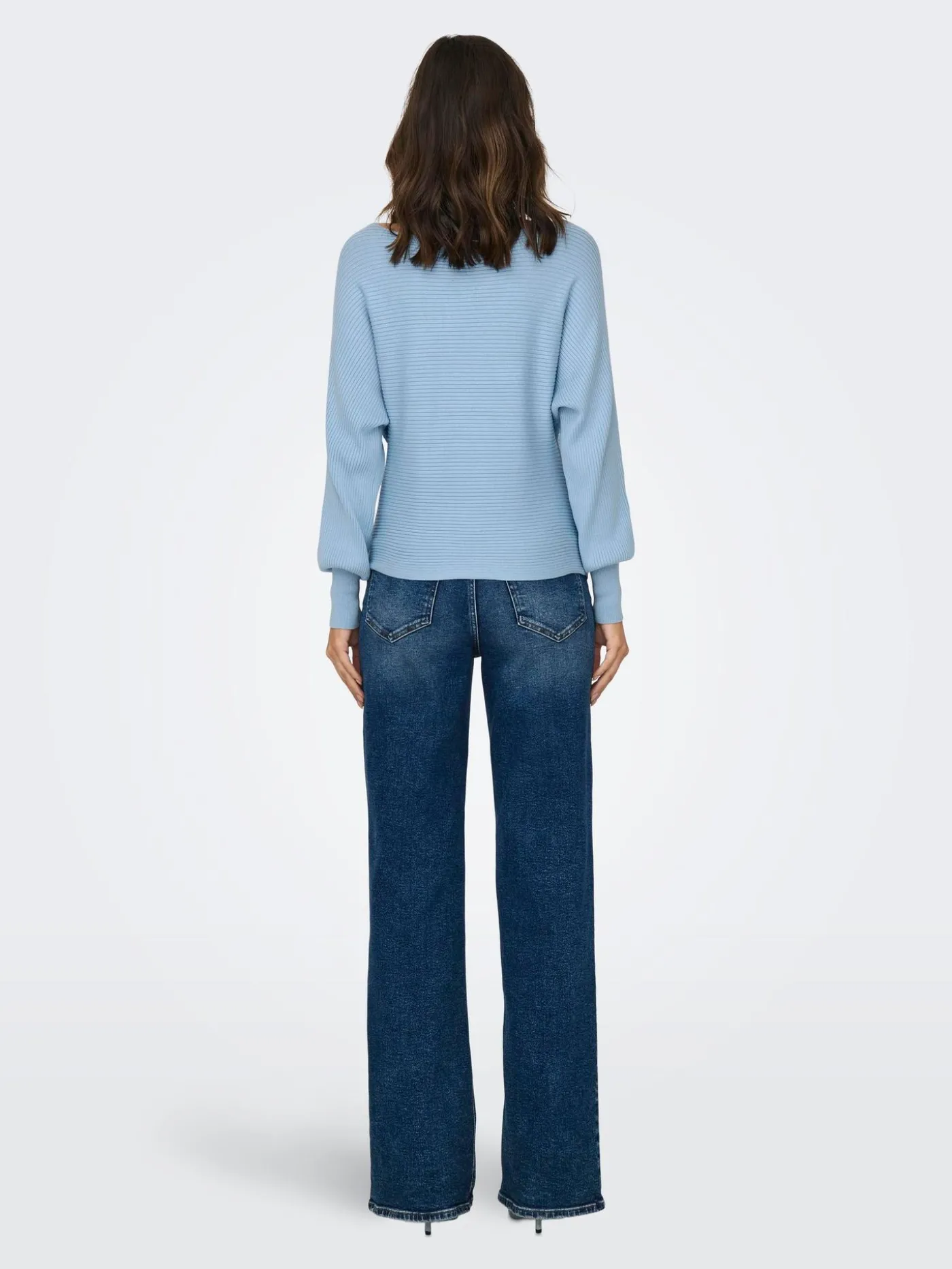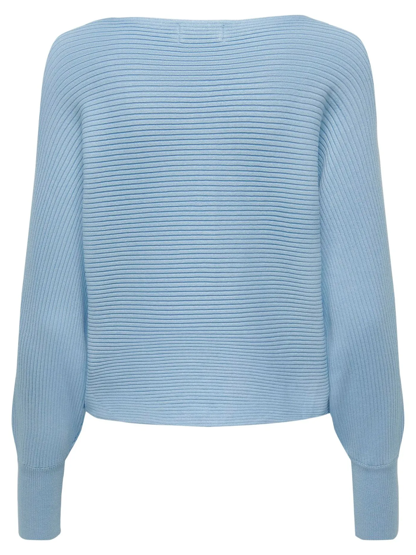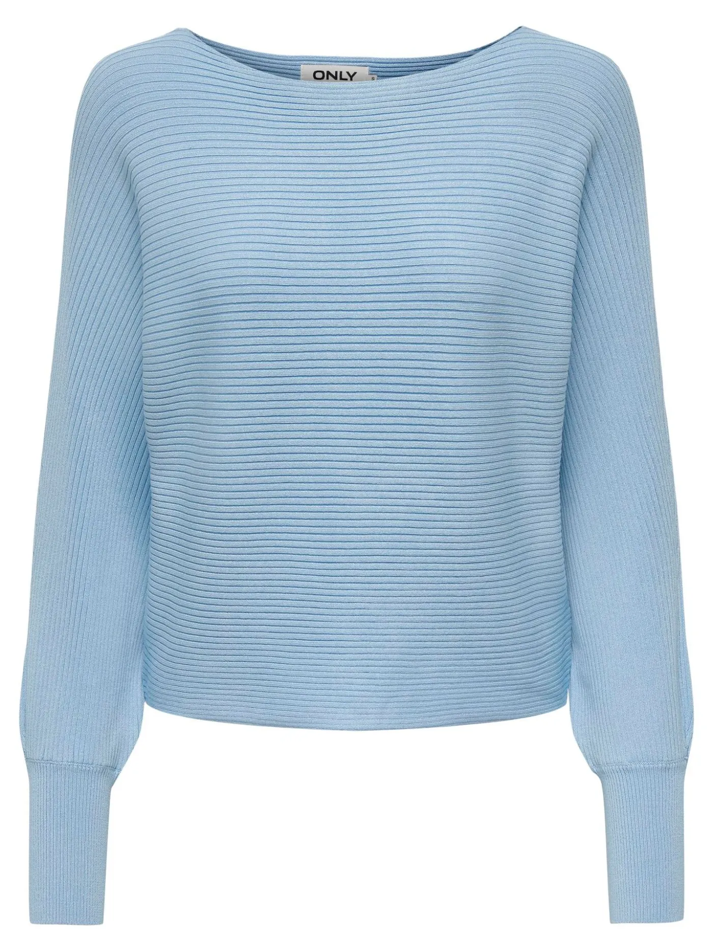 Lichtblauwe fijn gebreide trui met geribde structuur van het merk ONLY. De trui heeft een brede boothals en ballonmouwen. Deze ideale basic is verkrijgbaar in meerdere kleuren en makkelijk te combineren met verschillende items.