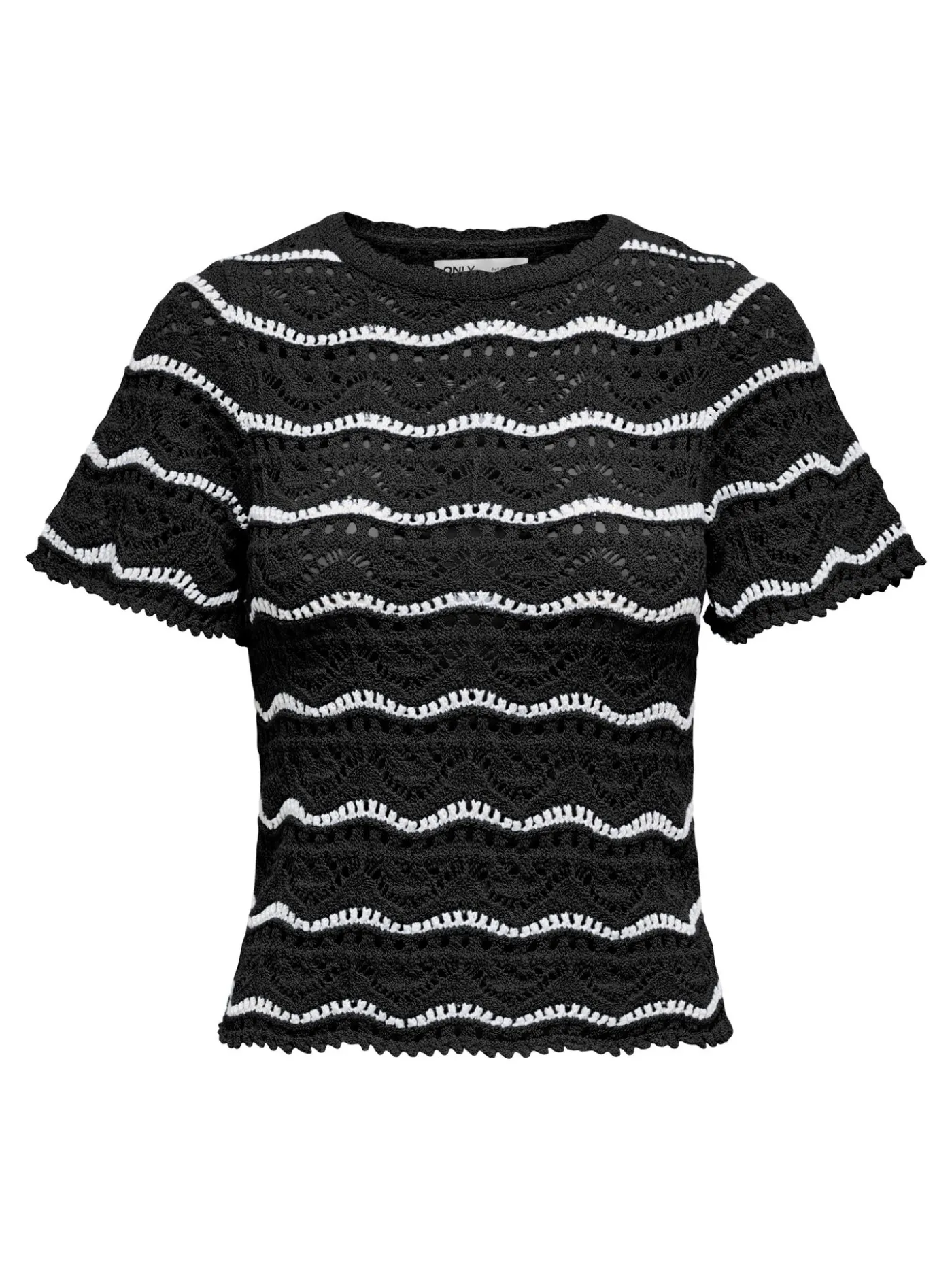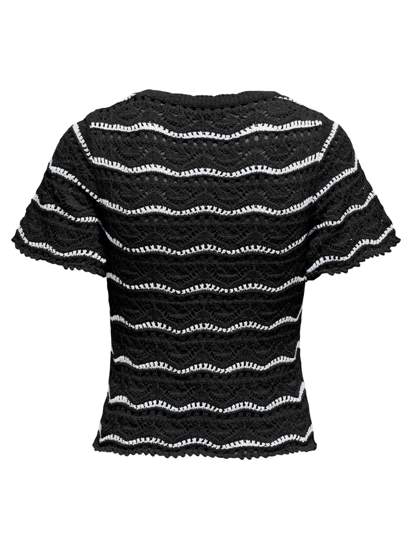 Dit gehaakte topje van Only is een echte essential voor komende zomer. De top is zwart van kleur en heeft een witte streep. Ook heeft de top korte mouwen en een ronde hals. Je kunt deze top goed combineren met een zwarte of witte pantalon en een sneaker of voor een chique look een loafer.