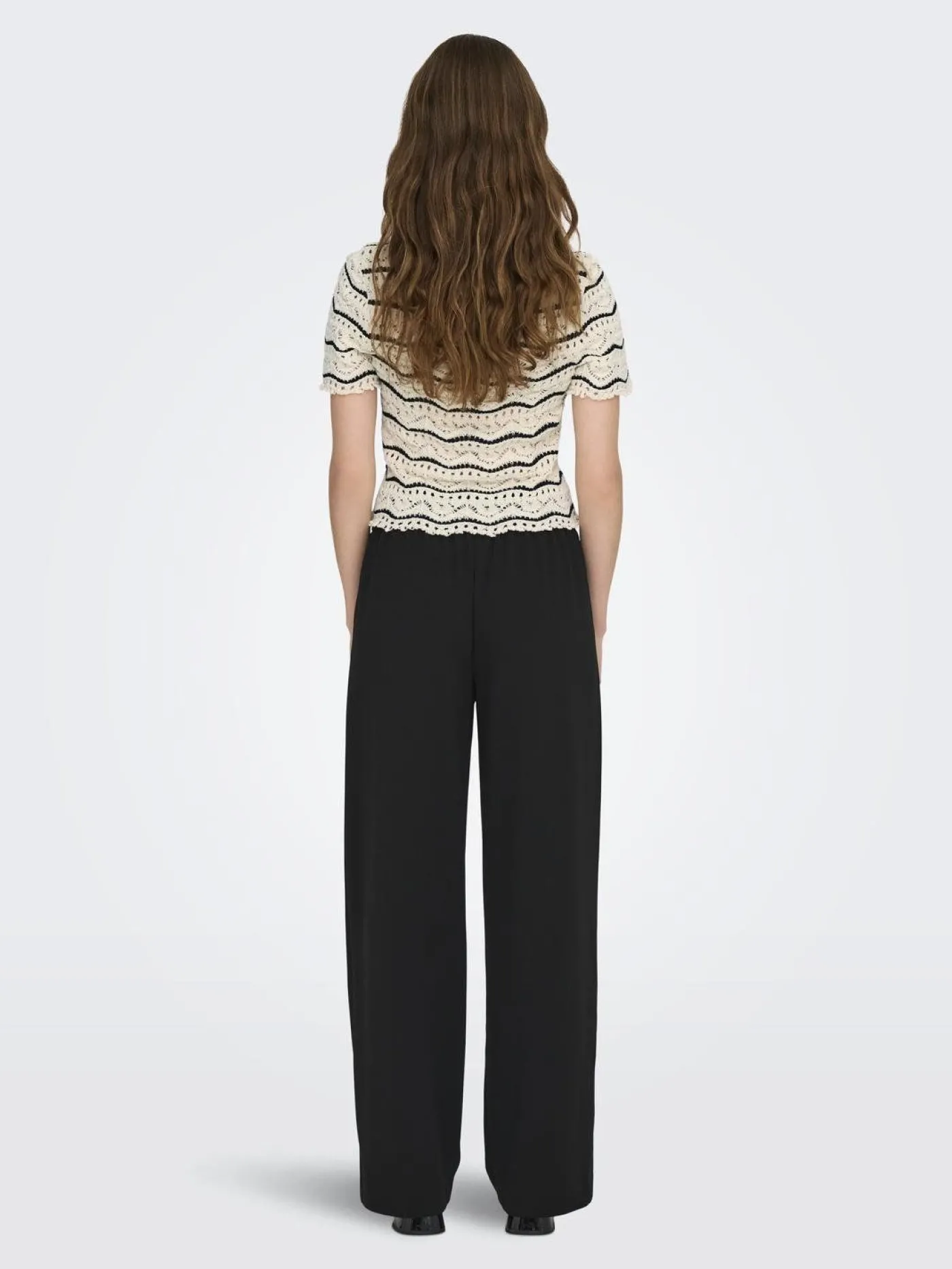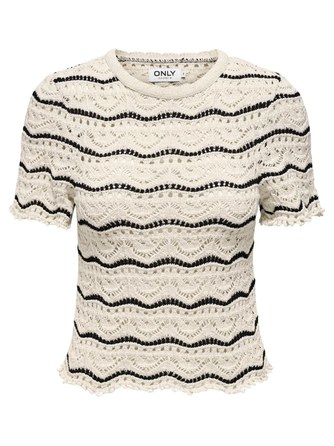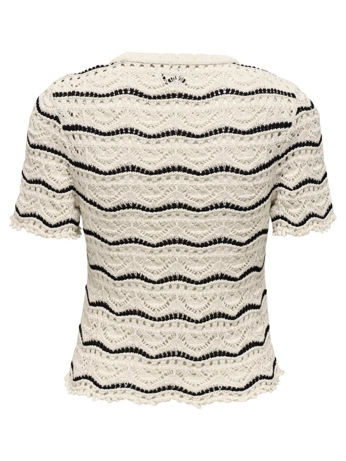 Beige top met opengewerkt motief en streeppatroon. Dit item heeft korte mouwen, een ronde hals en rafeltjes aan de onderzijde. Een heerlijke luchtige top welke je eindeloos kan combineren met diverse items.